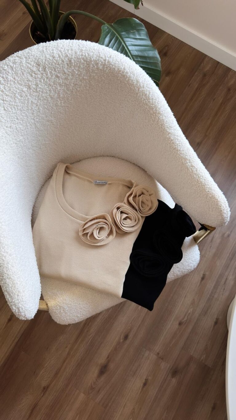T-shirt z prążkowanej tkaniny z kwiatami 3D