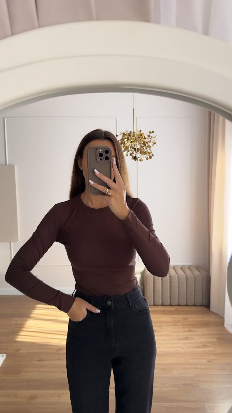 T-shirt Basic z Długim Rękawem Czekoladowy