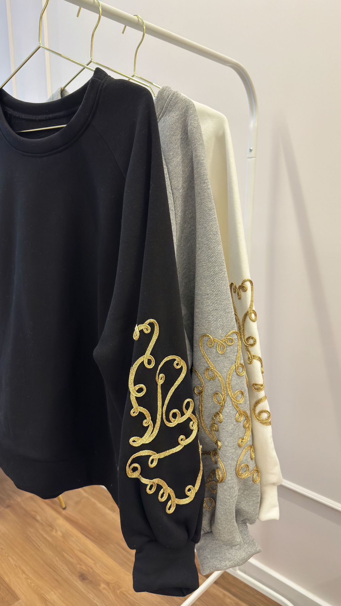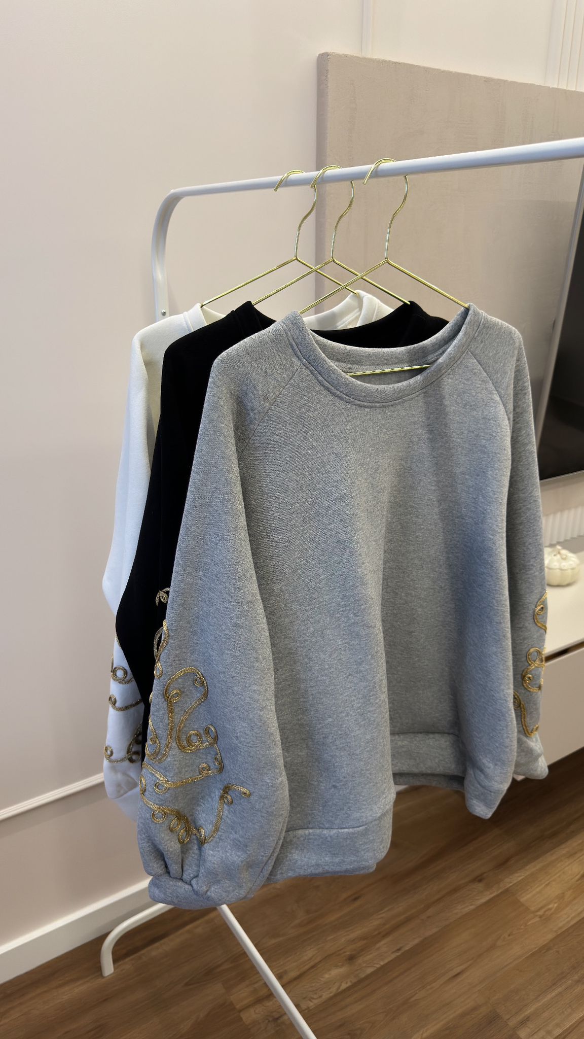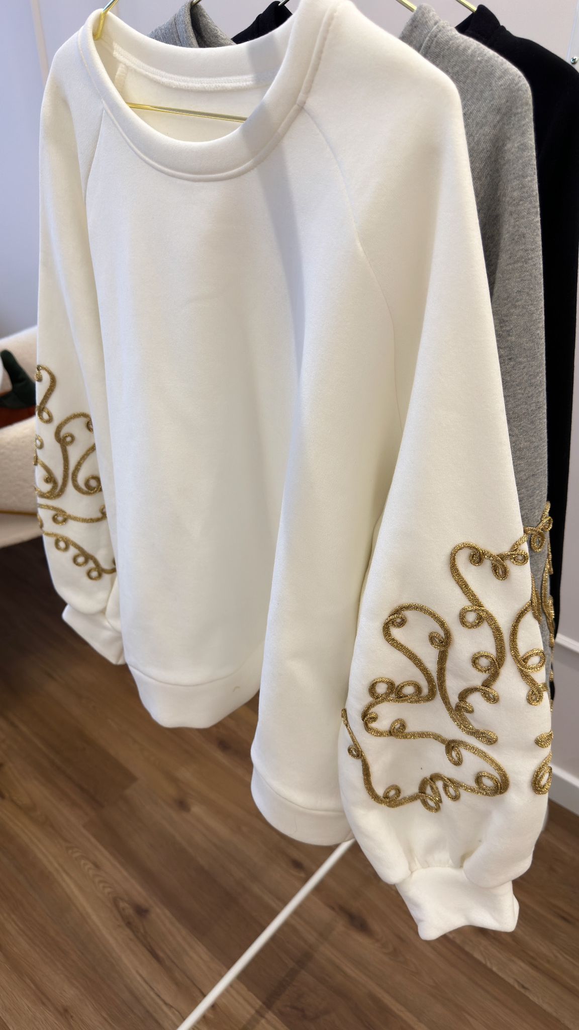 Bawełniana bluza z okrągłym dekoltem ze ściągaczami. Długie rękawy z obniżoną linią ramion. Złota aplikacja na rękawach. Krój oversize. Od wewnątrz ocieplana.