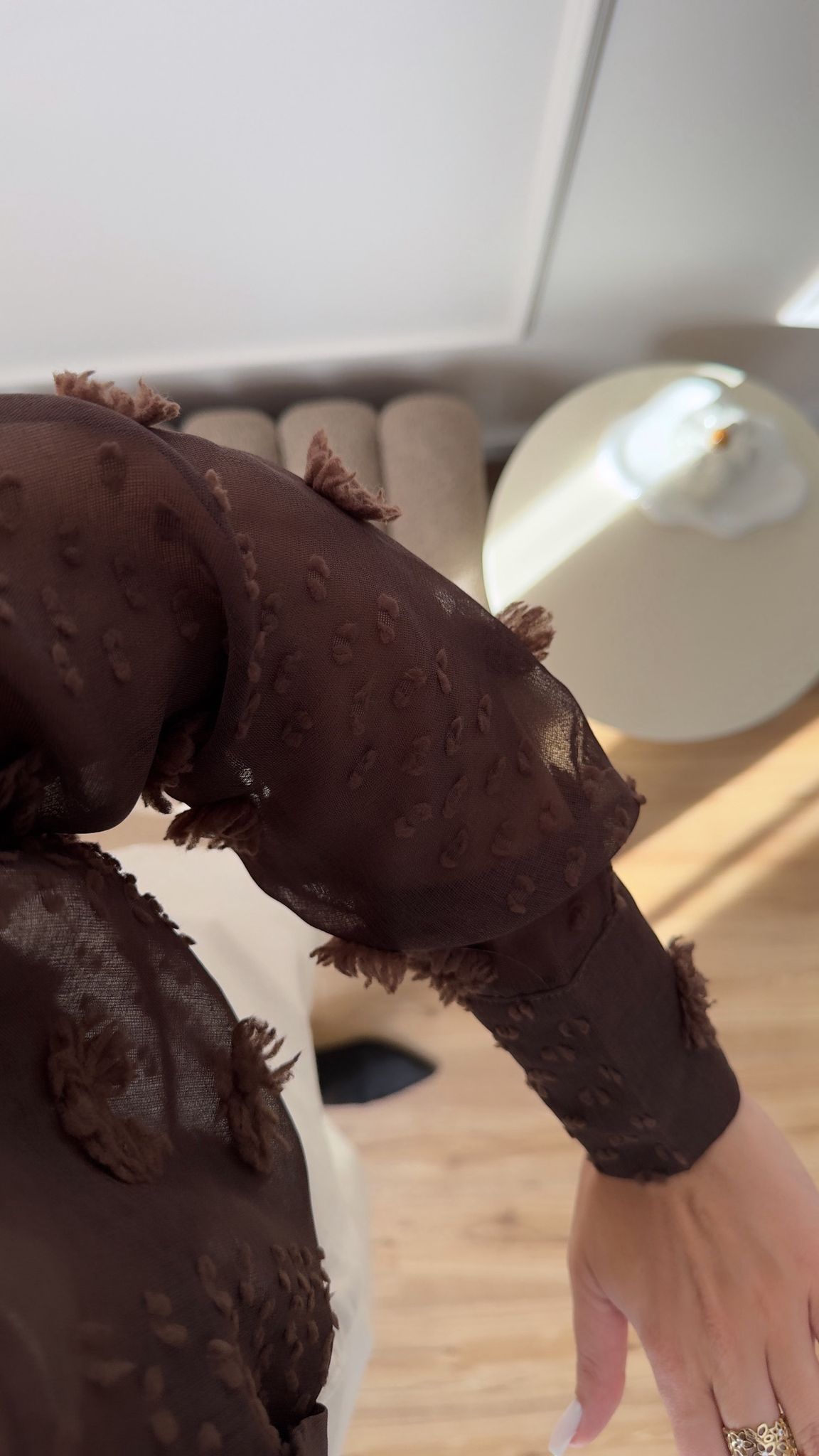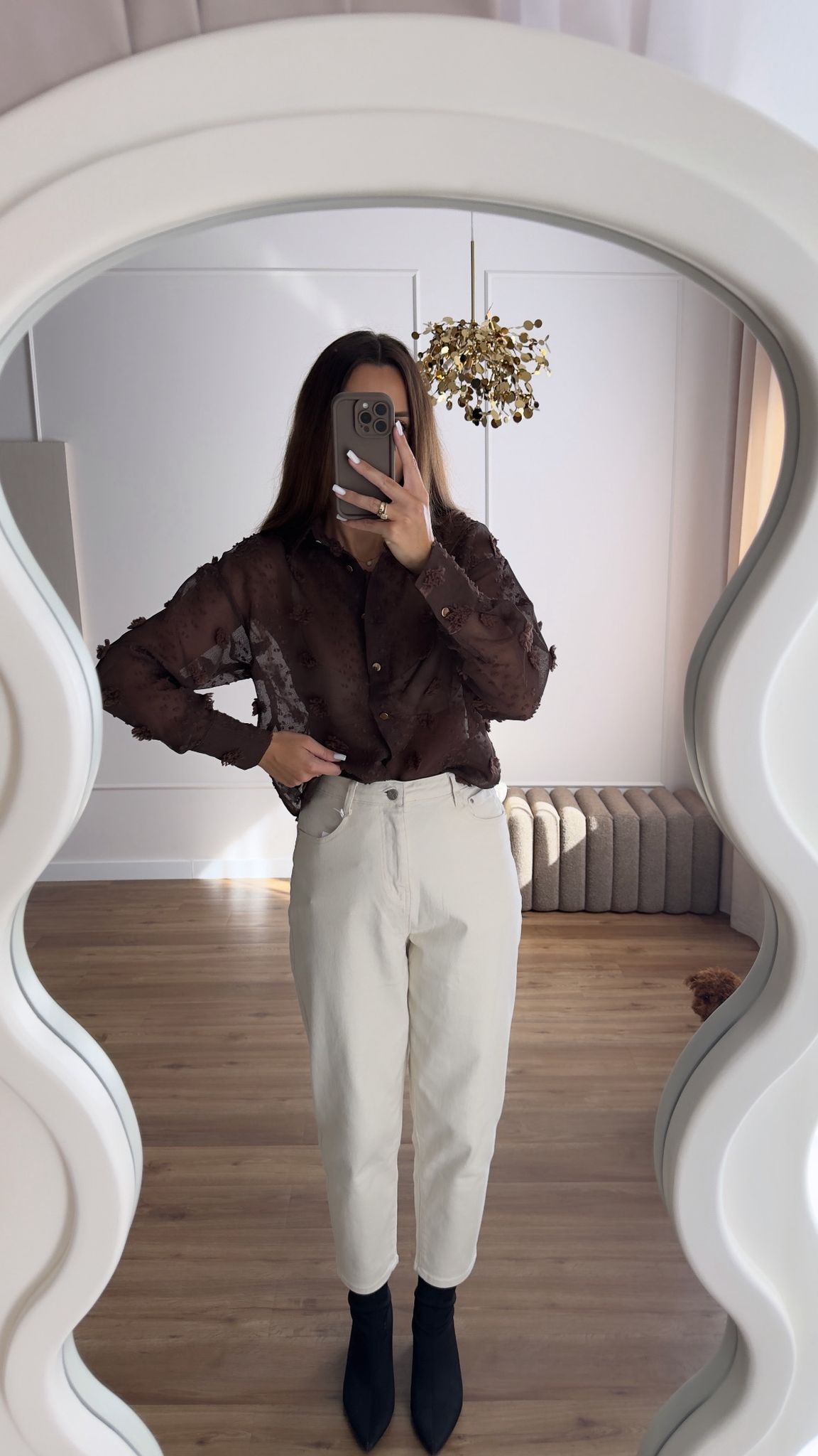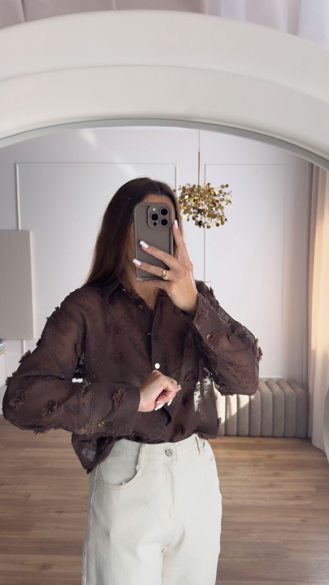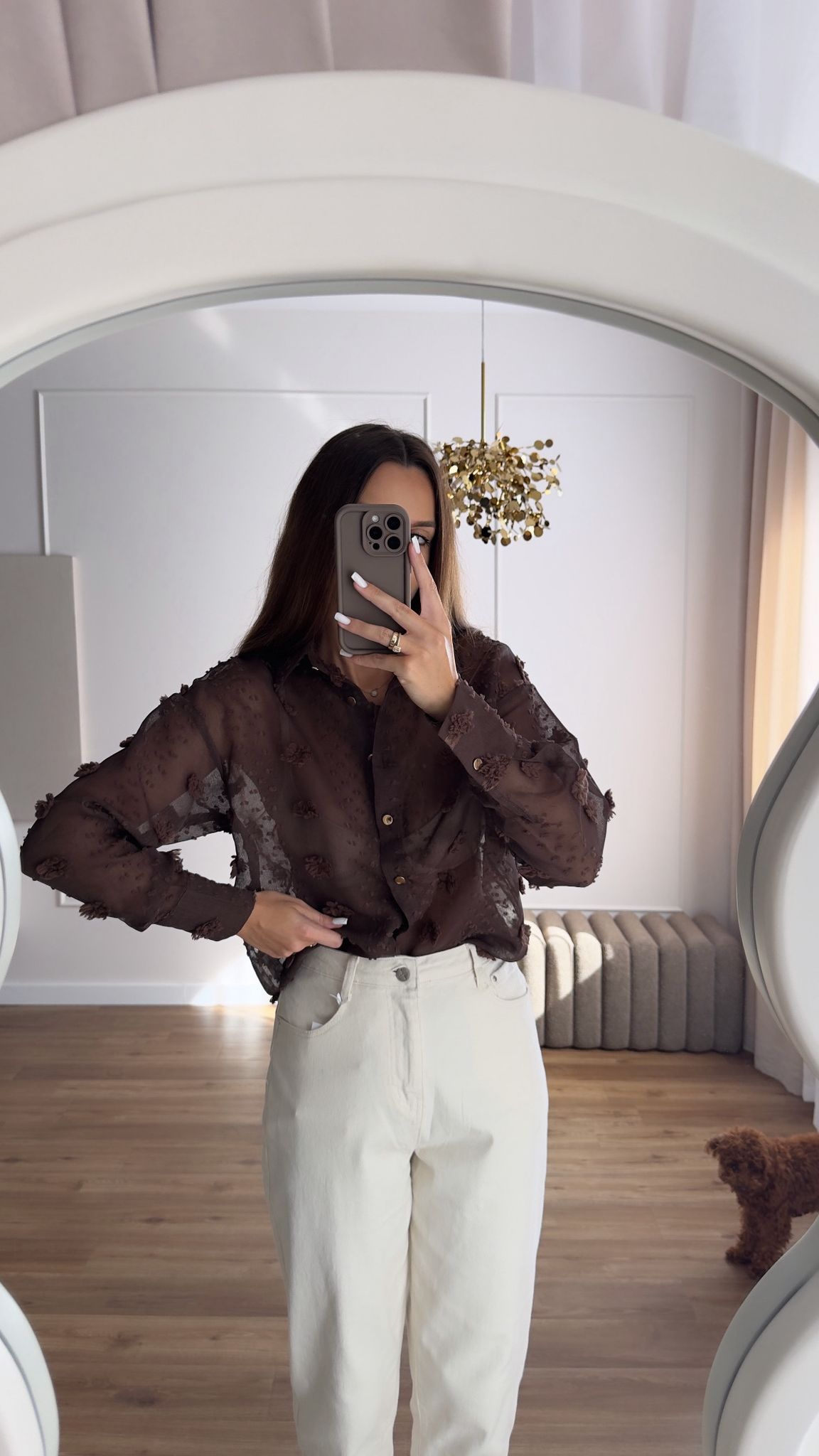 Koszula z kołnierzykiem w czekoladowym kolorze, zapinana na złote, ozdobne guziki. Koszulę zdobią aplikacje 3D w tym samym kolorze. Idealna do klasycznych spodni oraz jeansów. Dla pobicia efektu aplikacji pod koszulę można założyć top w brązowym kolorze.