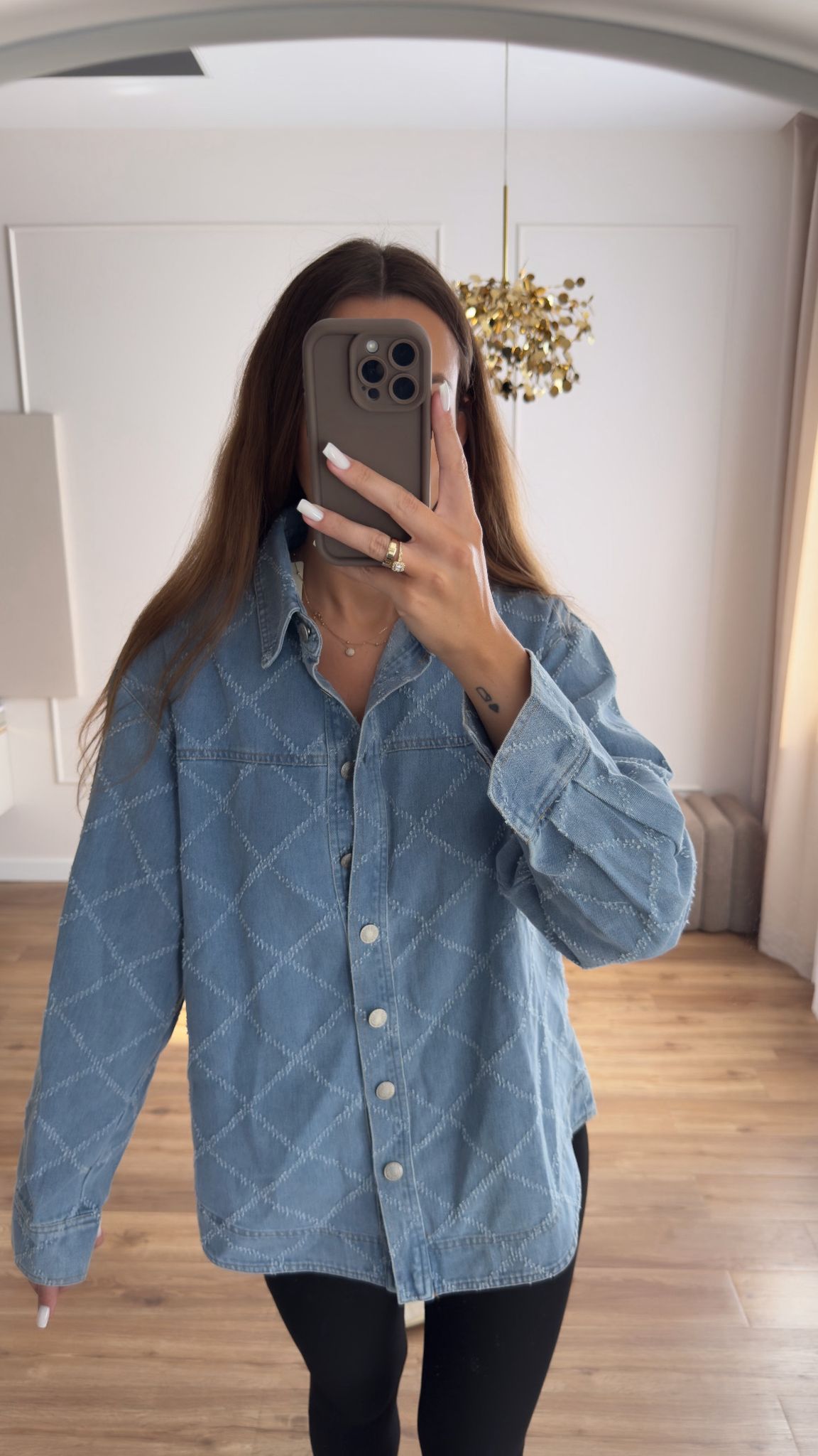 Koszula jeansowa z kołnierzykiem, zapinana na srebrne guziki. Koszulę zdoi geometryczne aplikacja dodająca jej charakteru. Idealna do legginsów, spódniczki. Sprawdzi się również jako narzutka na t-shirt.