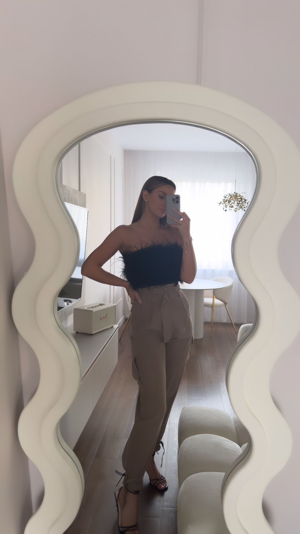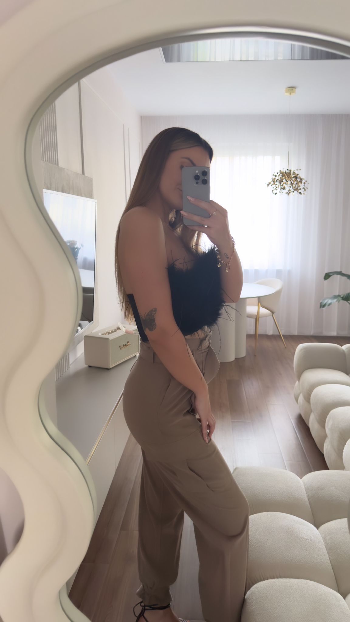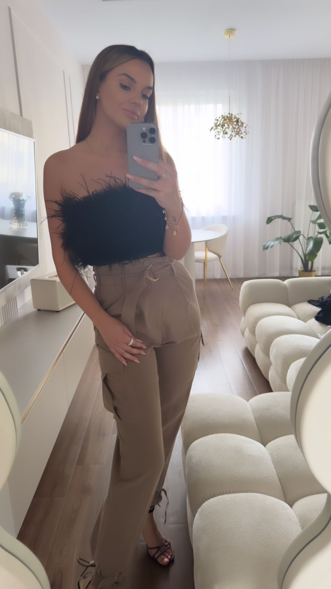 Spodnie z wysokim stanem z paskiem i zakładkami w pasie. Kieszenie z przodu. Kieszenie po bokach z klapkami. Zapięcie na suwak i guzik z przodu. Regulacja szerokości przy mankietach nogawek.