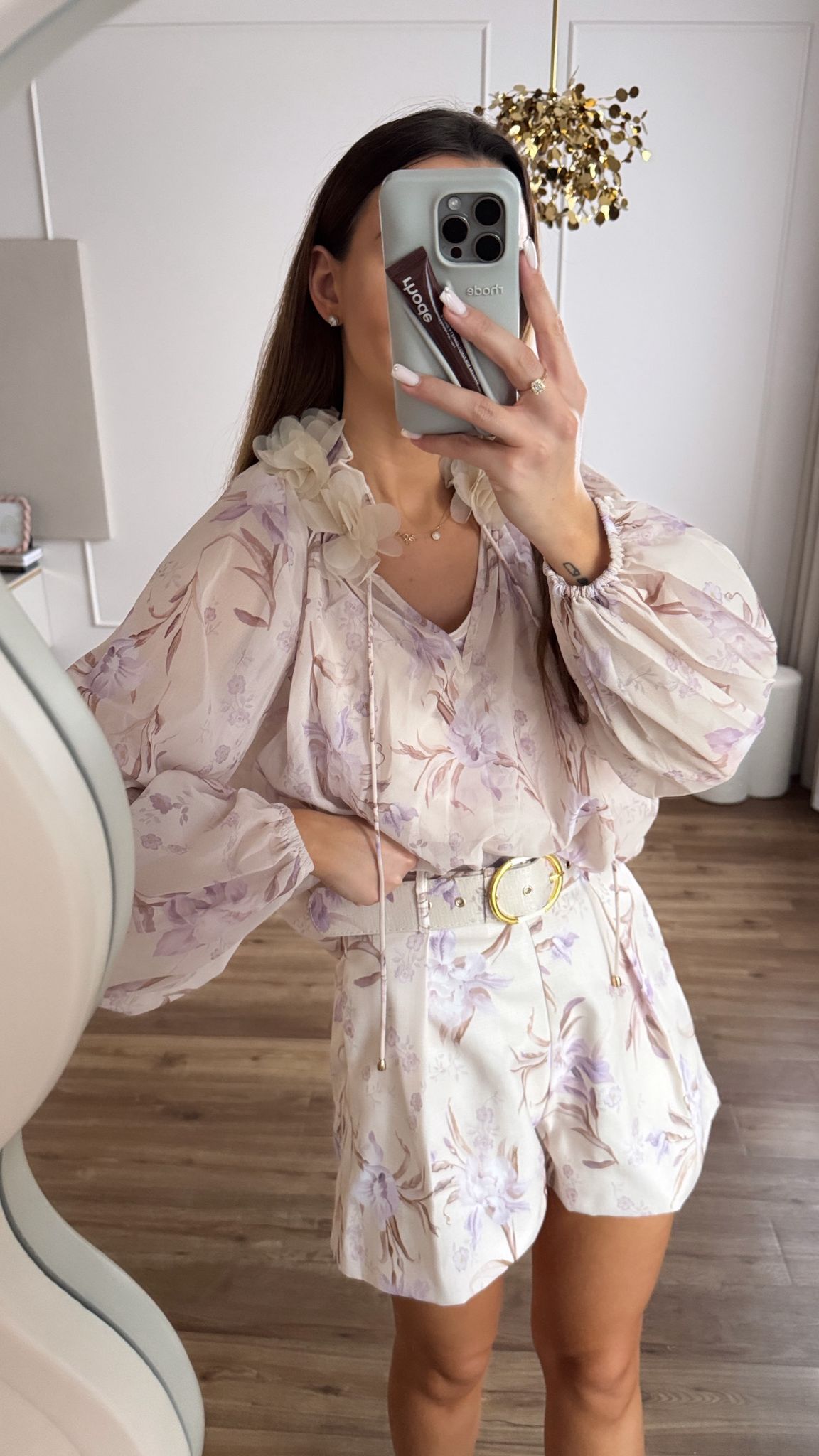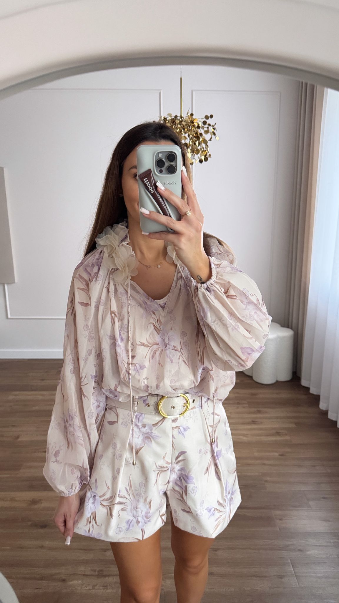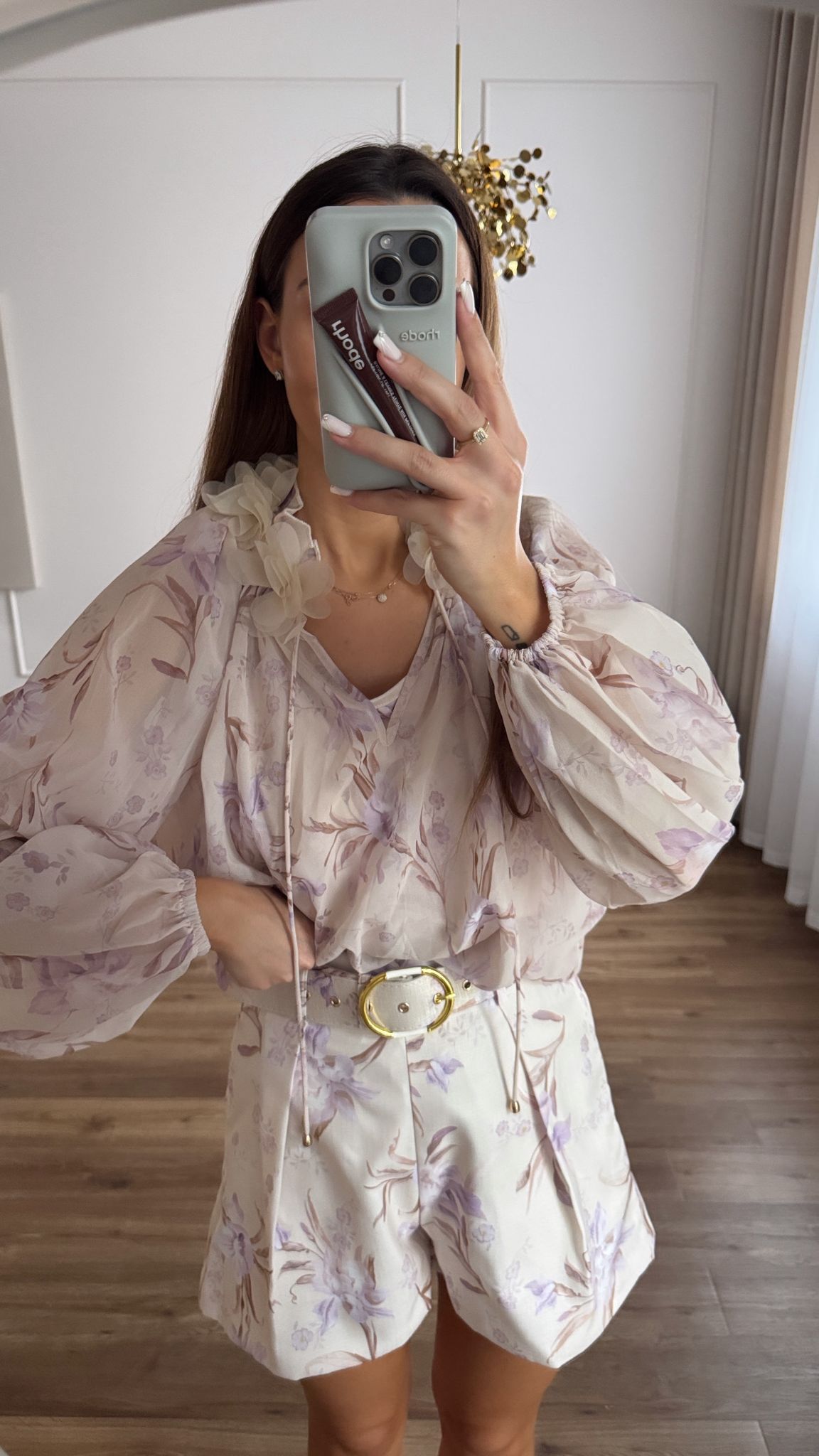 Komplet damski: eleganckie spodenki z paskiem + shirt + koszula mgiełka w kwiaty