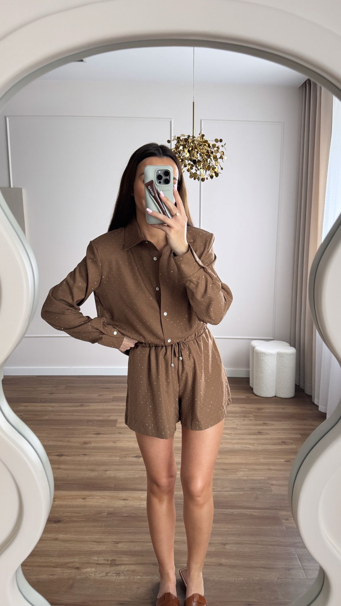 Olśniewający komplet z koszulą i szortami to idealna propozycja dla kobiet, które lubią błyszczeć. Wykonany z wysokiej jakości materiału, zapewnia komfort noszenia, a subtelne kryształki dodają mu luksusowego charakteru. Koszula o klasycznym kroju z eleganckim kołnierzykiem pięknie komponuje się z dopasowanymi szortami, tworząc harmonijną całość. Idealny na wieczorne wyjścia, imprezy lub wyjątkowe okazje — ten zestaw gwarantuje stylowy efekt bez wysiłku.