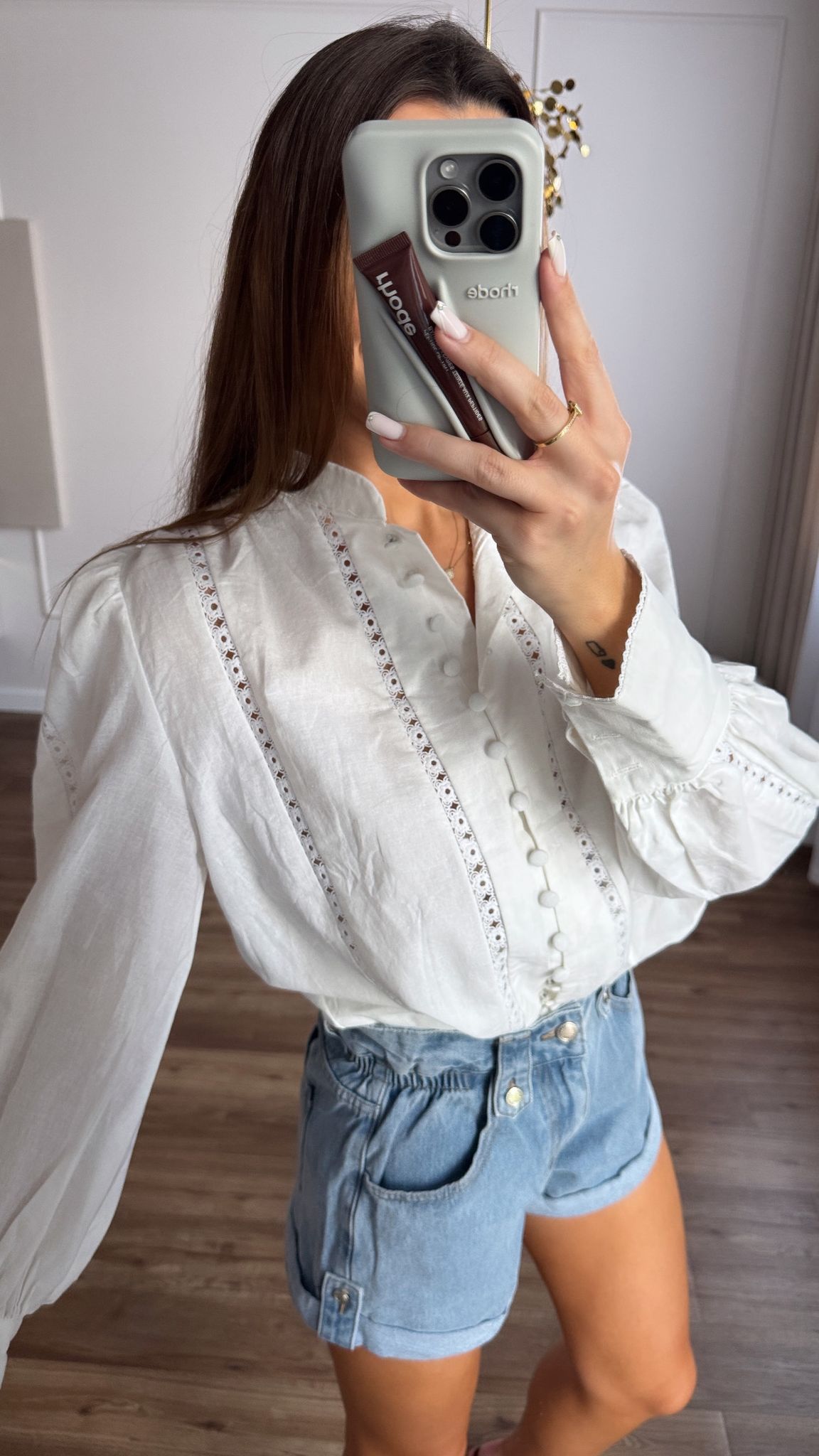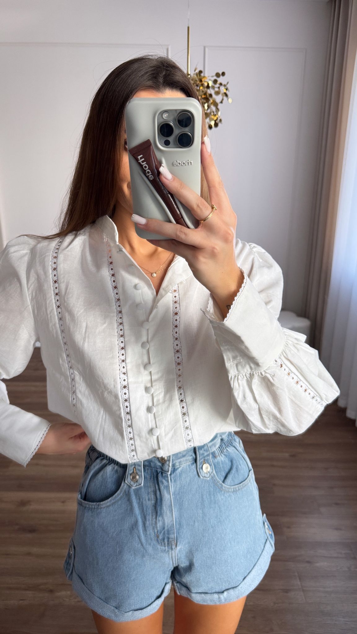 Biała Koszula Lniana z Ażurowymi Zdobieniami – Klasyczna i Stylowa