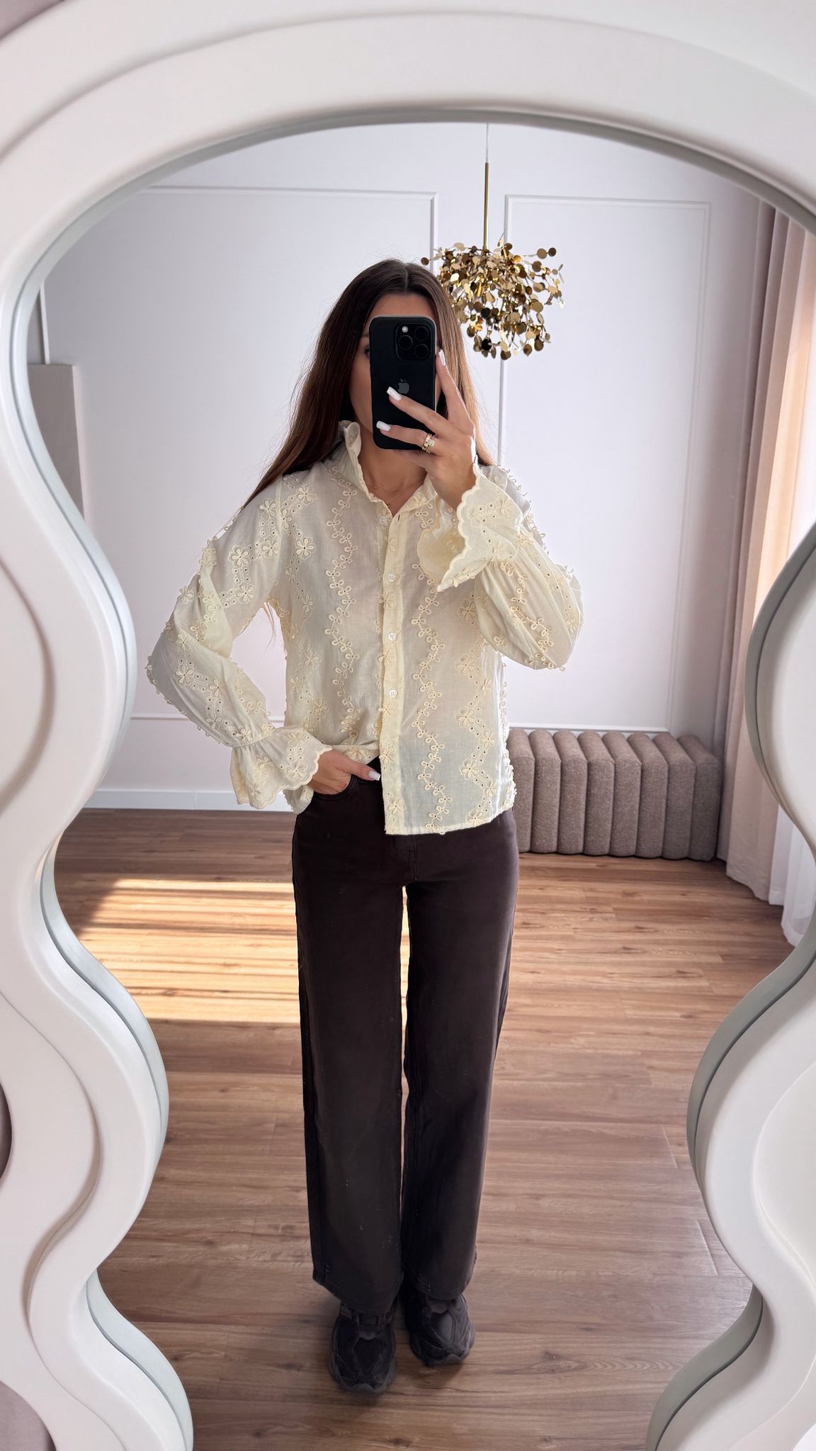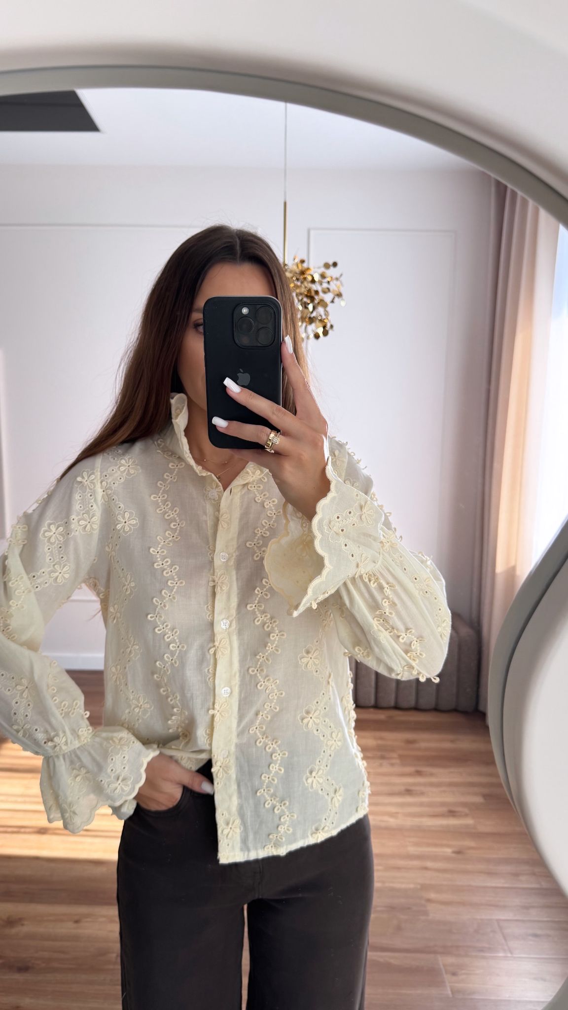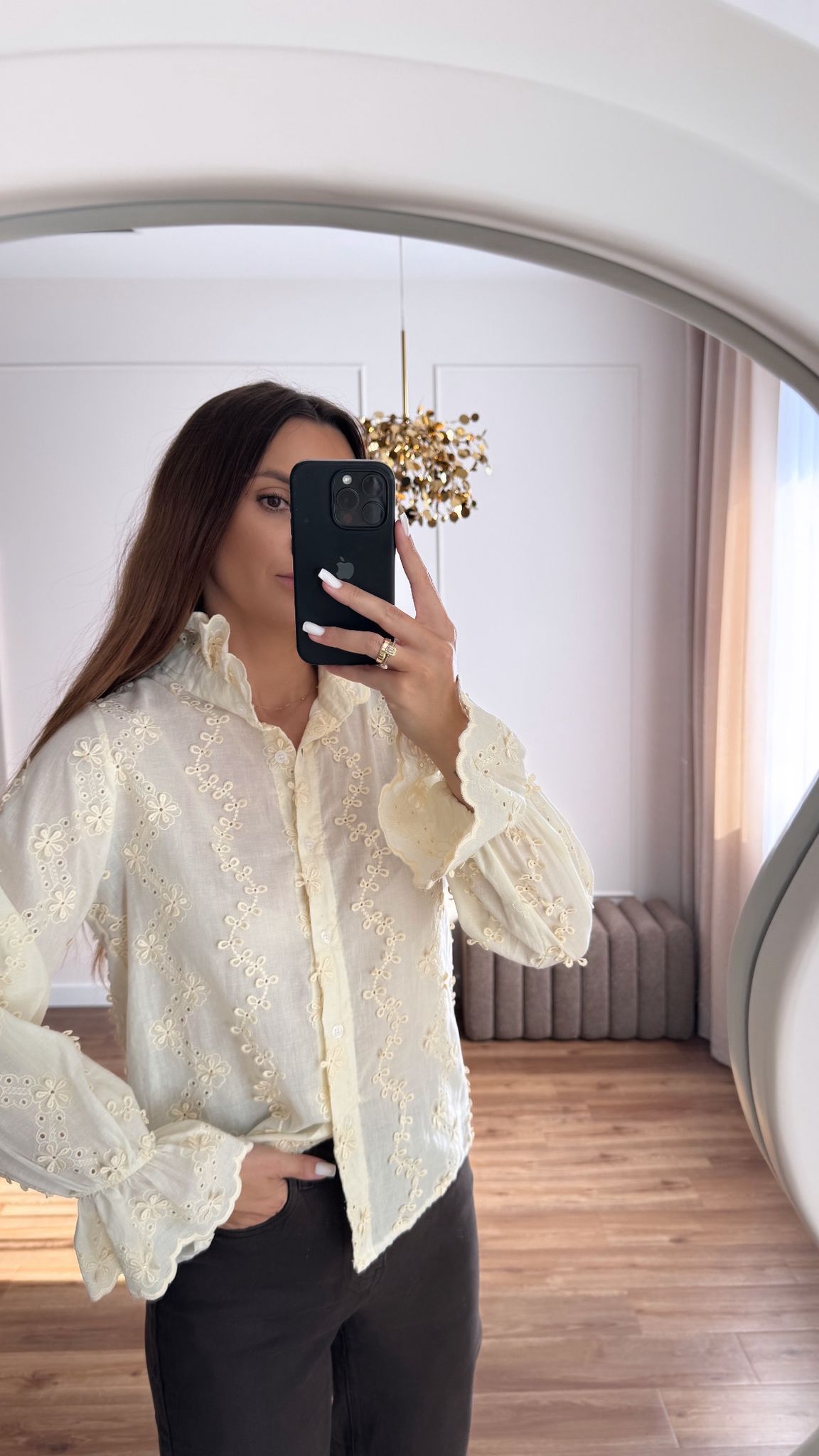 Koszula ze stójką w pięknym beżowym kolorze. Koszulę zdobi haft i marszczenia na rękawach.