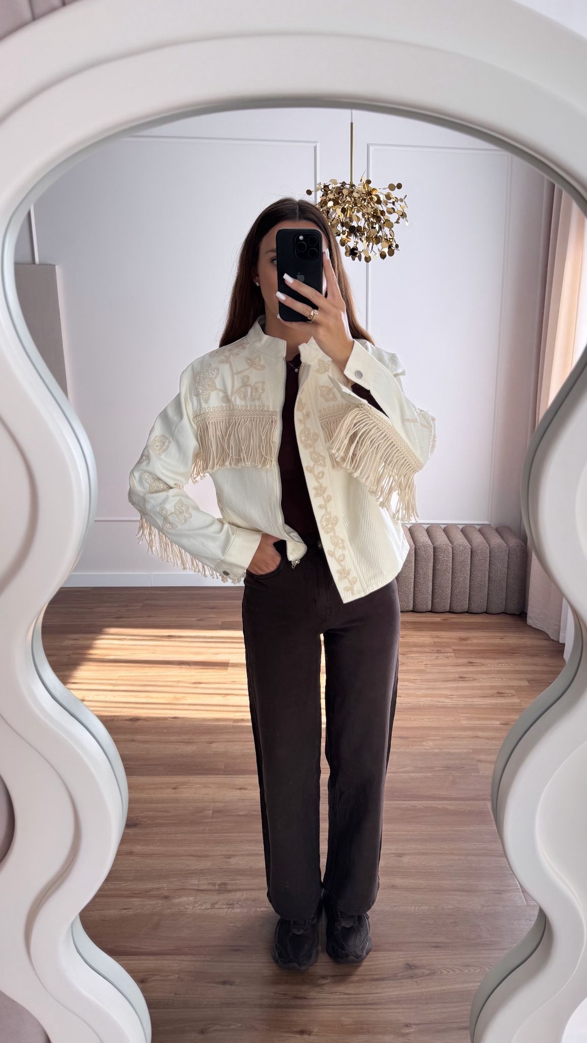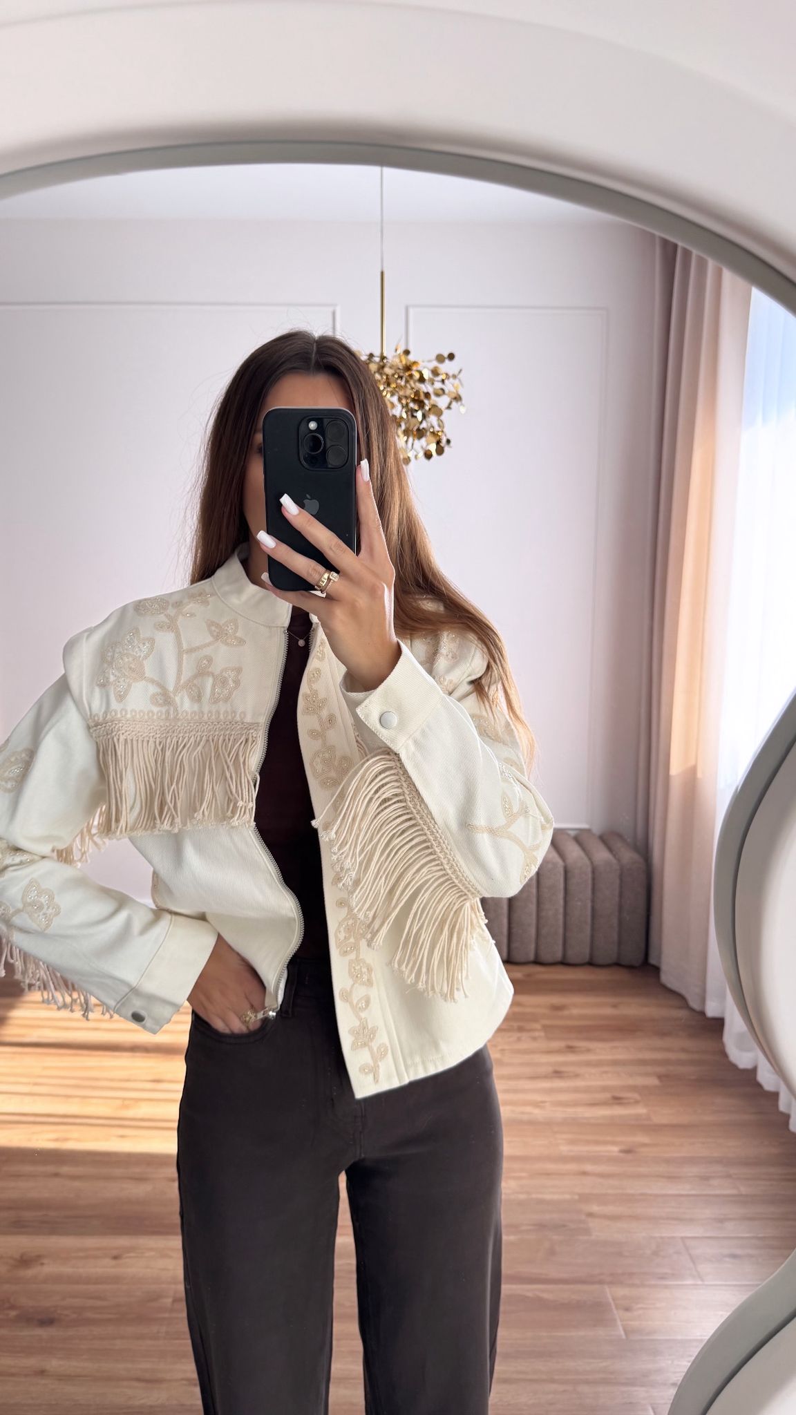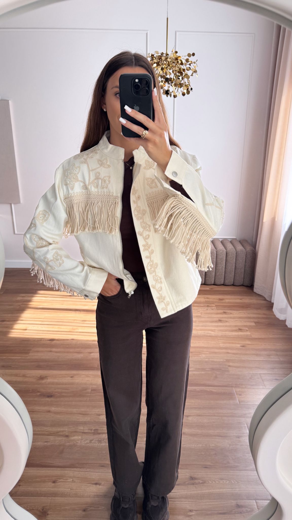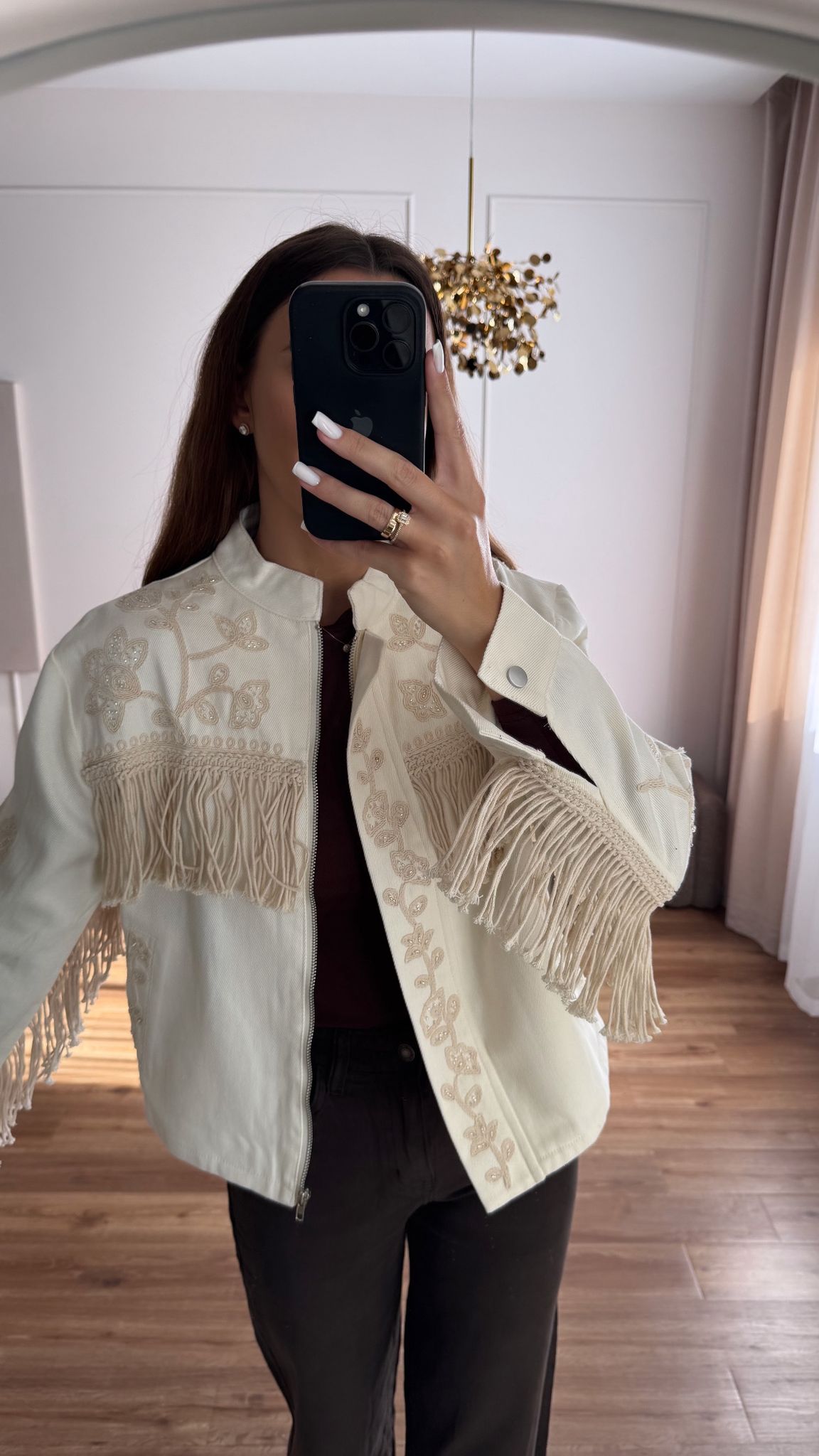 Wyjątkowa kurtka z frędzlami, haftem i błyszczącymi aplikacjami. Zapinana na ekspres.