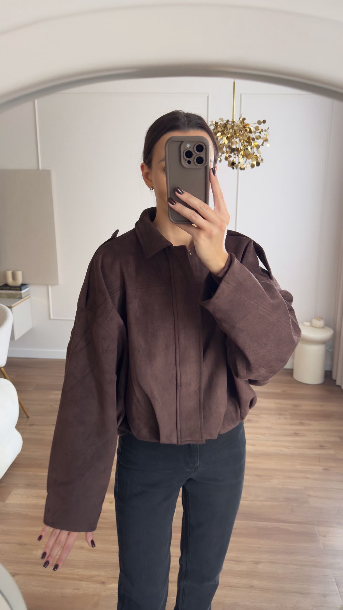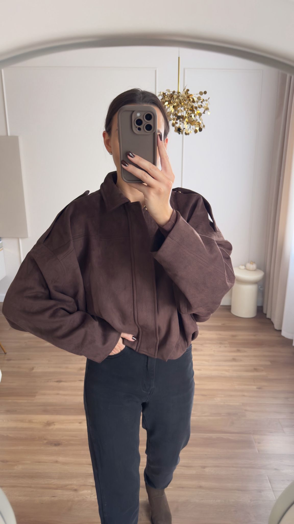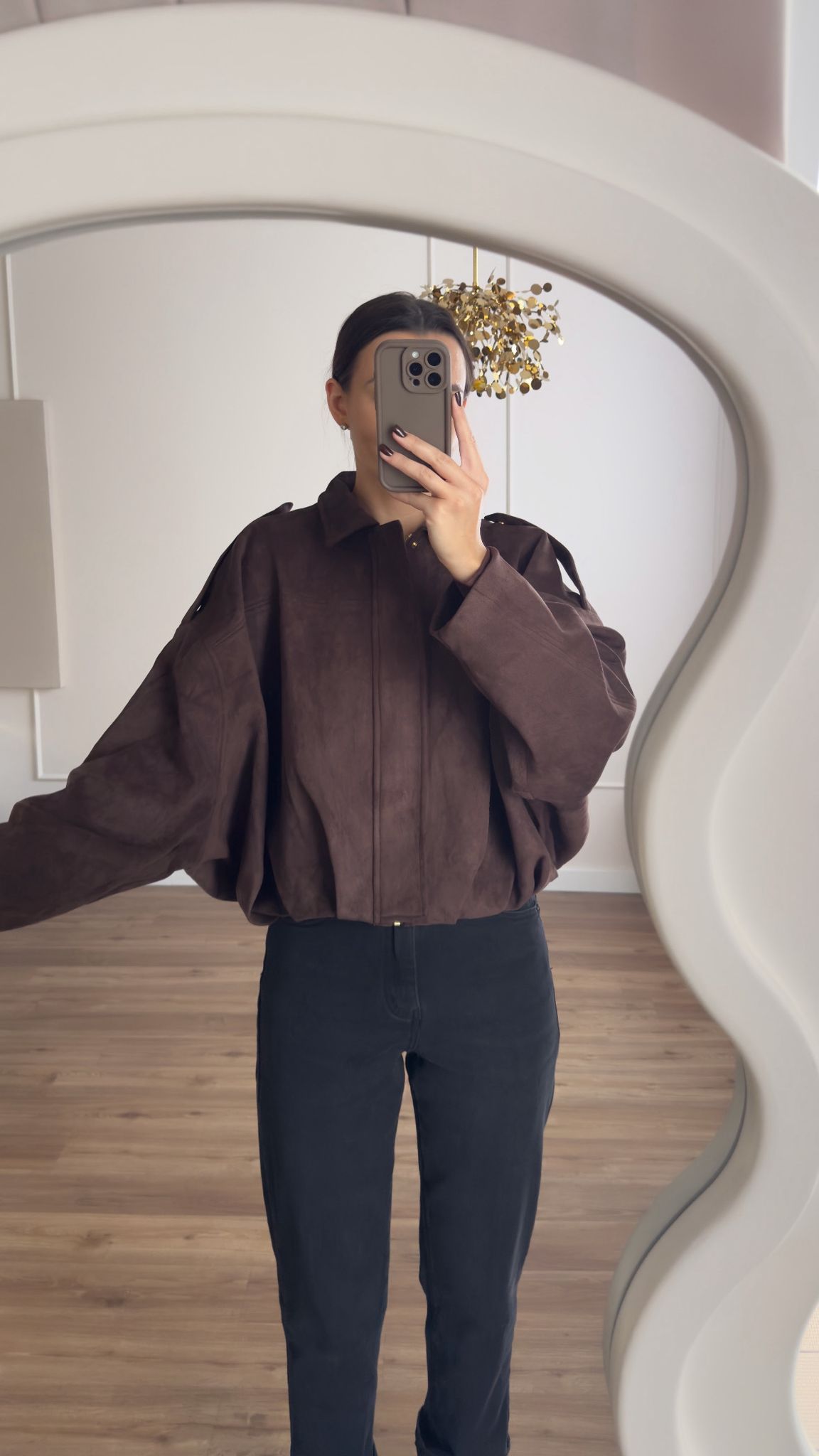 Kurtka o kroju bomberki z marszczeniem w pasie. Oversize krój, lekko opuszczona linia ramion. Materiał imitujący zamsz, ozdobne zapięcia na ramionach. Złoty suwak kryty. Idealna do spodni, ale również do sukienek.