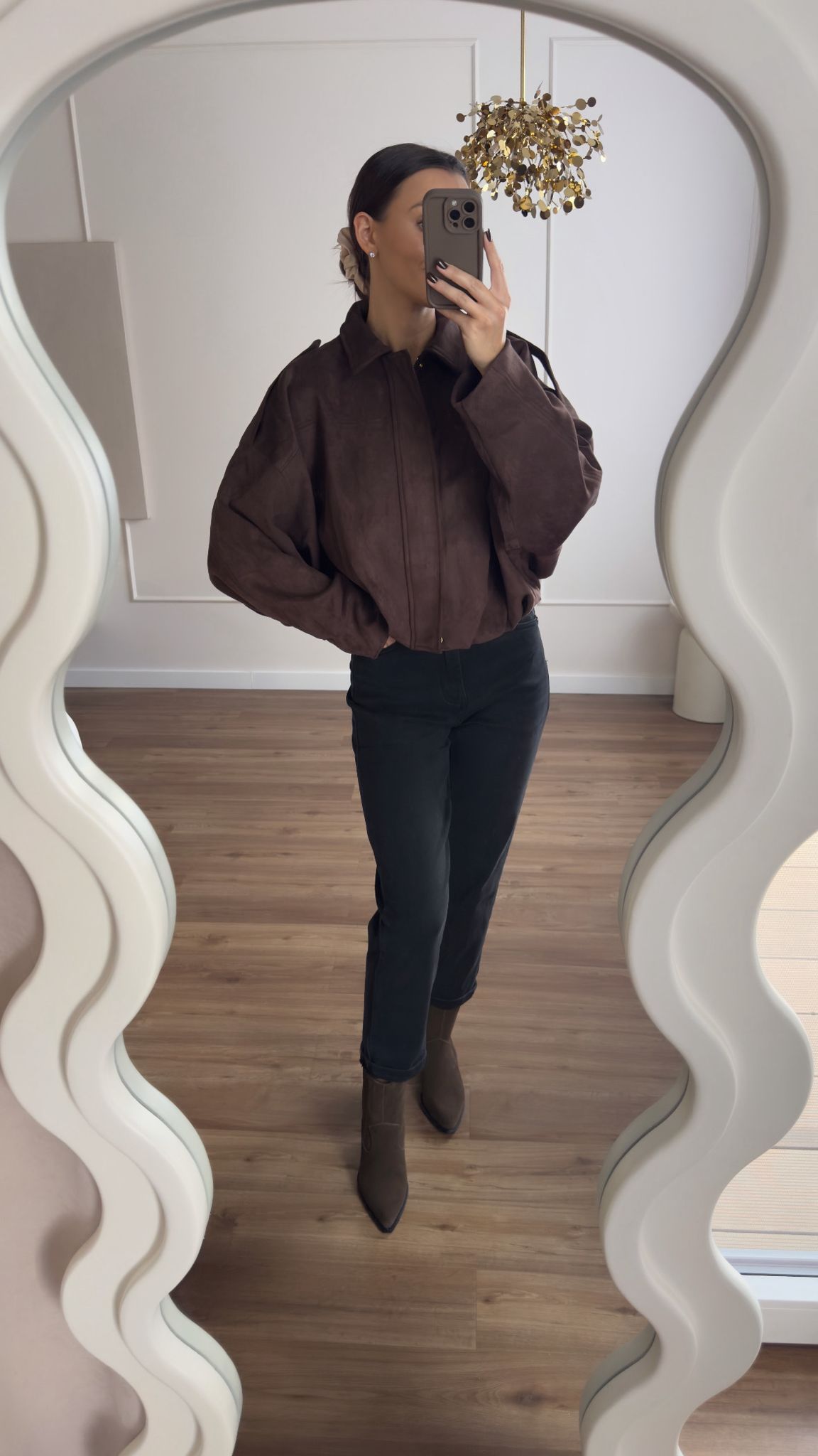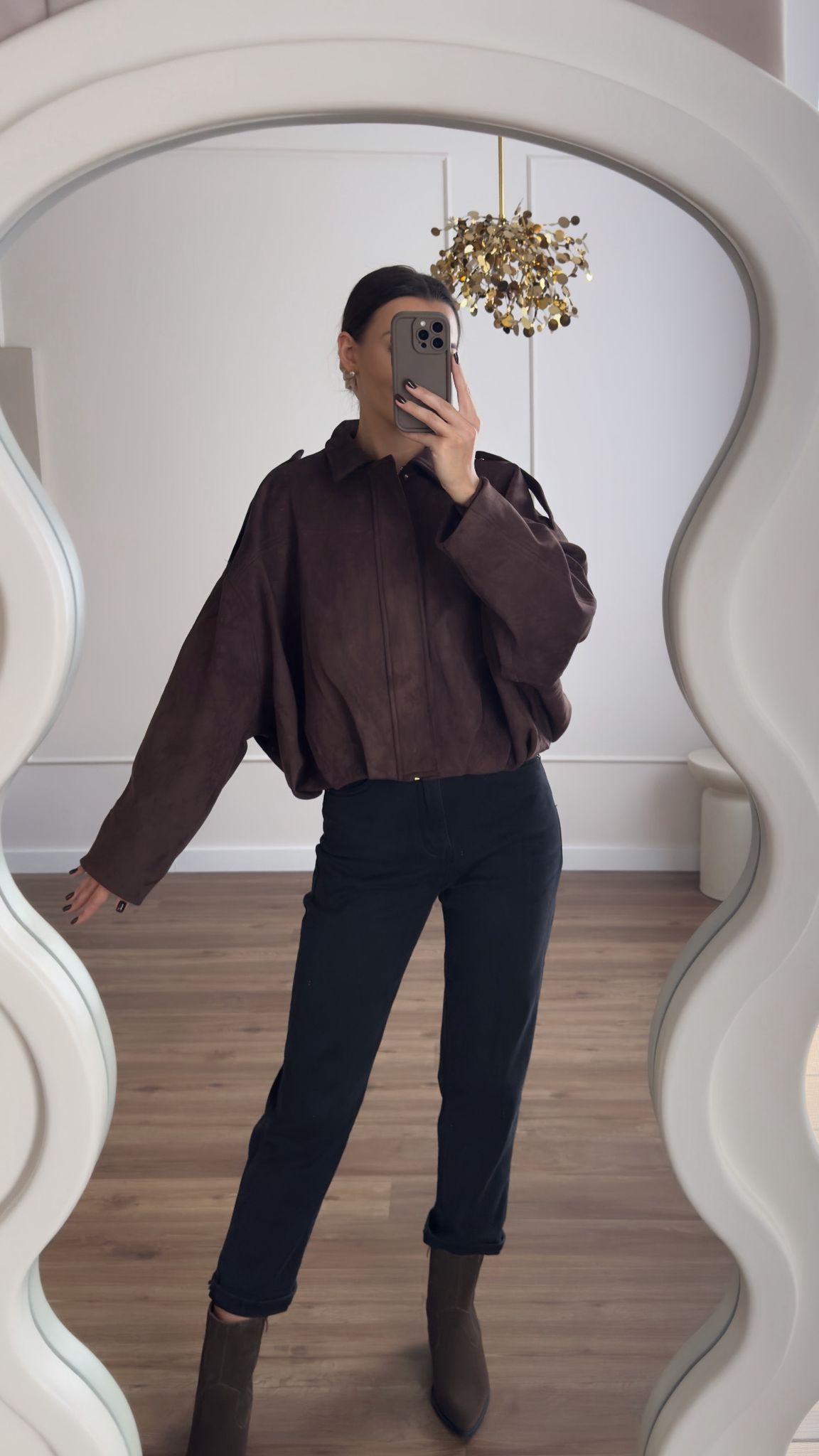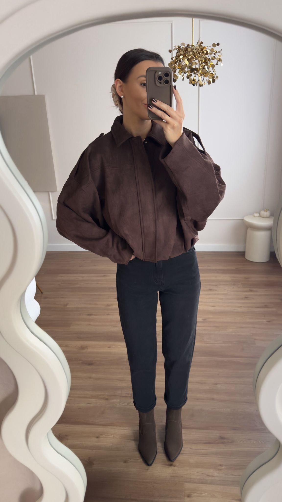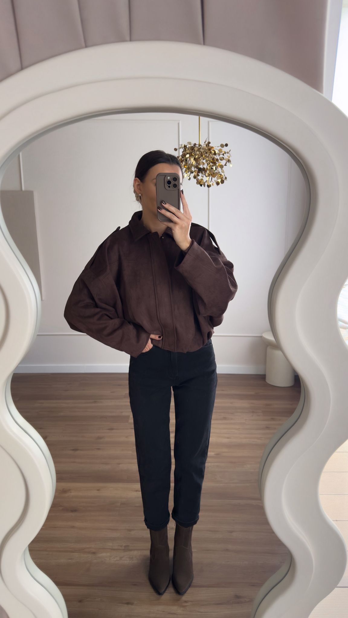 Kurtka o kroju bomberki z marszczeniem w pasie. Oversize krój, lekko opuszczona linia ramion. Materiał imitujący zamsz, ozdobne zapięcia na ramionach. Złoty suwak kryty. Idealna do spodni, ale również do sukienek.