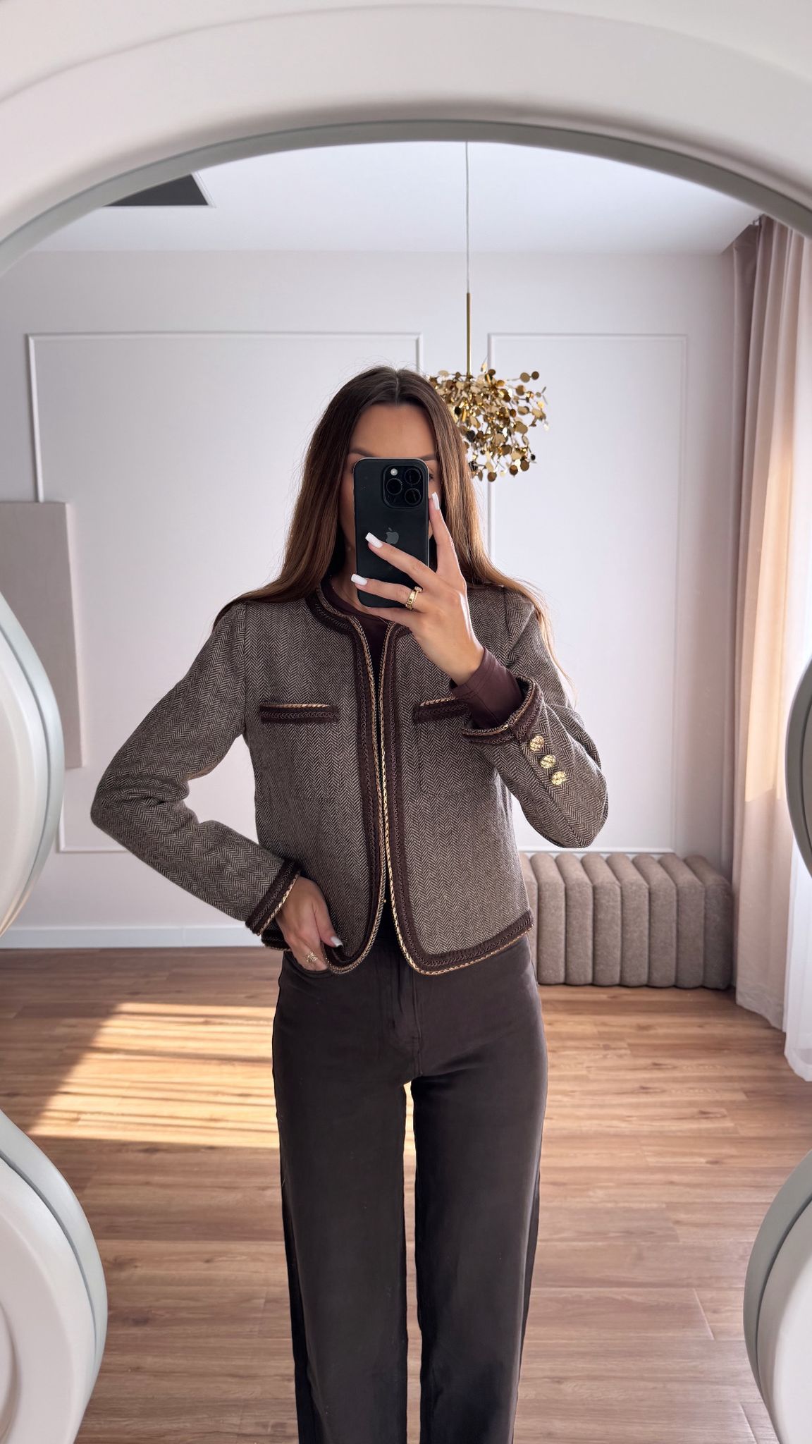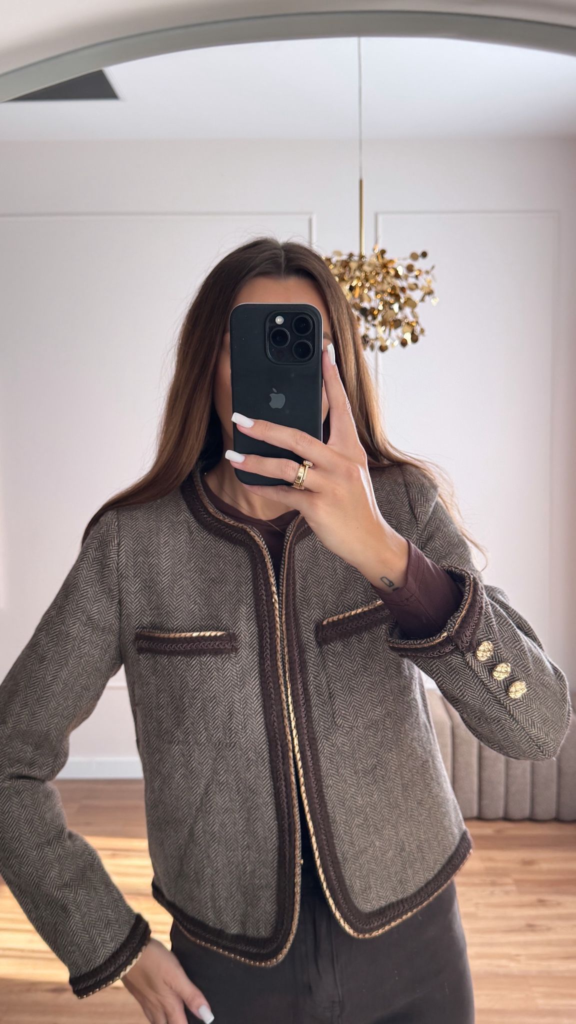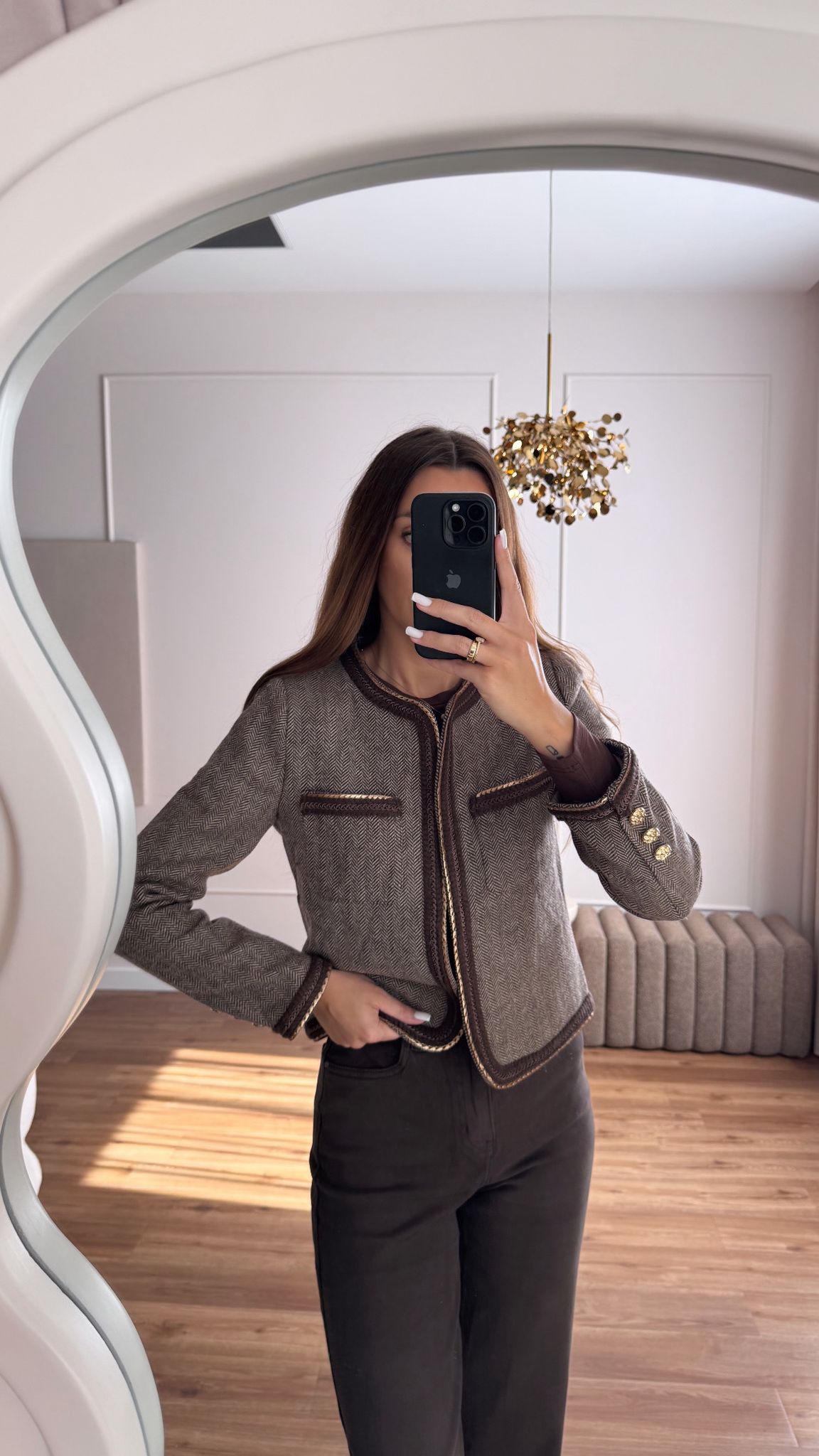 Bardzo elegancka i ponadczasowa marynarka. Złote dodatki, zapinana na haftki.