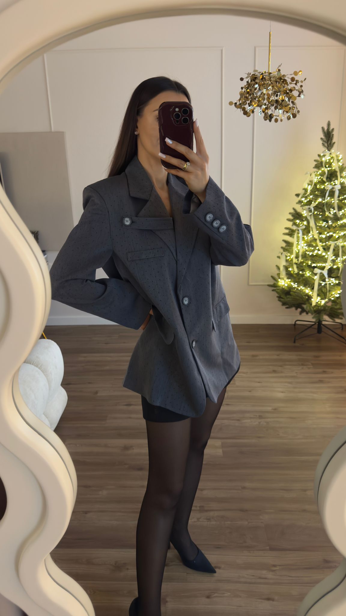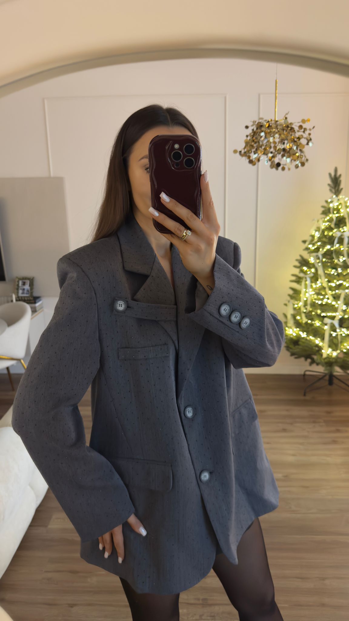 Marynarka o kroju oversize. Ozdobne cyrkonie. Ozdobny pasek na klapie (możliwość odpięcia