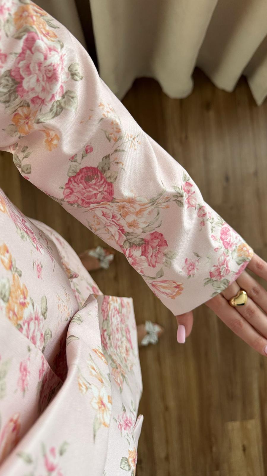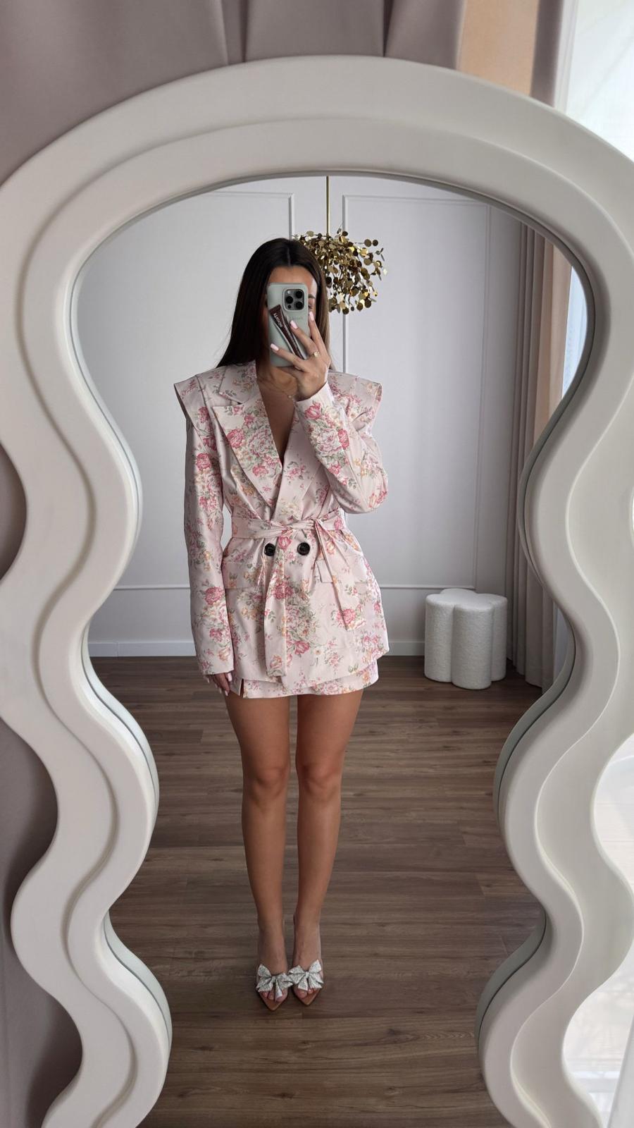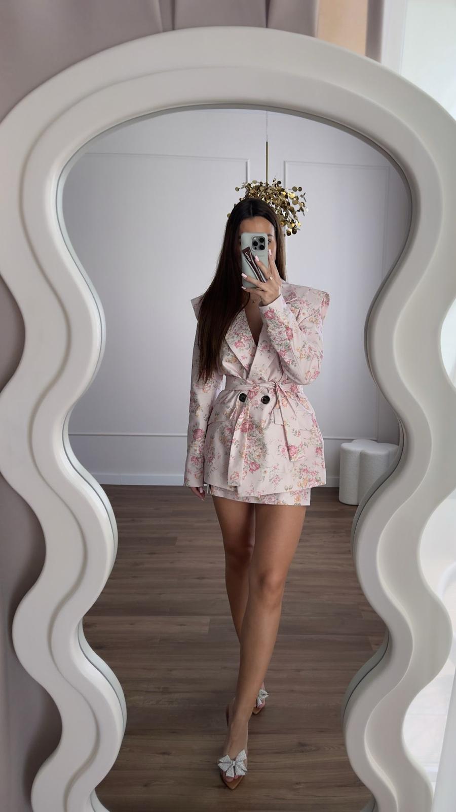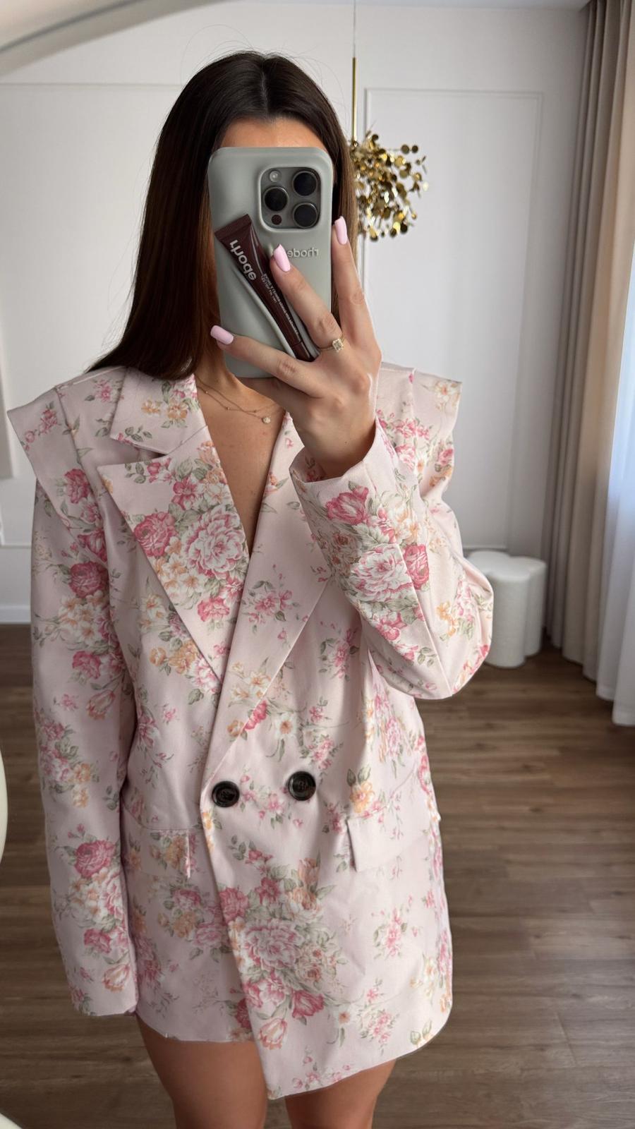 Marynarka w kwiaty z paskiem w talii to połączenie romantycznego wzoru i nowoczesnego kroju. Wyróżnia się lekko zaznaczonymi ramionami i talią podkreśloną paskiem, który nadaje sylwetce kobiecą proporcję i elegancję. Wzór kwiatowy wprowadza świeżość i subtelny charakter, sprawiając, że marynarka świetnie sprawdzi się zarówno w stylizacjach biznesowych, jak i na specjalne okazje. Noś ją jako samodzielny element z eleganckimi spodniami lub narzuć na sukienkę – efekt zawsze będzie stylowy i przyciągający spojrzenia.