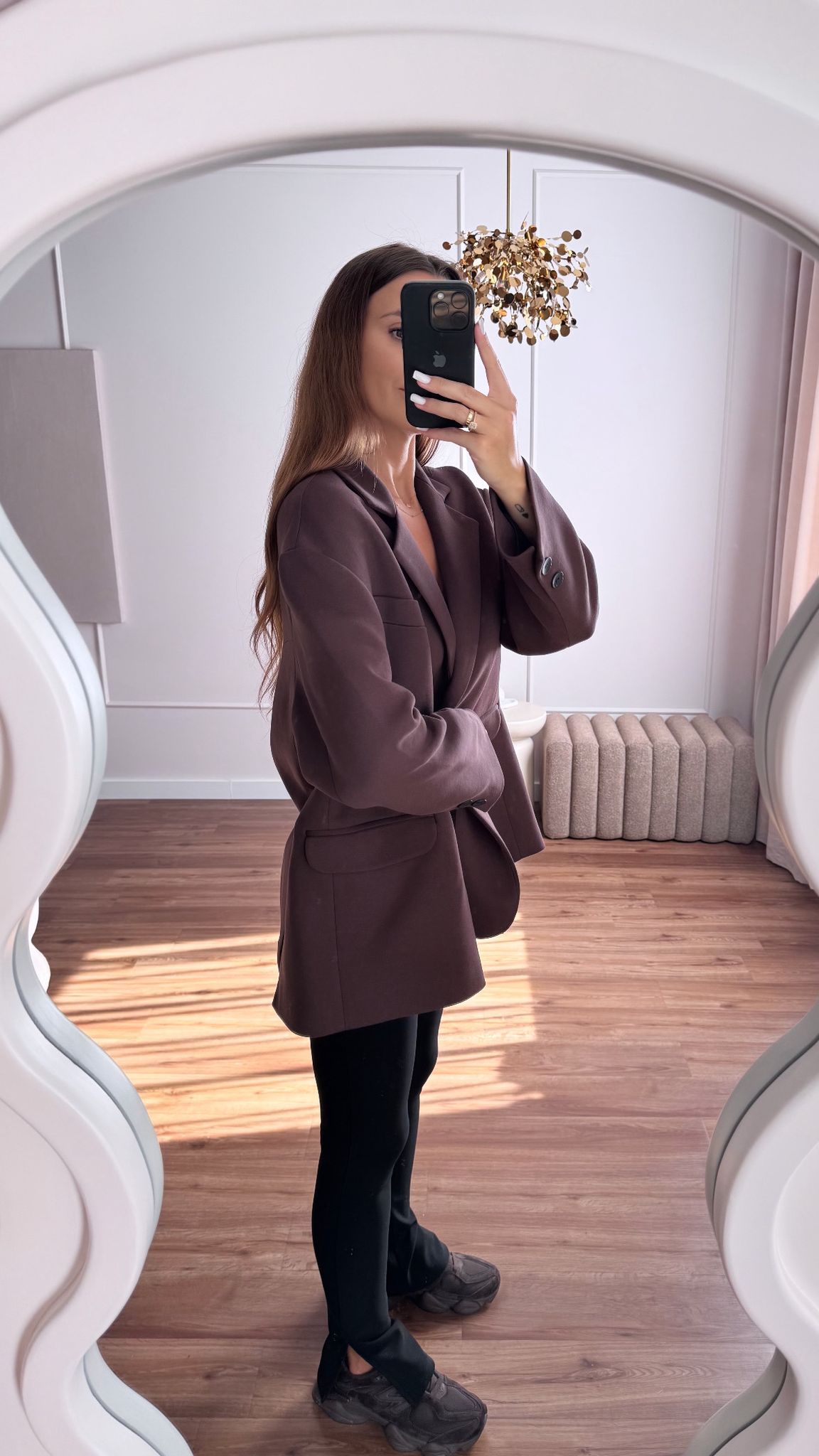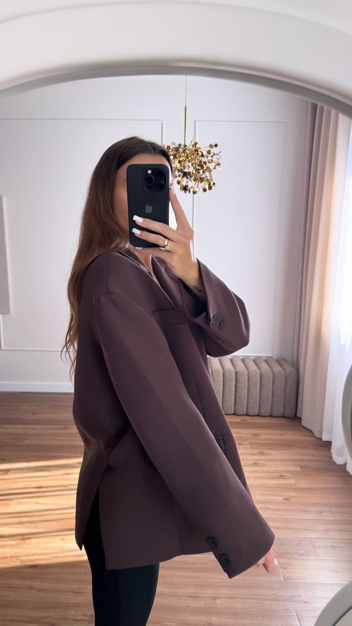 Klasyczna marynarka z rozcięciem na boku. Zapinana na guziki, lekko dłuższy, oversife krój. Super wyglada z paskiem w talii 🙂