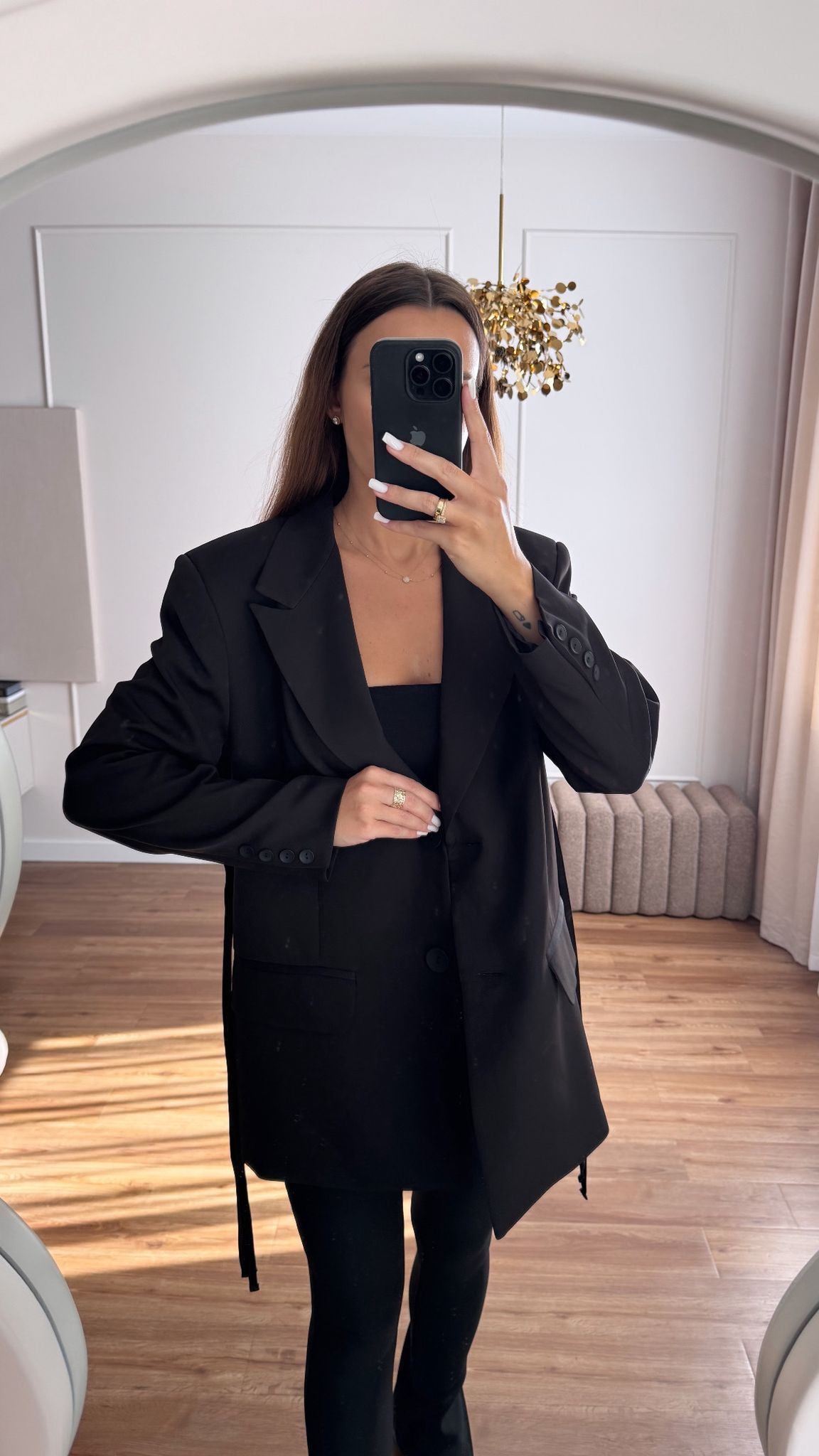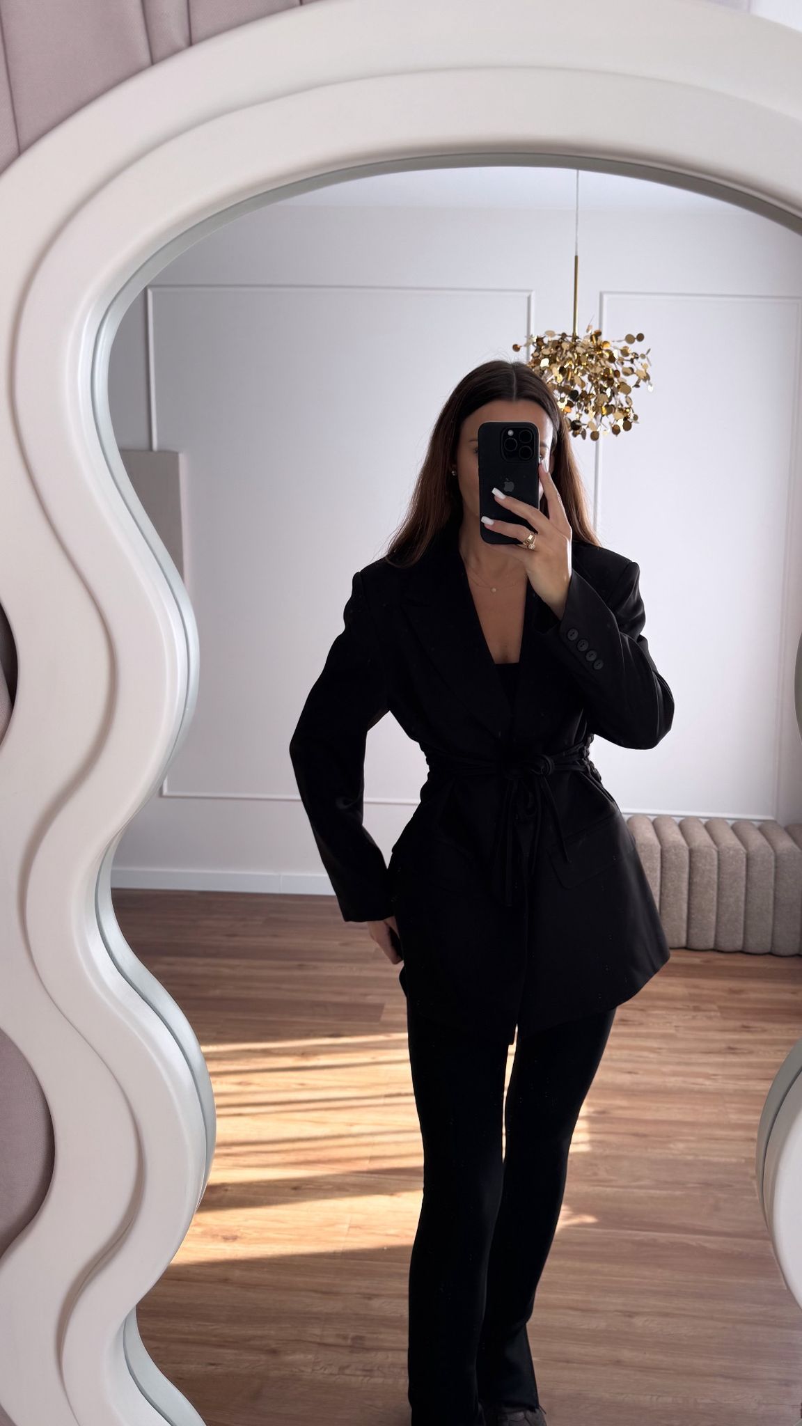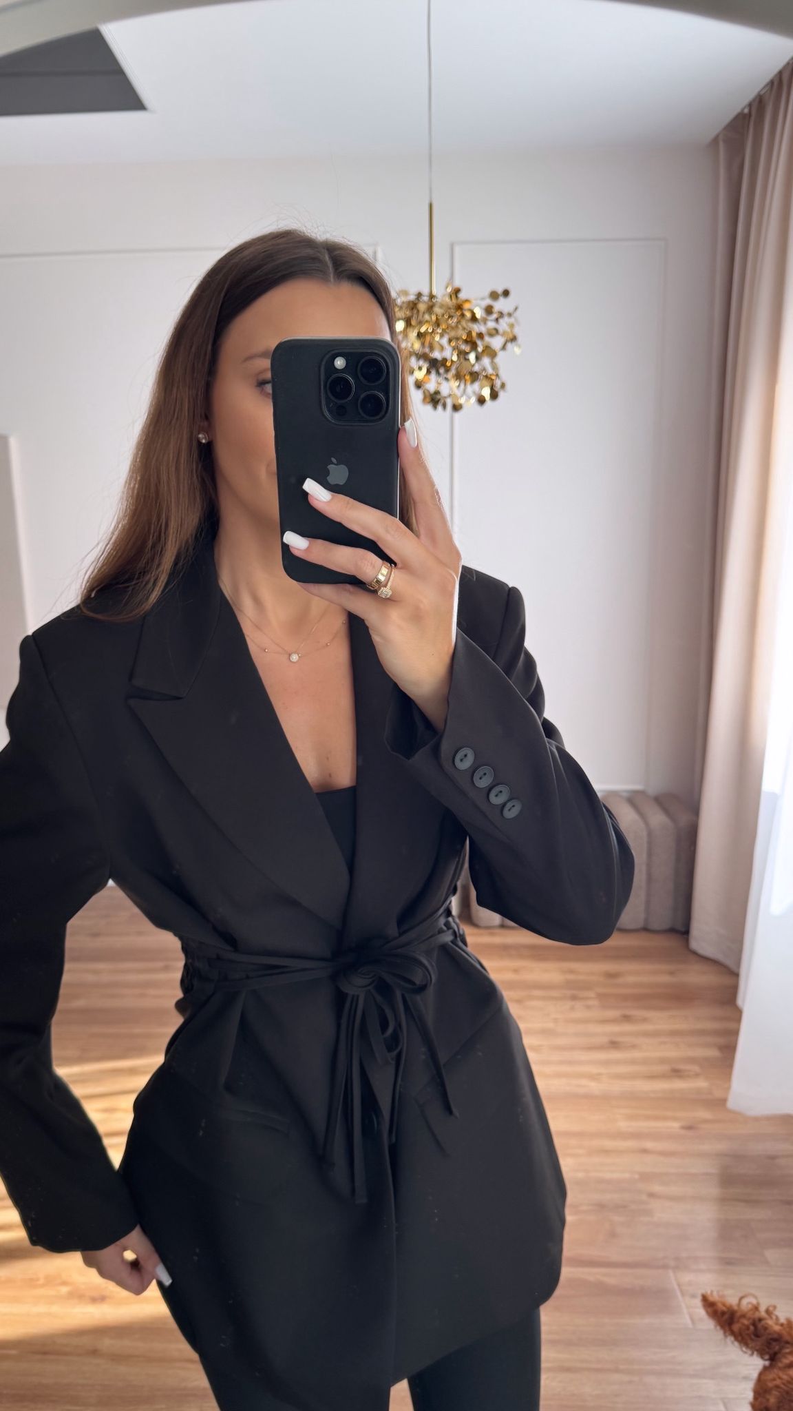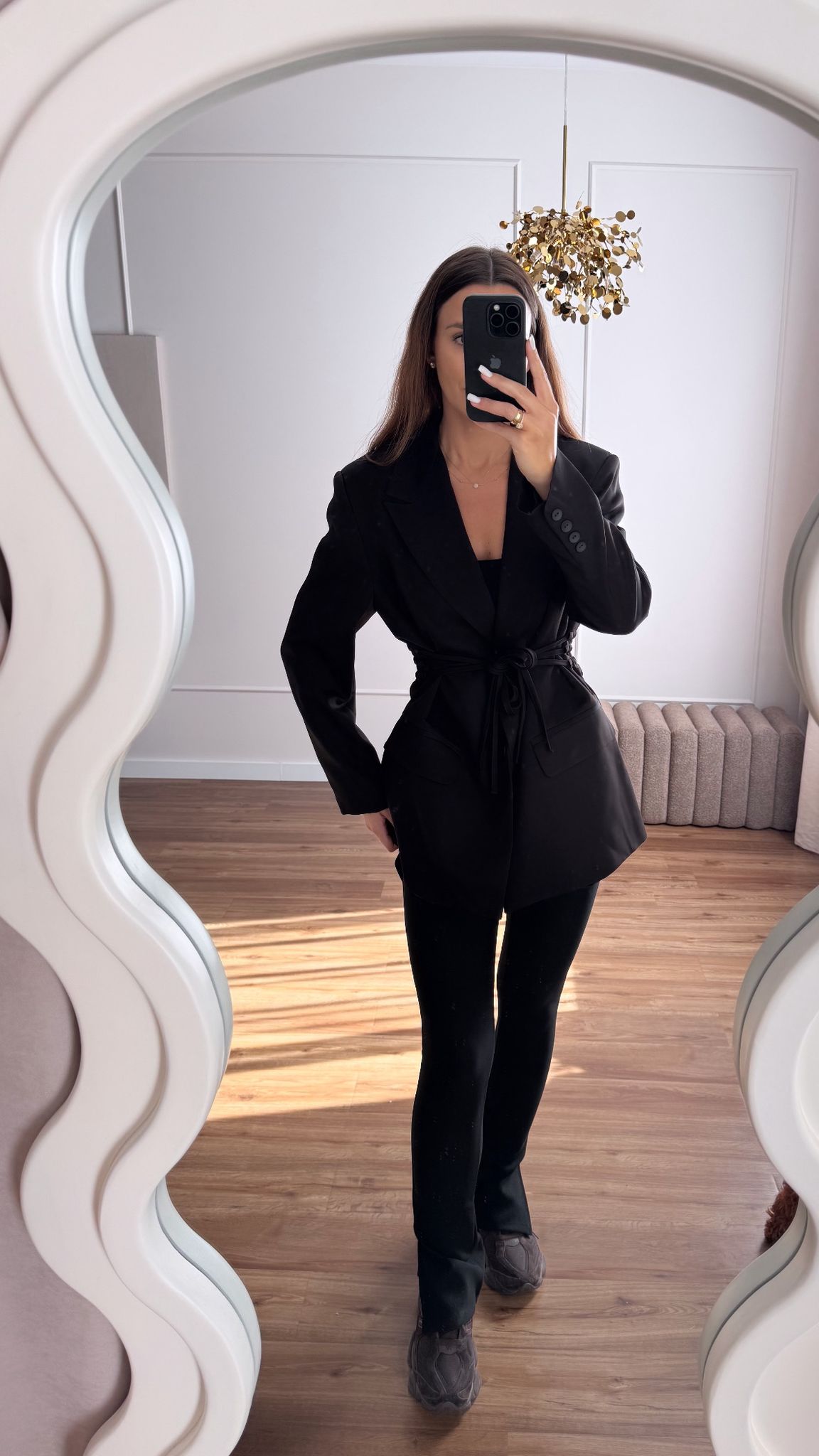 Marynarka o klasycznym kroju, zapinana na dwa guziki. Posiada ściągacz w talii.