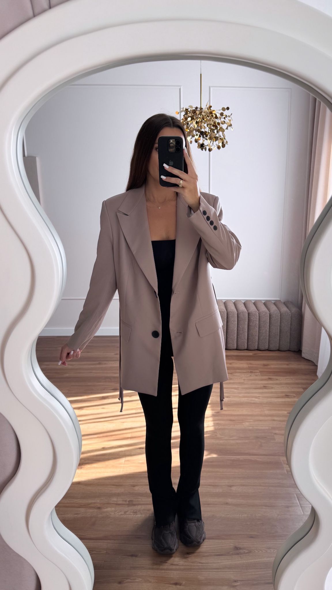 Marynarka o klasycznym kroju, zapinana na dwa guziki. Posiada ściągacz w talii.