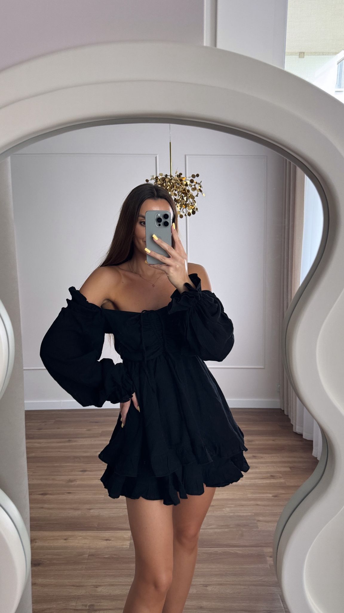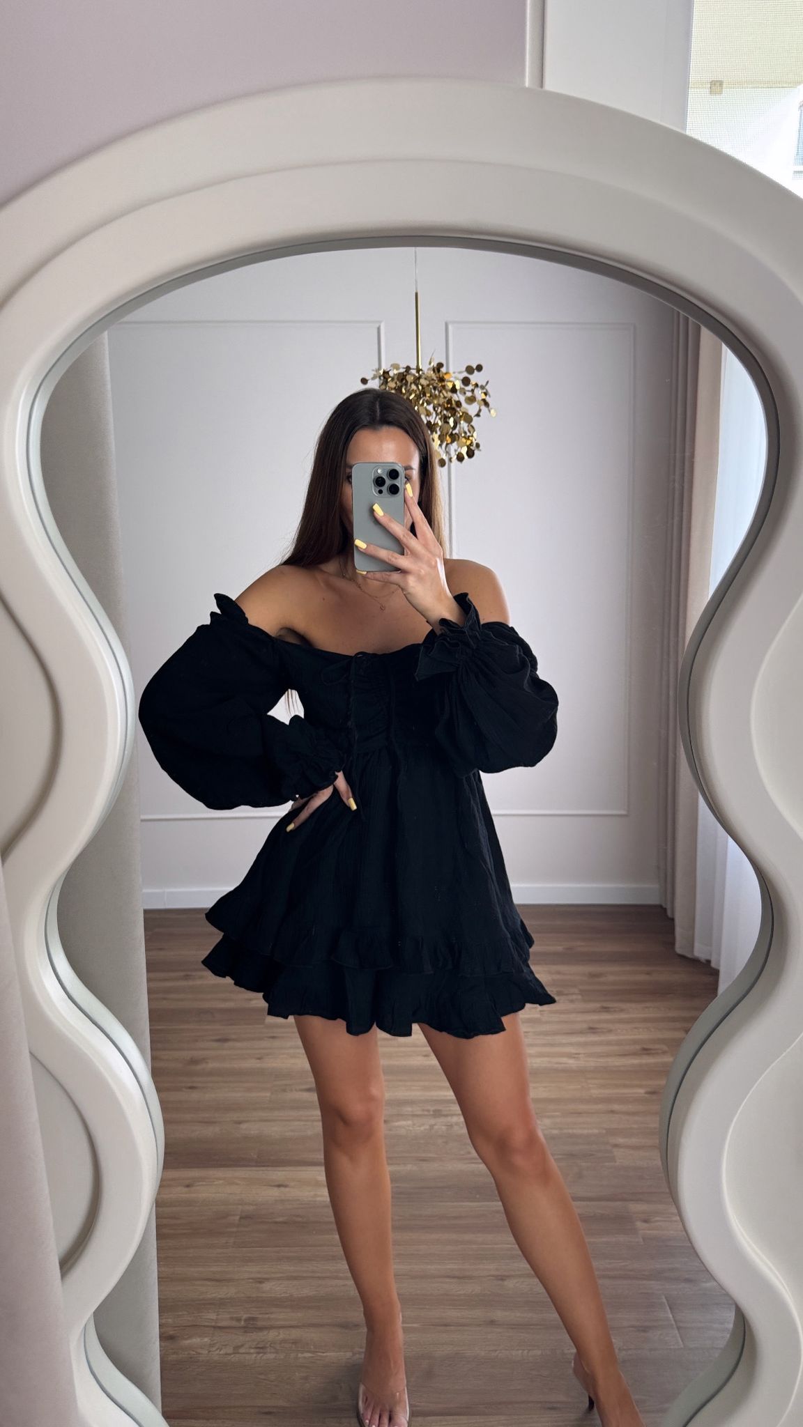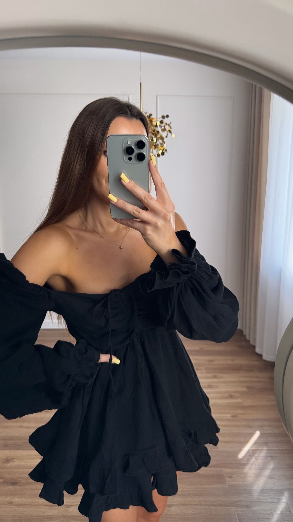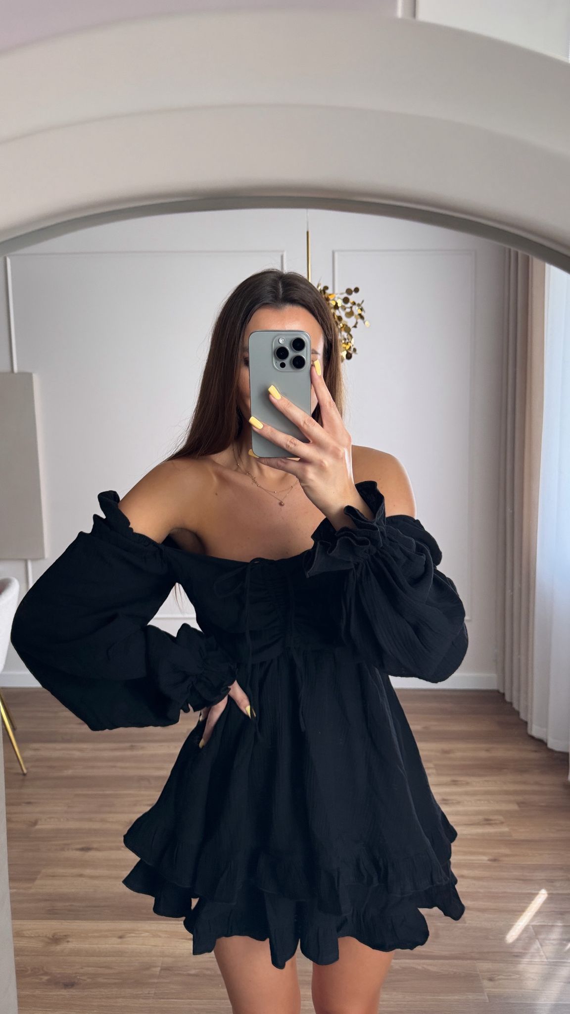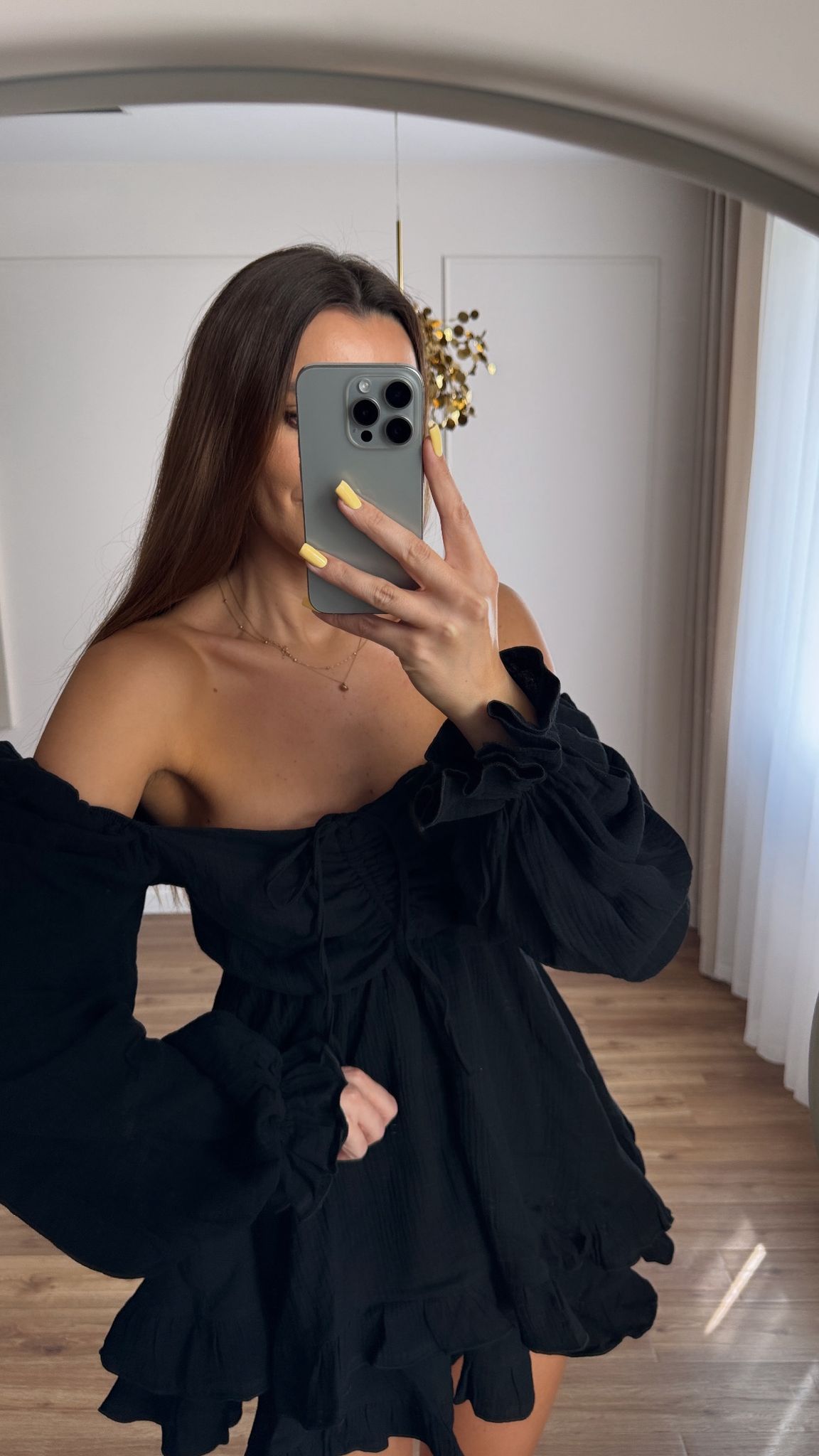 Zmysłowa i lekka jak mgiełka – ta muślinowa sukienka w kolorze czarnym to esencja kobiecości. Delikatny materiał nadaje całości romantycznego charakteru. Opadające ramiona z długimi rękawami tworzą zmysłowy dekolt, który pięknie eksponuje szyję i obojczyki, a marszczenie na biuście podkreśla sylwetkę i dodaje uroku.