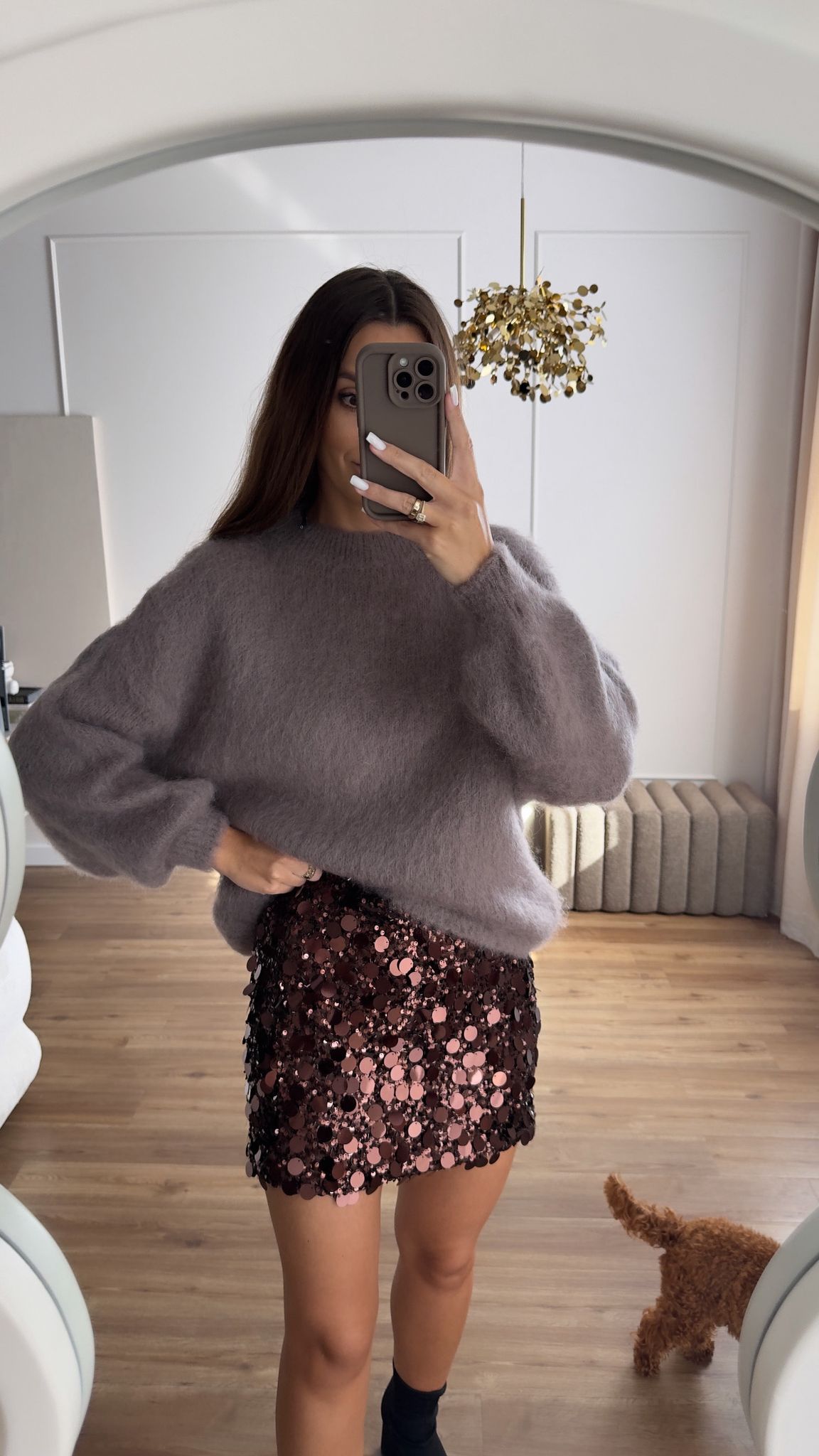 Spódniczka mini z cekinowym zdobieniem w brązowym kolorze. Zapinana z boku na niewidoczny ekspres.