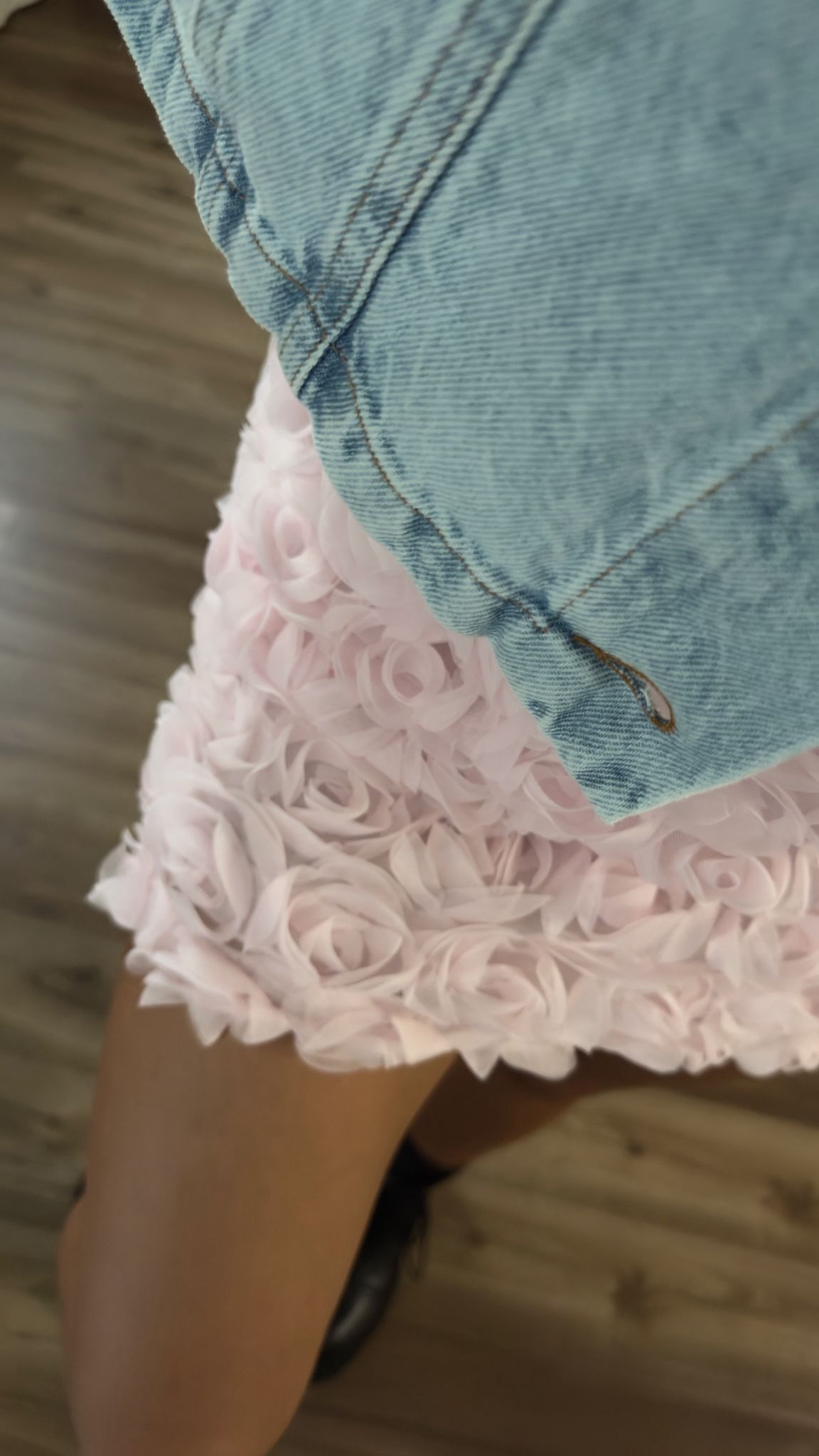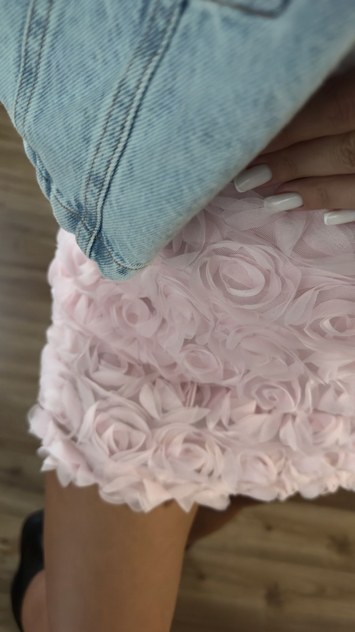 Spódniczka o długości mini. Wytłaczana w kwiaty 3D. Elastyczny materiał.