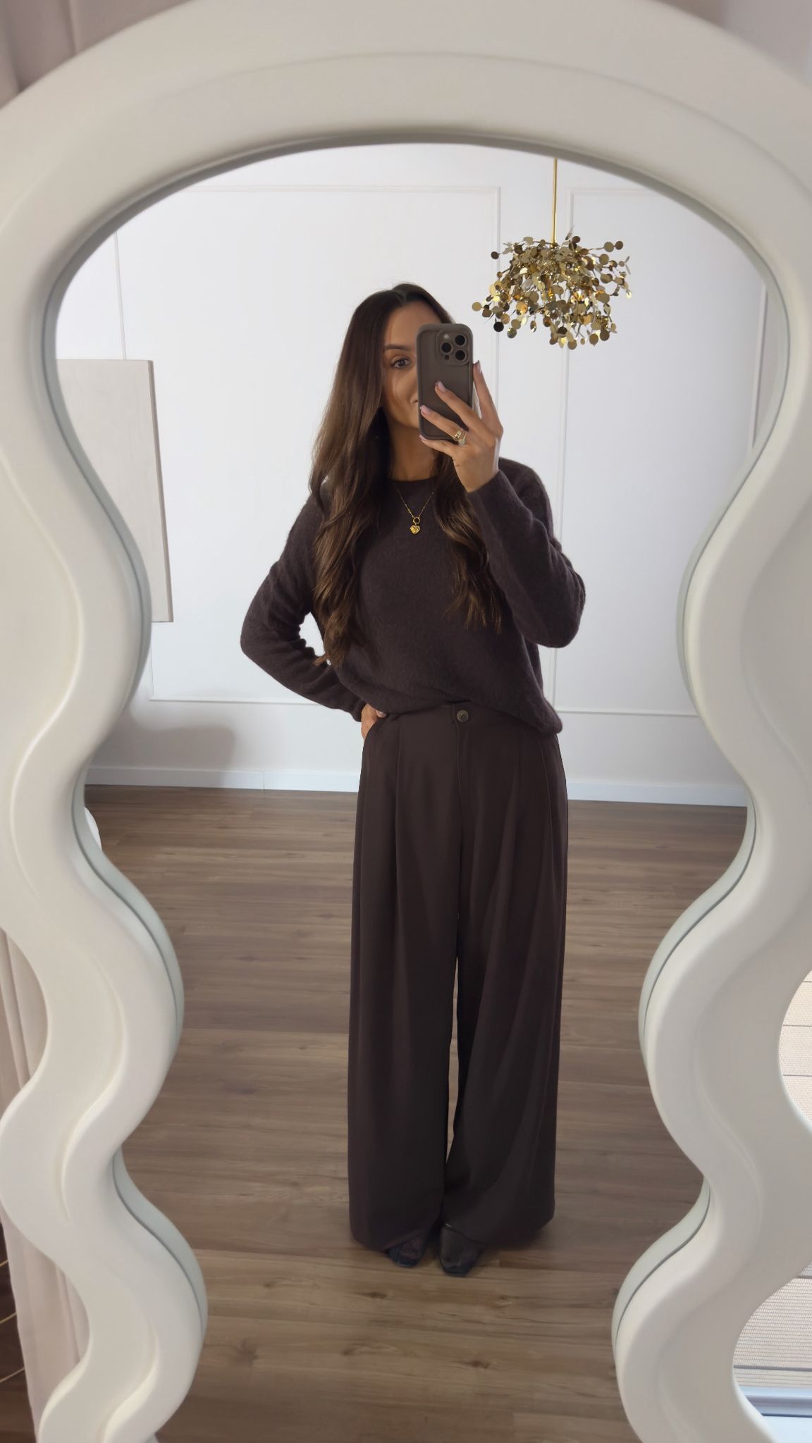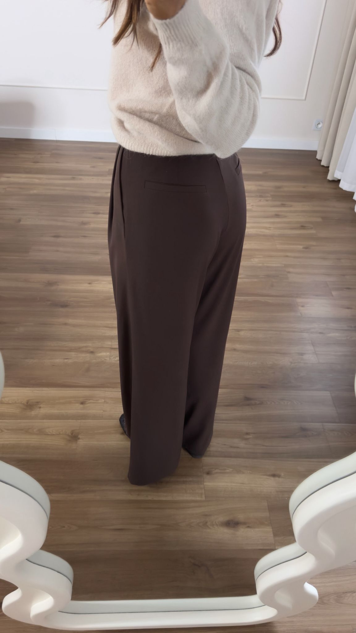 Klasyczne spodnie z kontrafałdą. Idealnie sprawdzą się jako element wielu stylizacji. Ponadczasowy krój – wysoki stan, długa, rozszerzana nogawka.