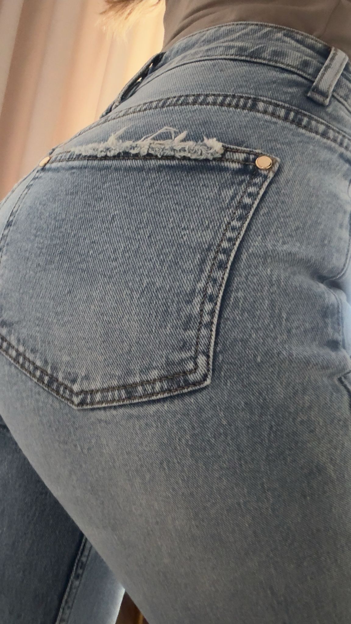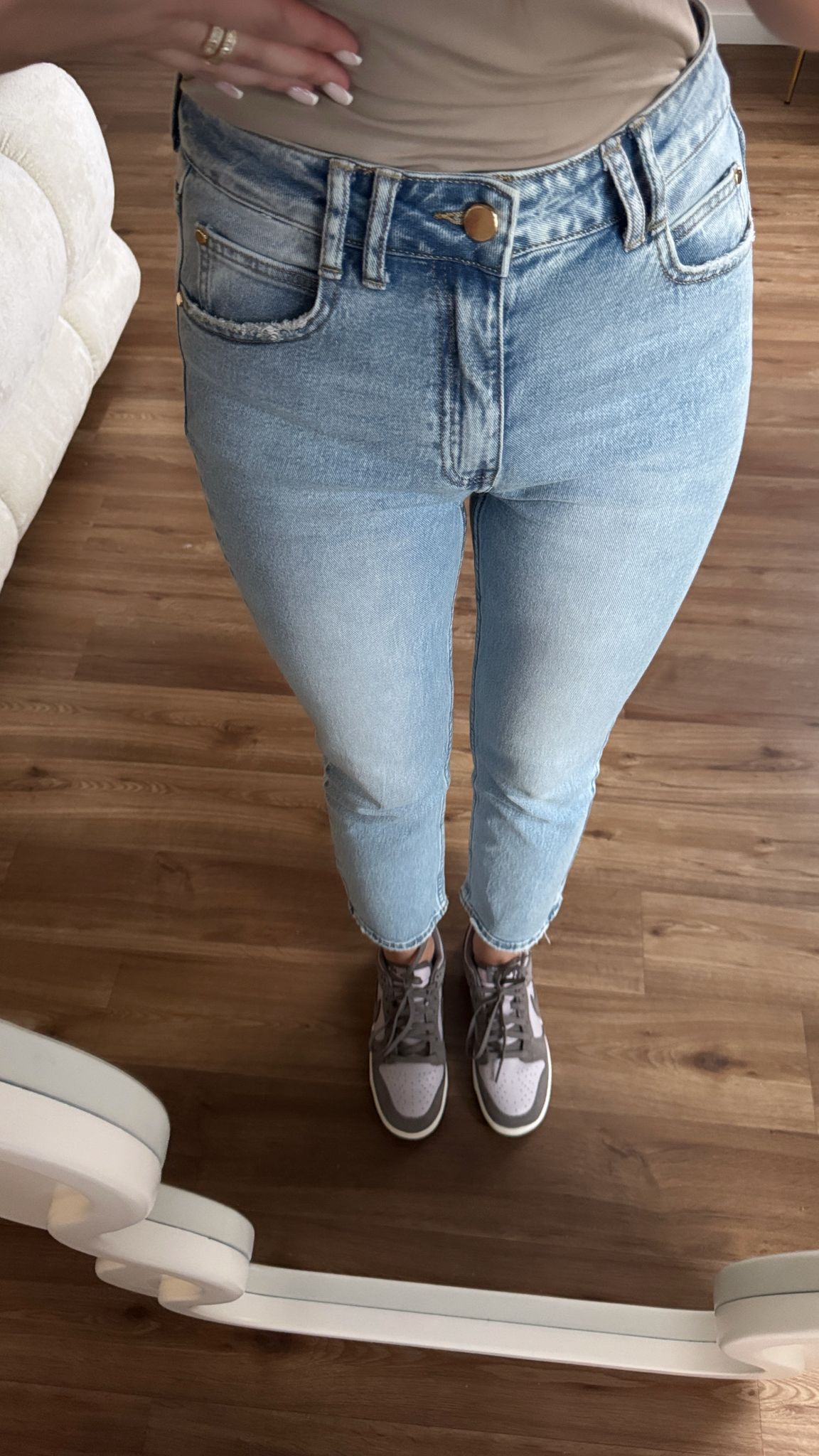 Spodnie jeansowe typu Mom Fit Slim. Klasyczny model. Złote dodatki w postaci guzika i nap przy kieszeniach. Ponadczasowy model jako baza do wielu stylizacji. Przepiękny odcień niebieskiego jeansu.