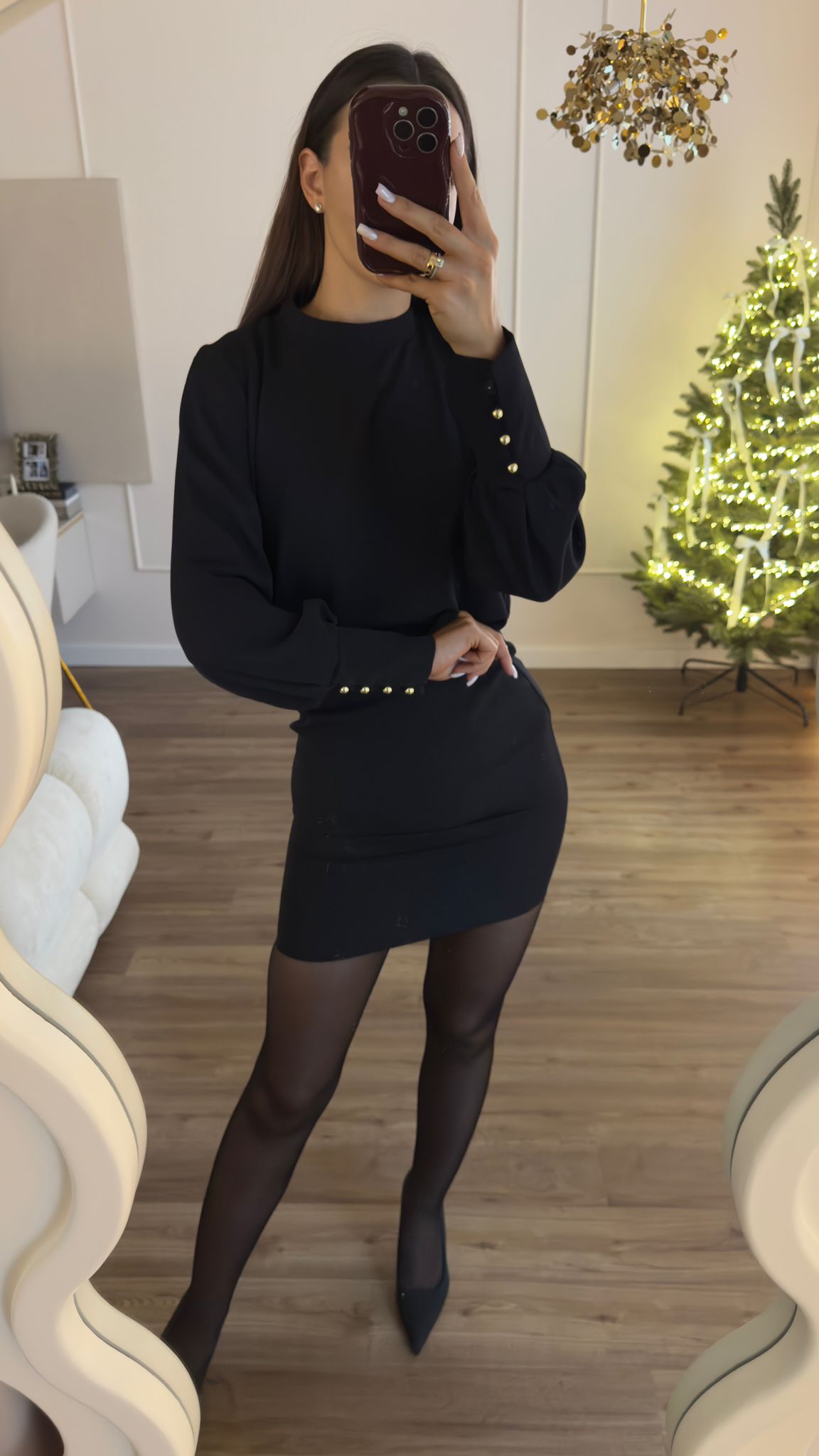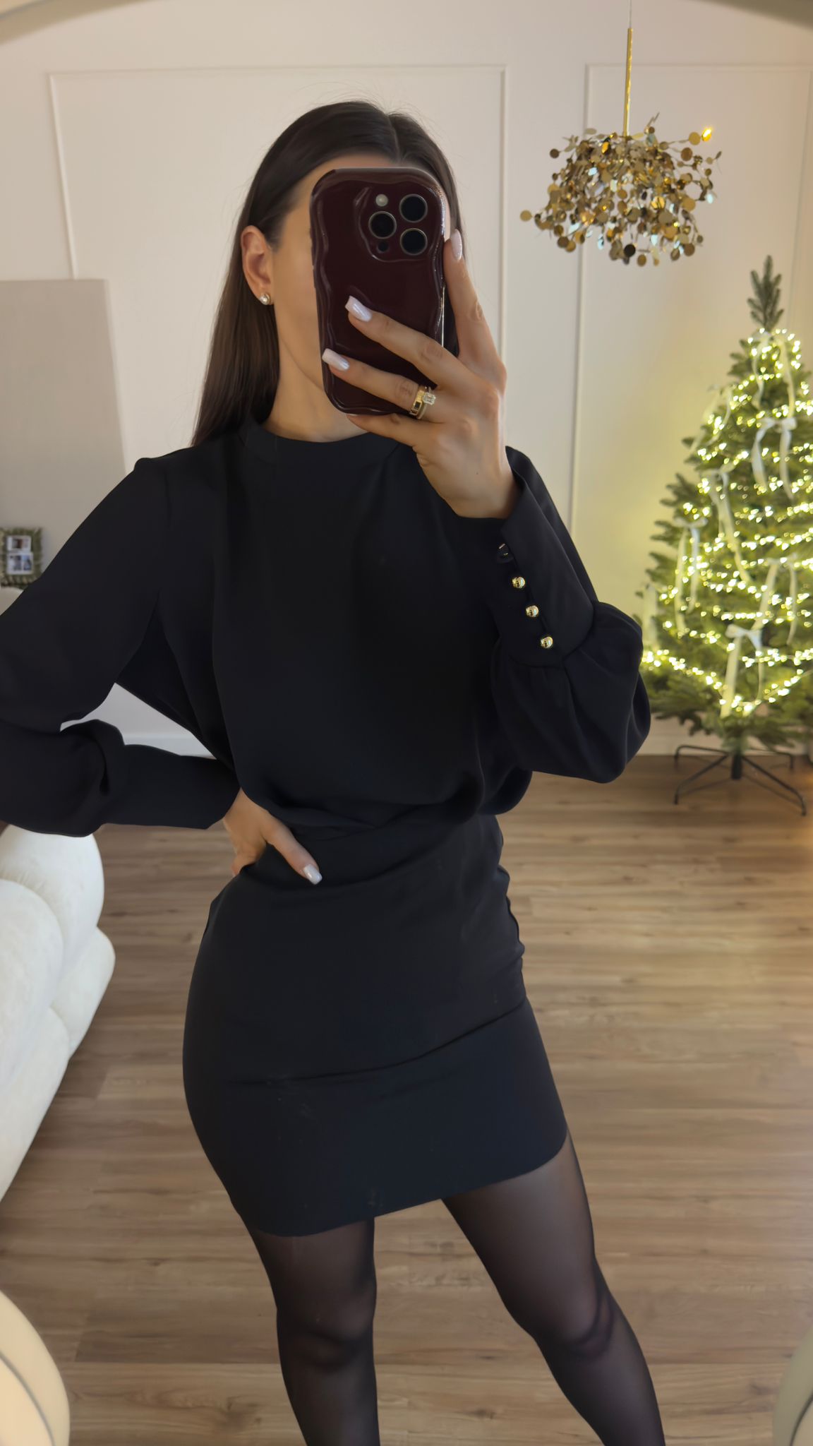 Sukienka o długości mini. Dopasowany krój od pasa. Ozdobne złote guziki. Zapięcie pod szyją na ozdobny guzik. Dekolt na plecach. Kryty zamek z tyłu.