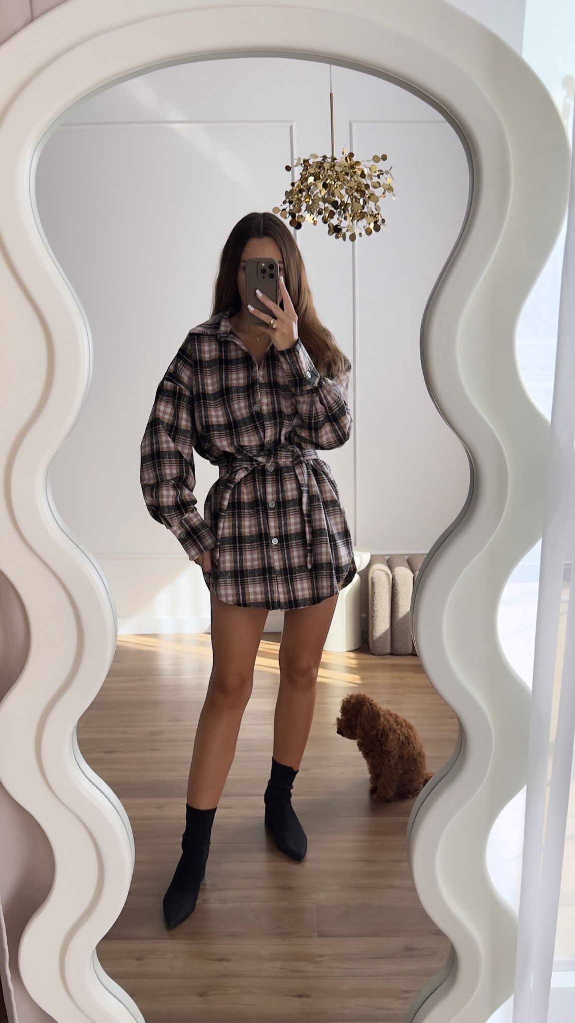 Długa koszula w kratę posiada w zestawie pasek, dzięki któremu możemy podkreślić talię.