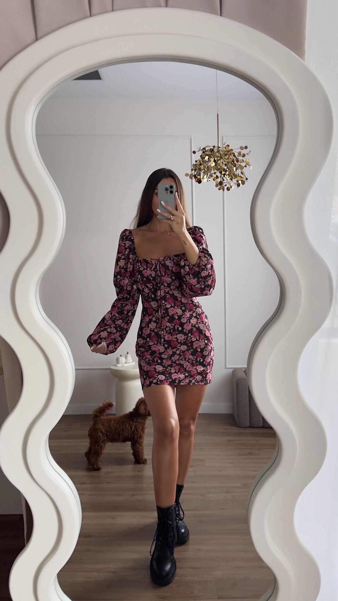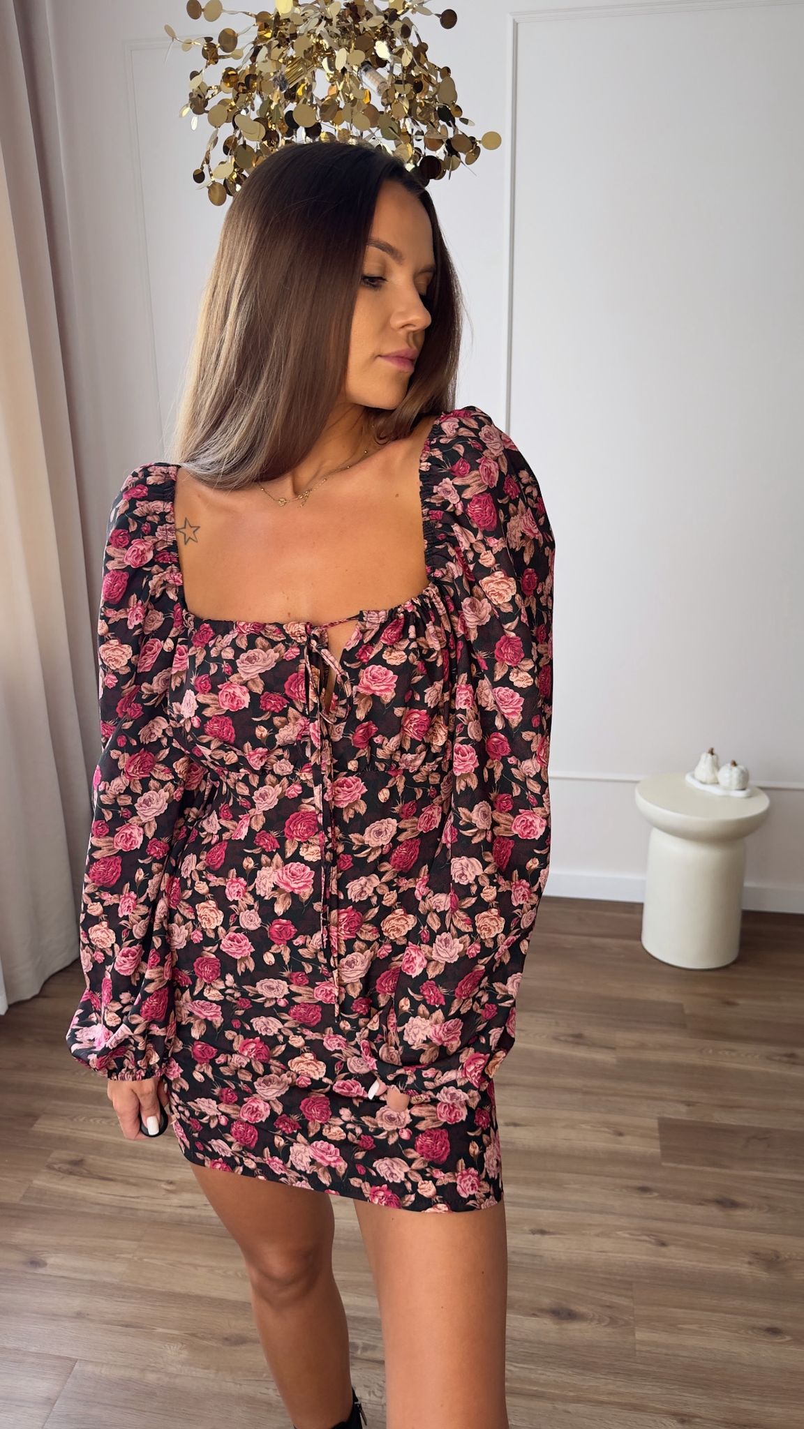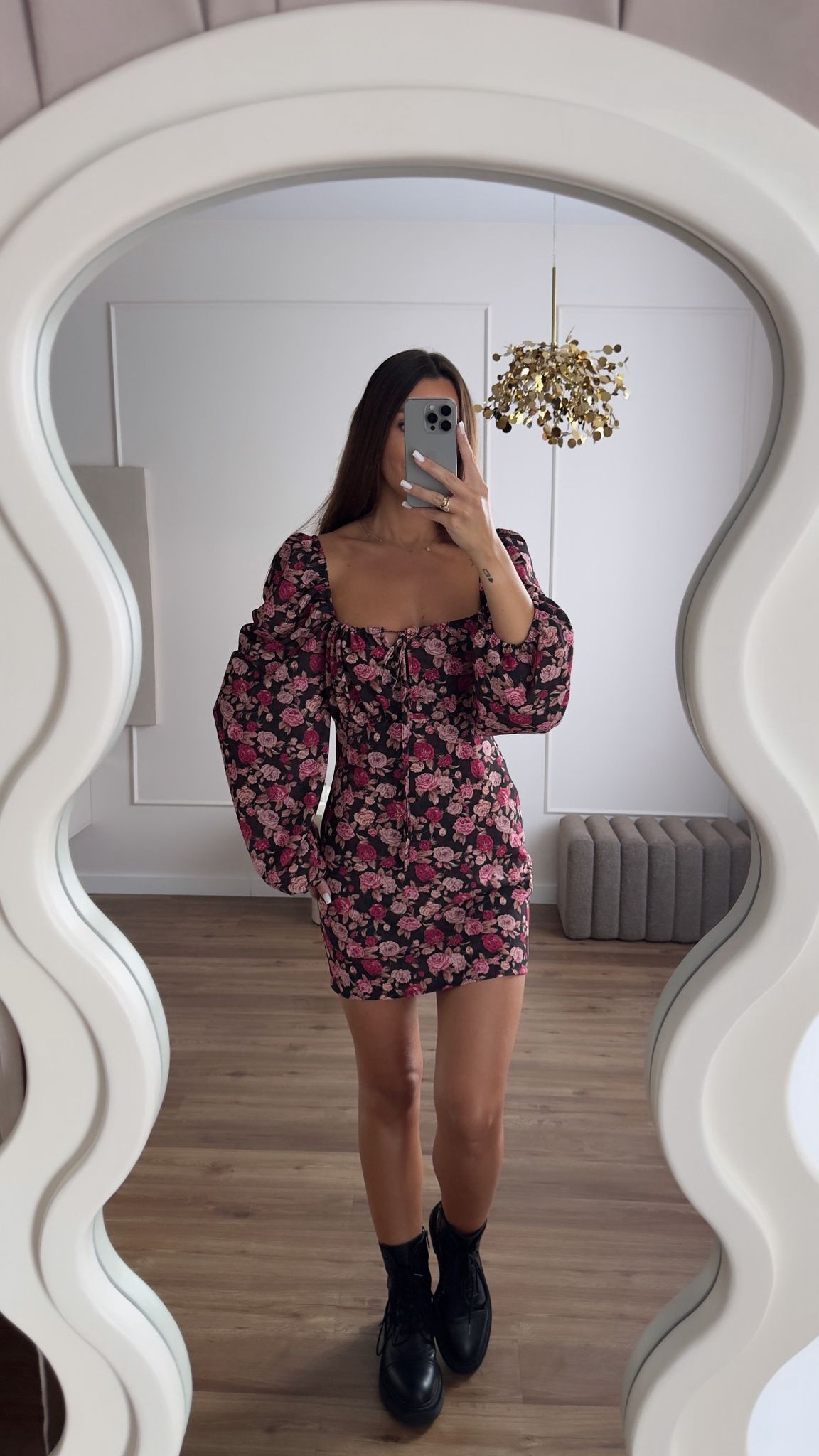 Kobieca sukienka z wiązaniem przy biuście. Bufiaste rękawy, dopasowany krój. Idealna do sportowych butów, botków i szpilek.