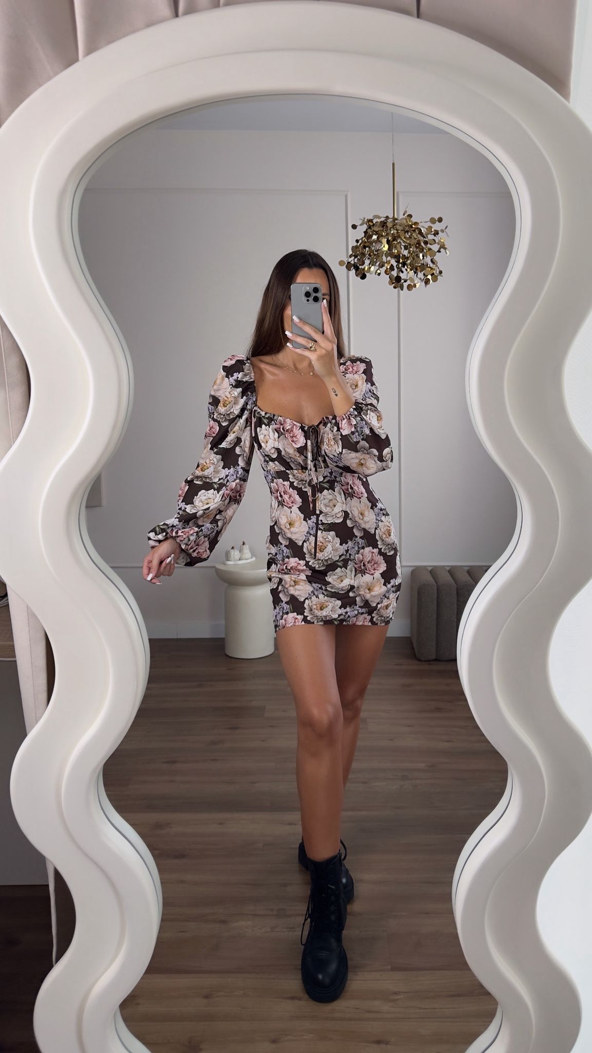 Kobieca sukienka z wiązaniem przy biuście. Bufiaste rękawy, dopasowany krój. Idealna do sportowych butów, botków i szpilek.