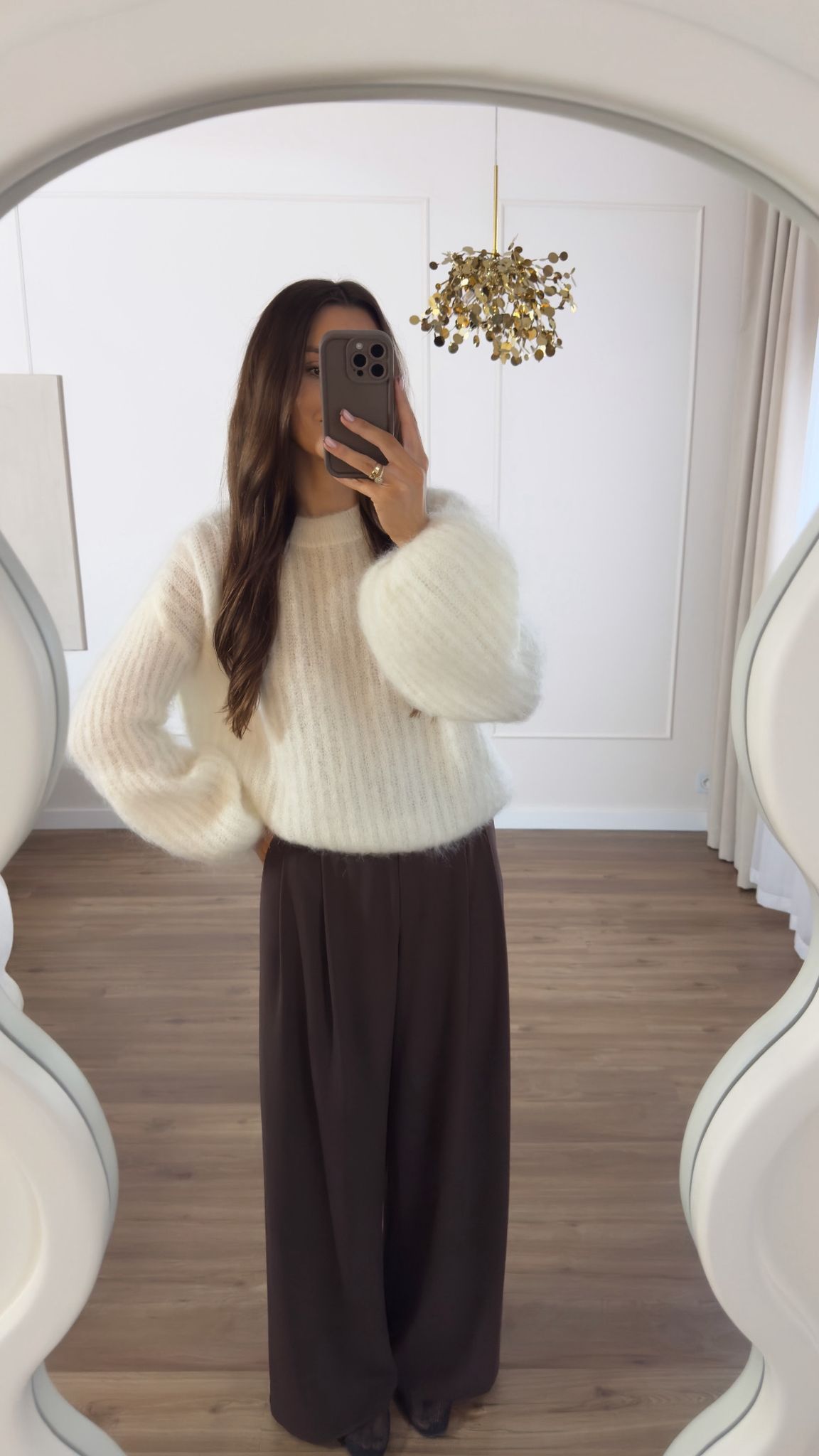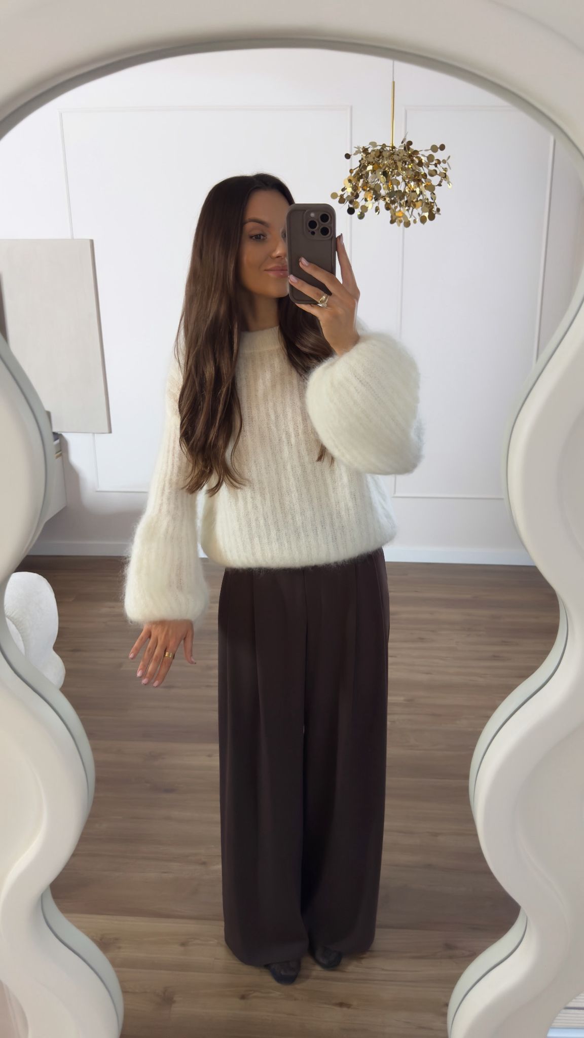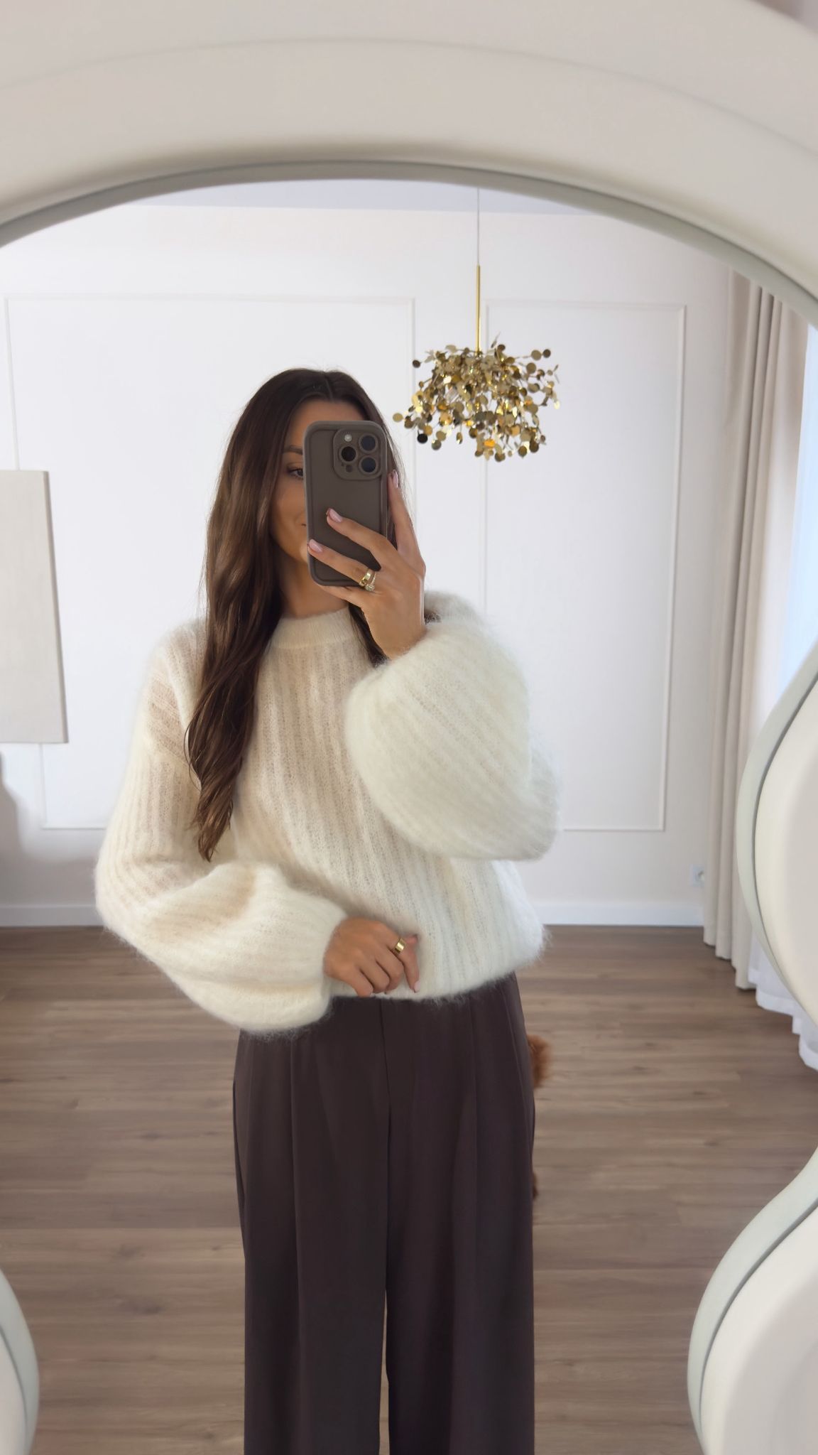 Sweter Super Kid Mohair. Klasyczny dekolt, rozszerzane rękawy, niepowtarzalny krój.