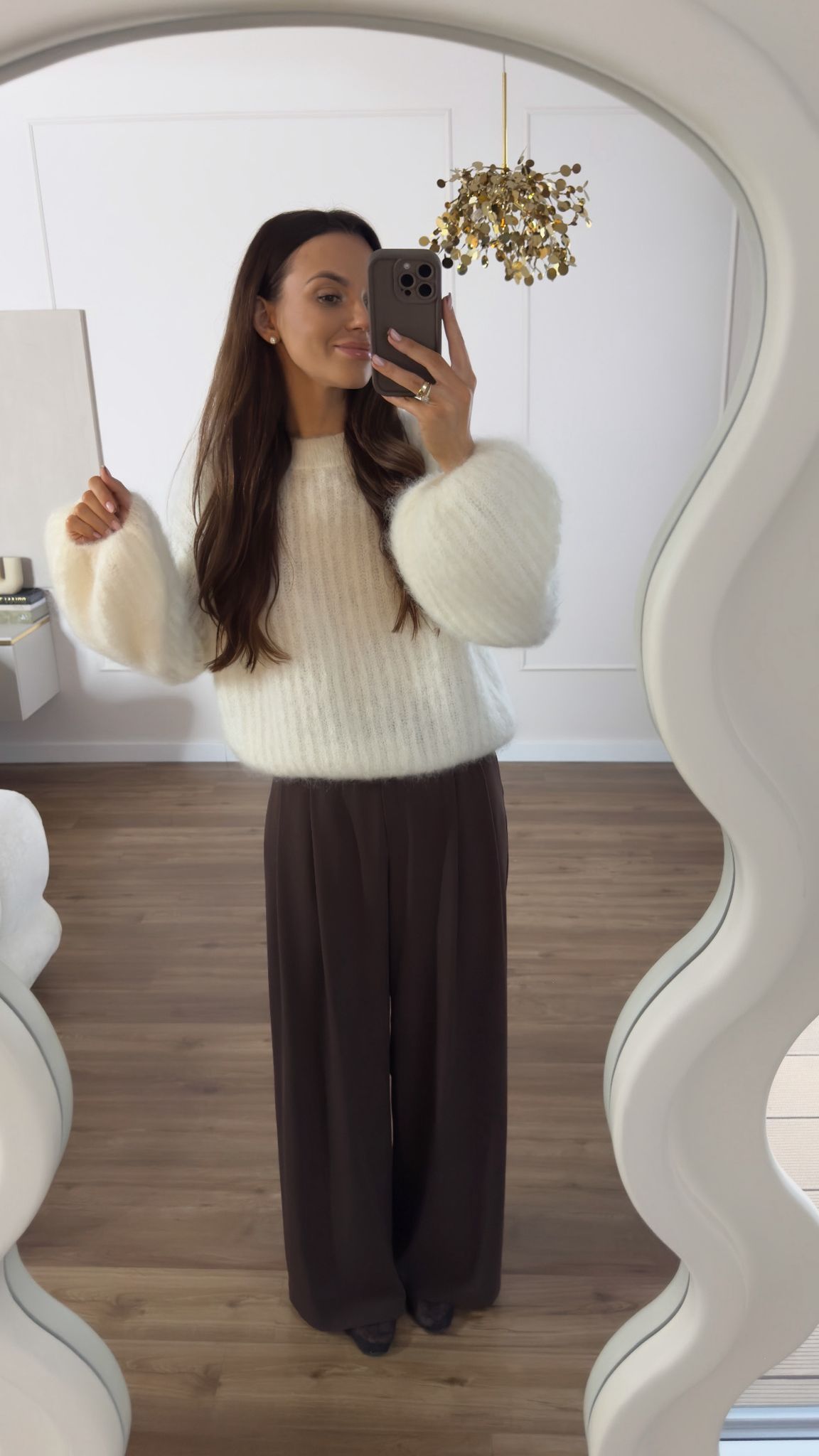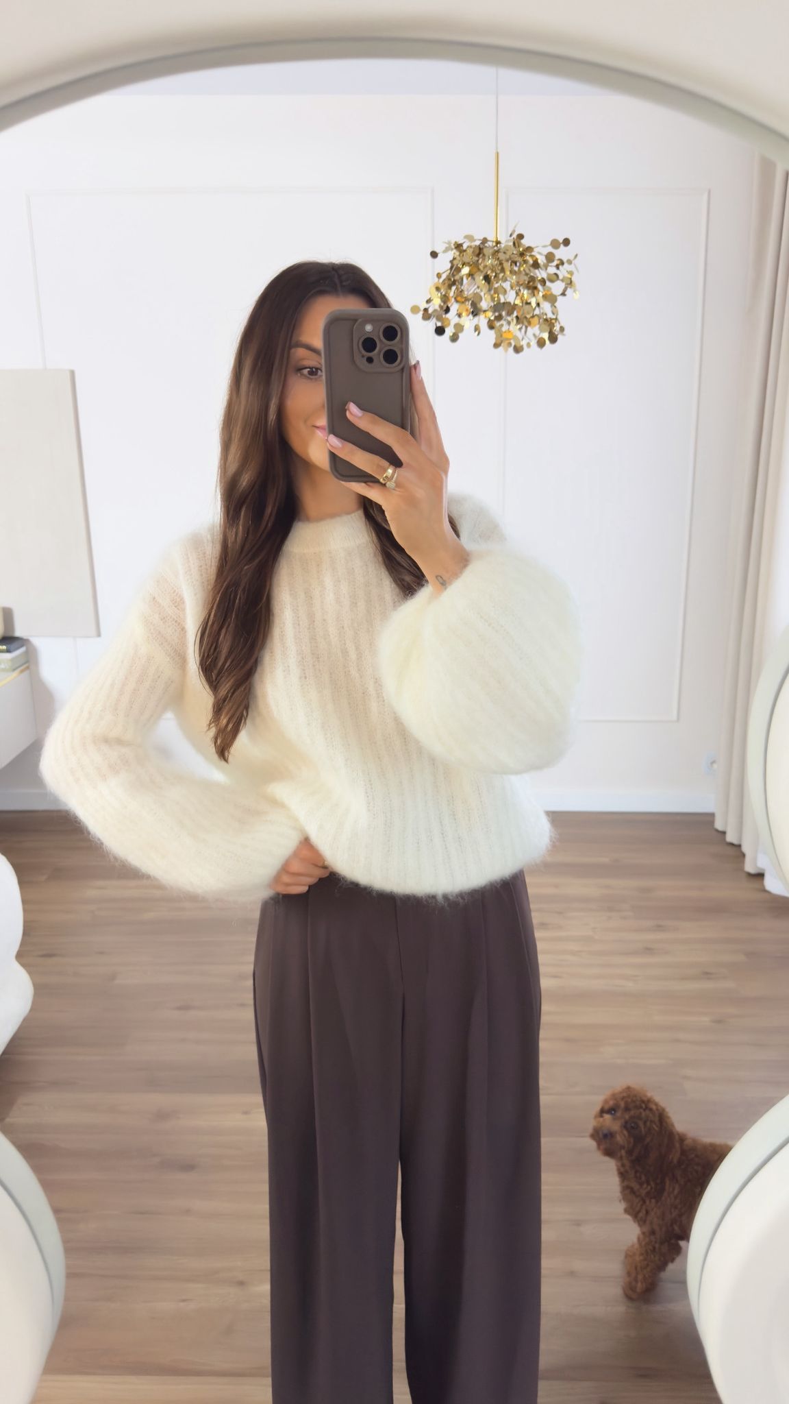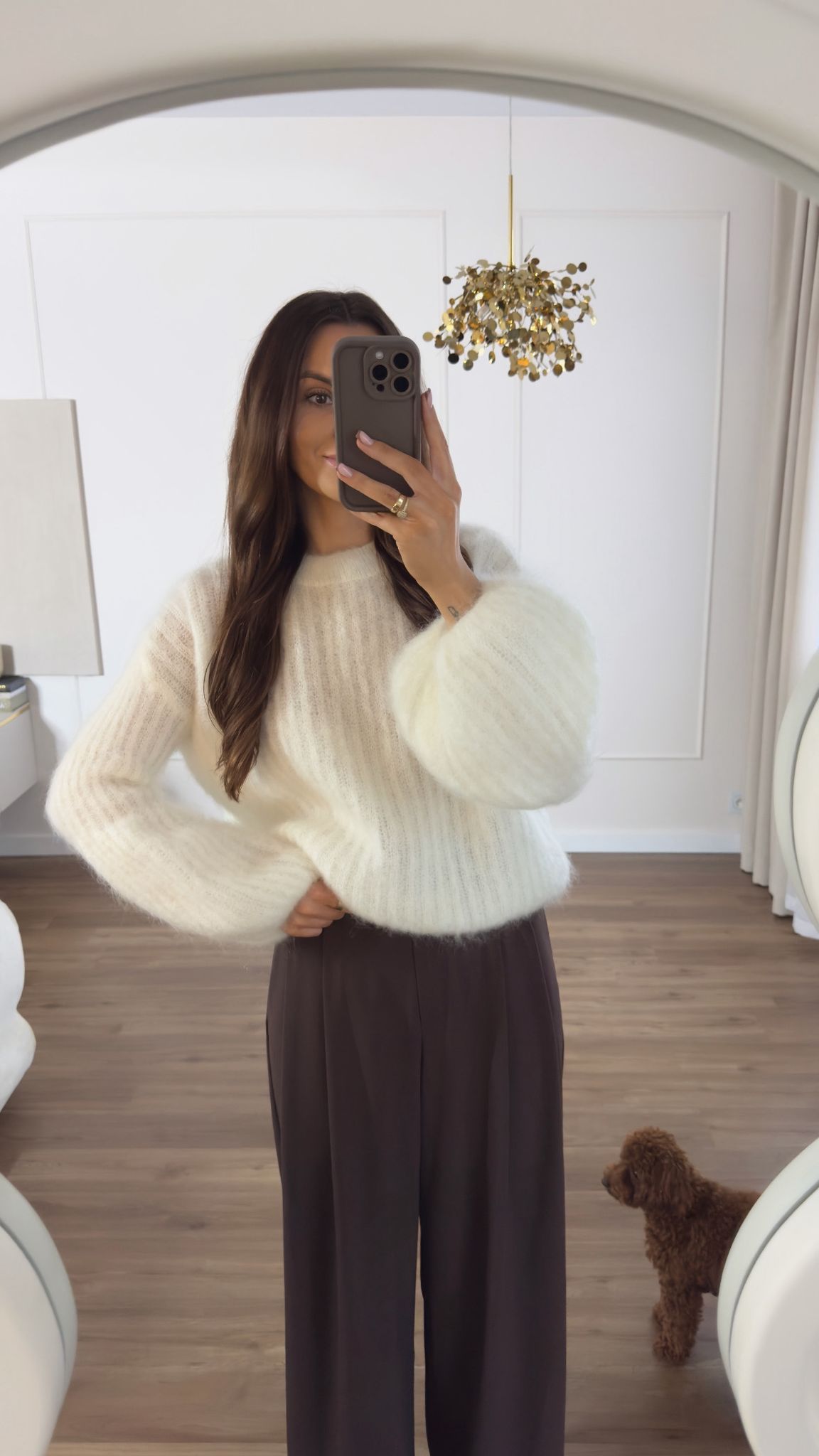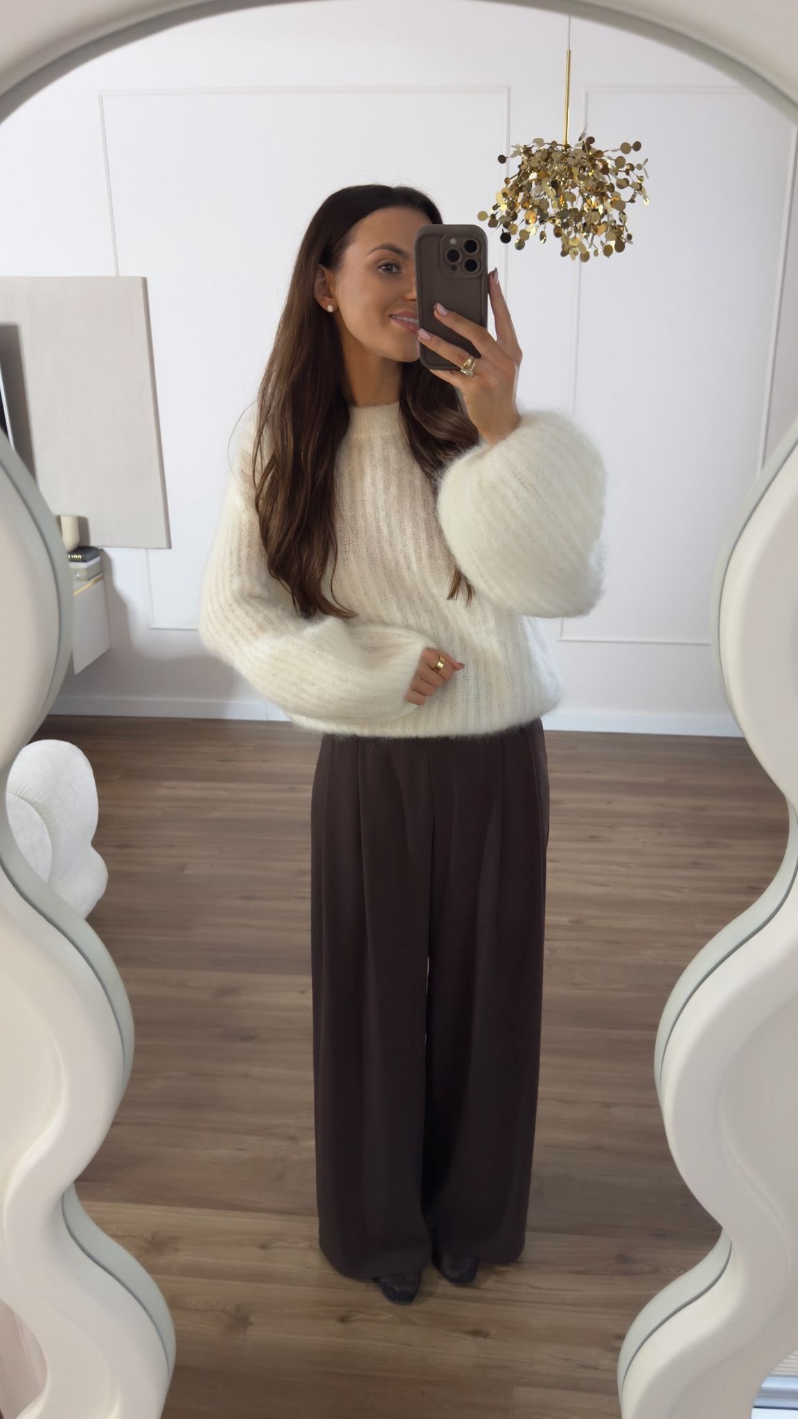 Sweter Super Kid Mohair. Klasyczny dekolt, rozszerzane rękawy, niepowtarzalny krój.