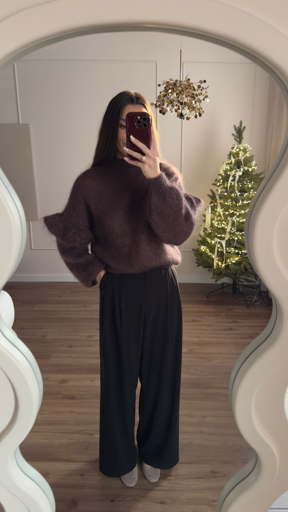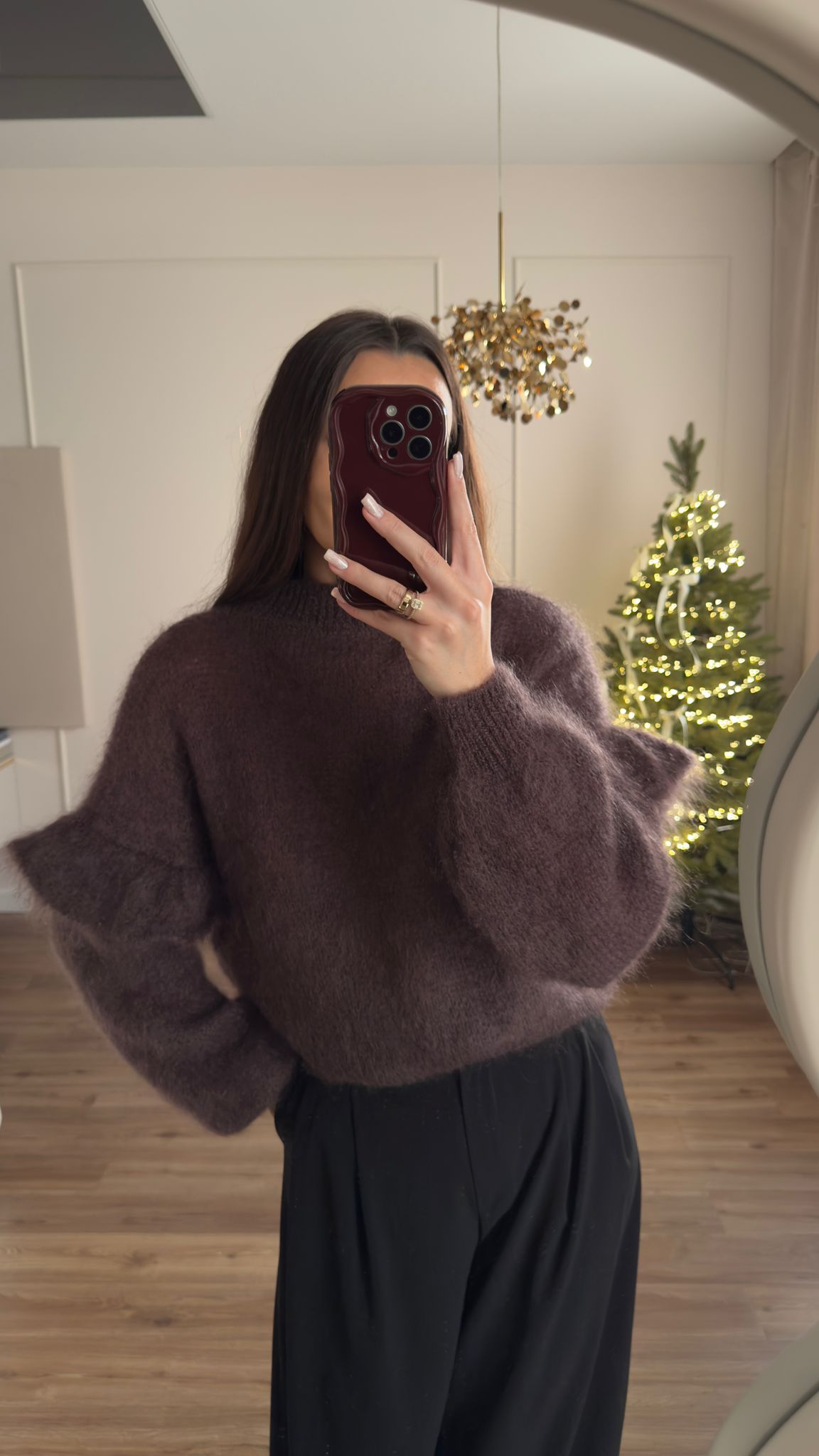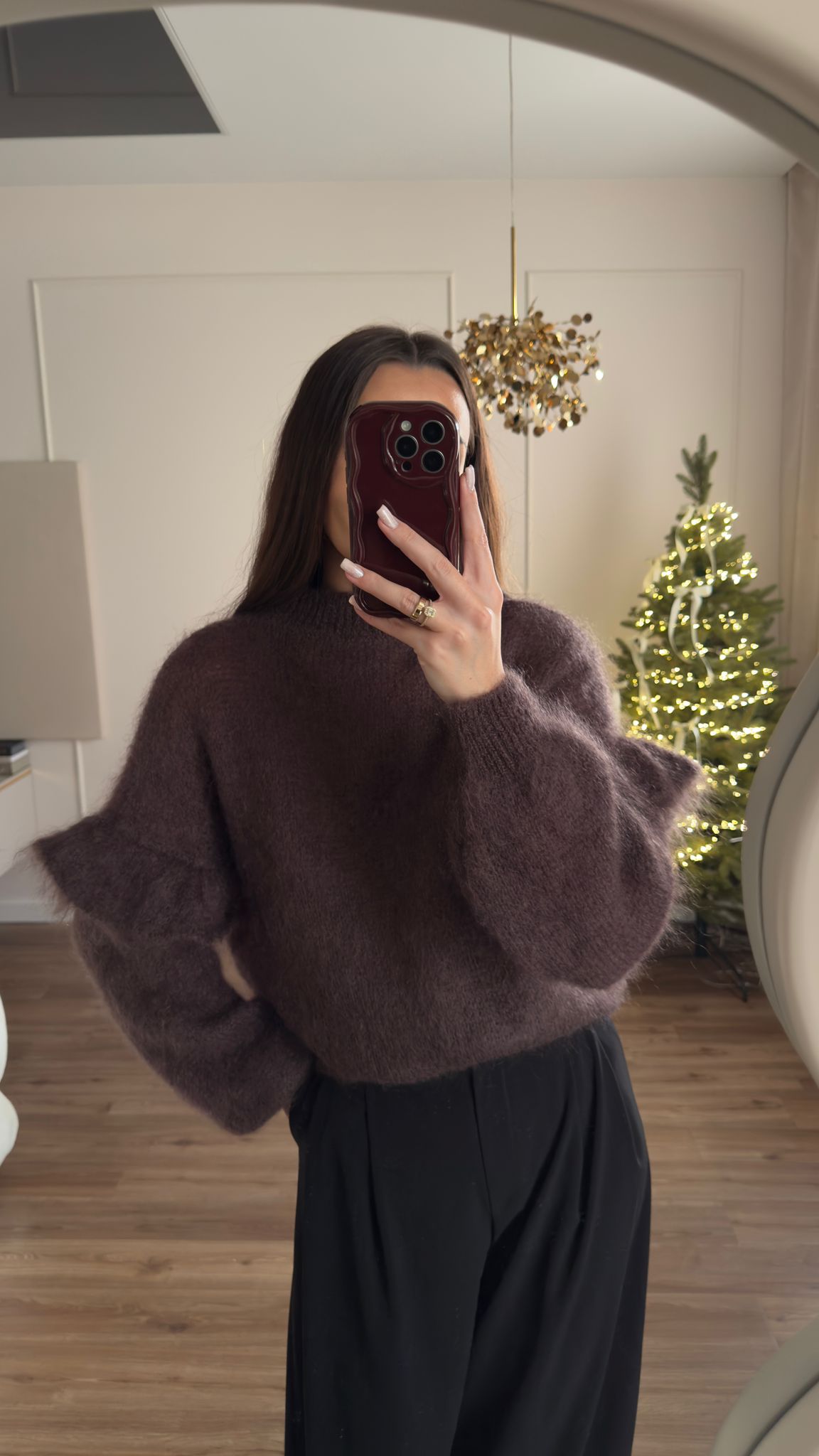 Sweter Kid Mohair. Klasyczny dekolt. Krój oversize. Lekko obniżona linia ramion z falbankami.