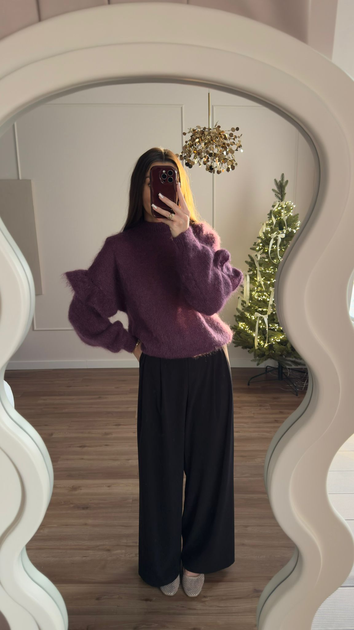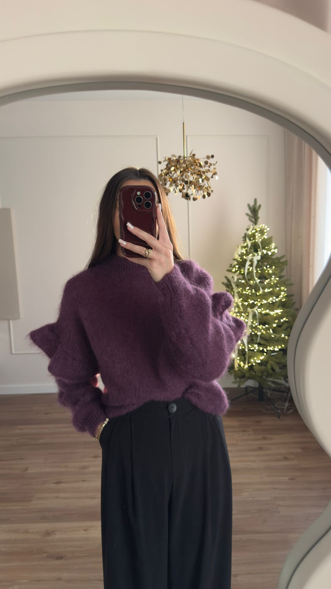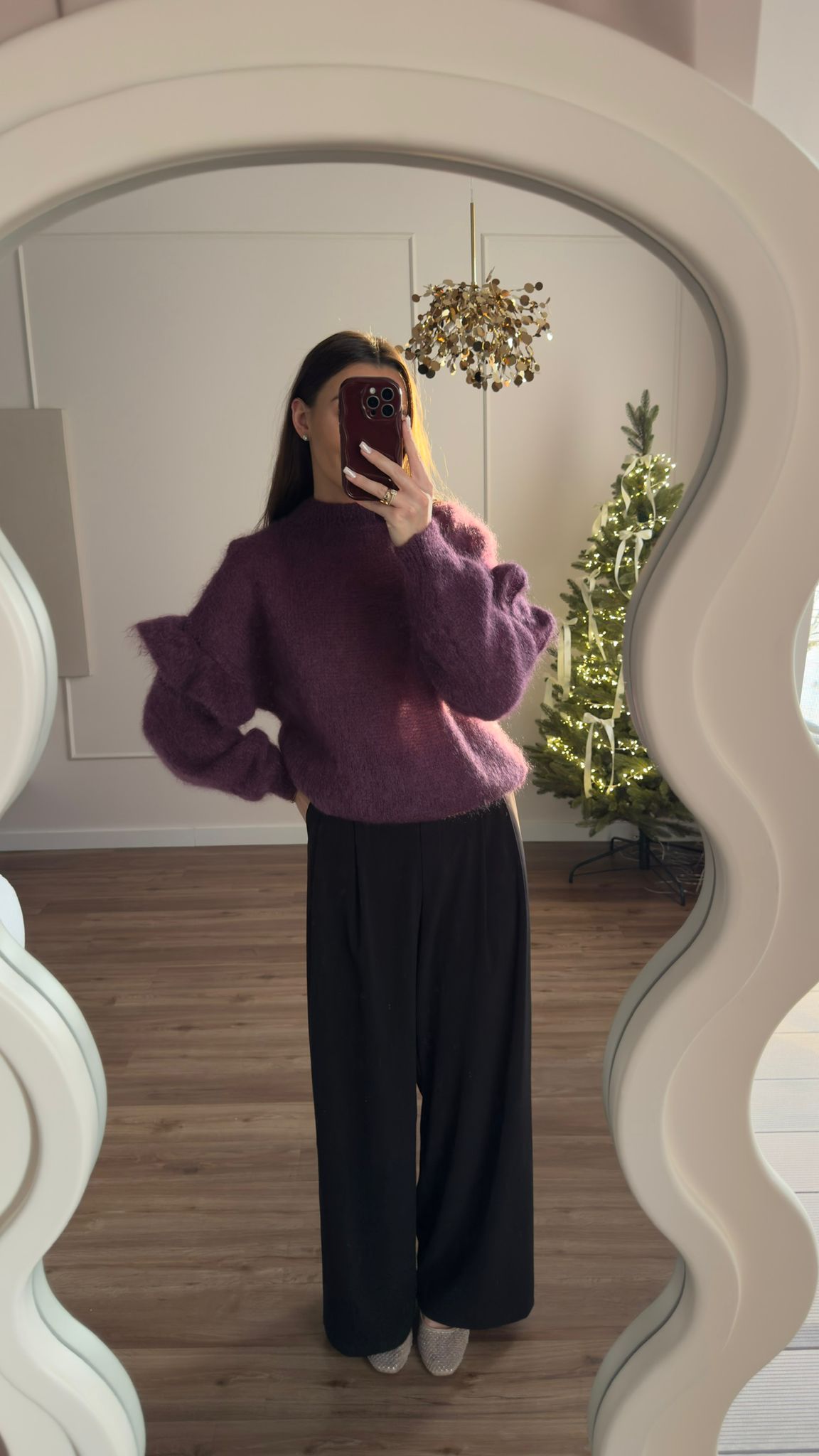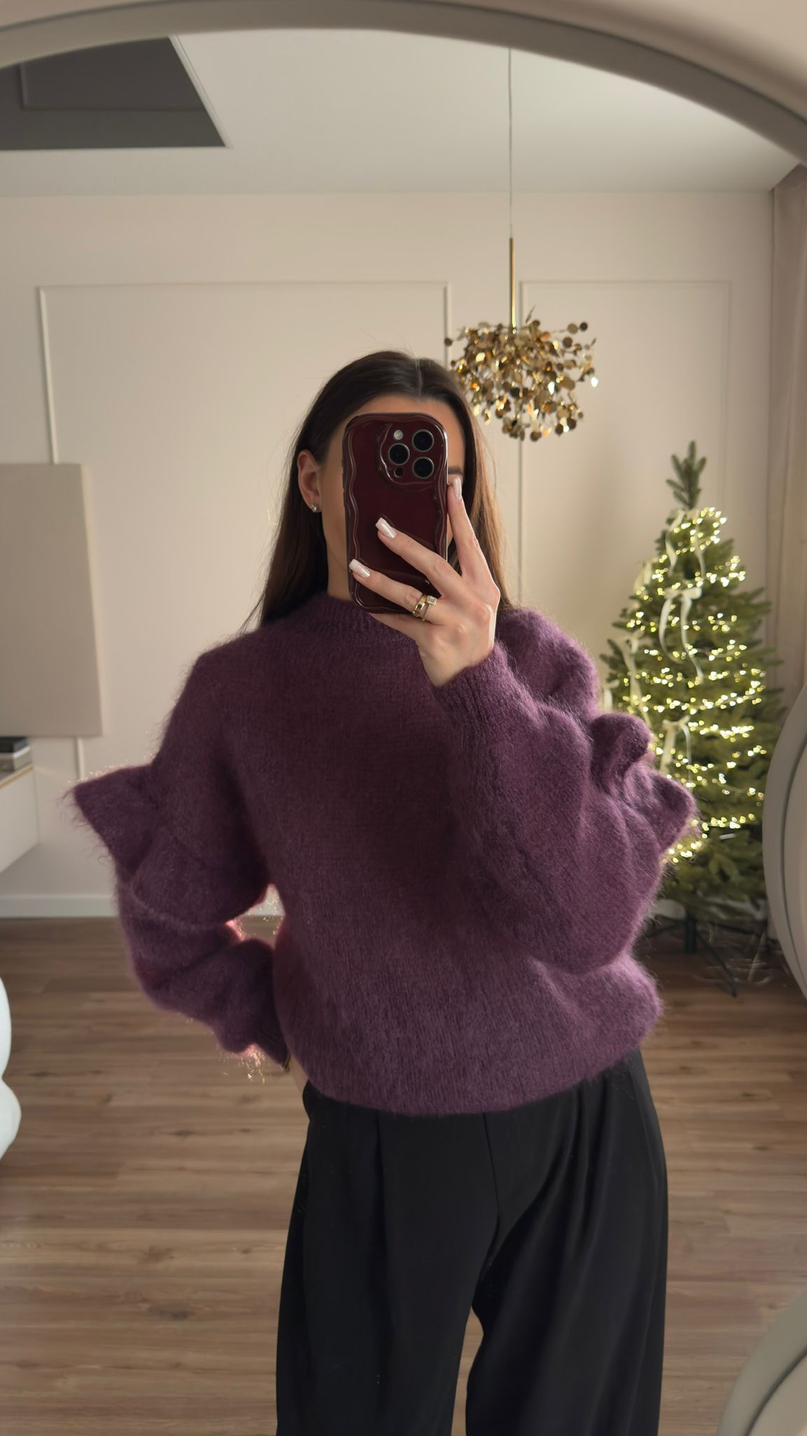 Sweter Kid Mohair. Klasyczny dekolt. Krój oversize. Lekko obniżona linia ramion z falbankami.
