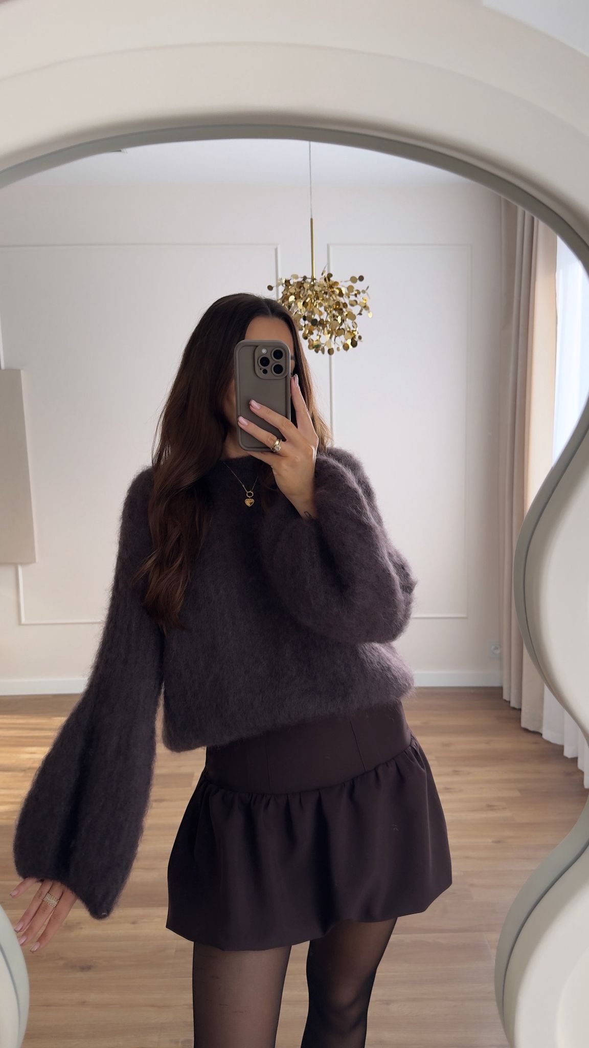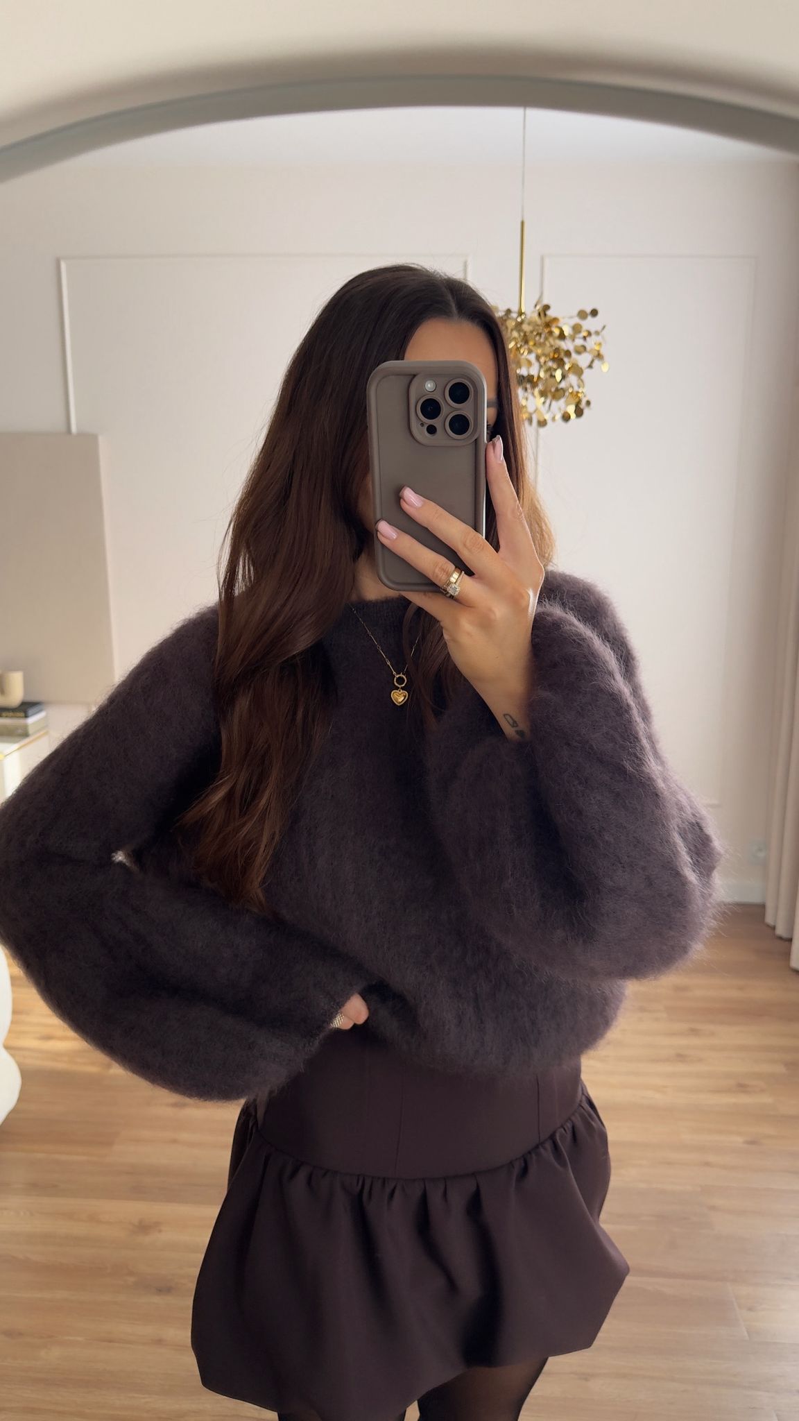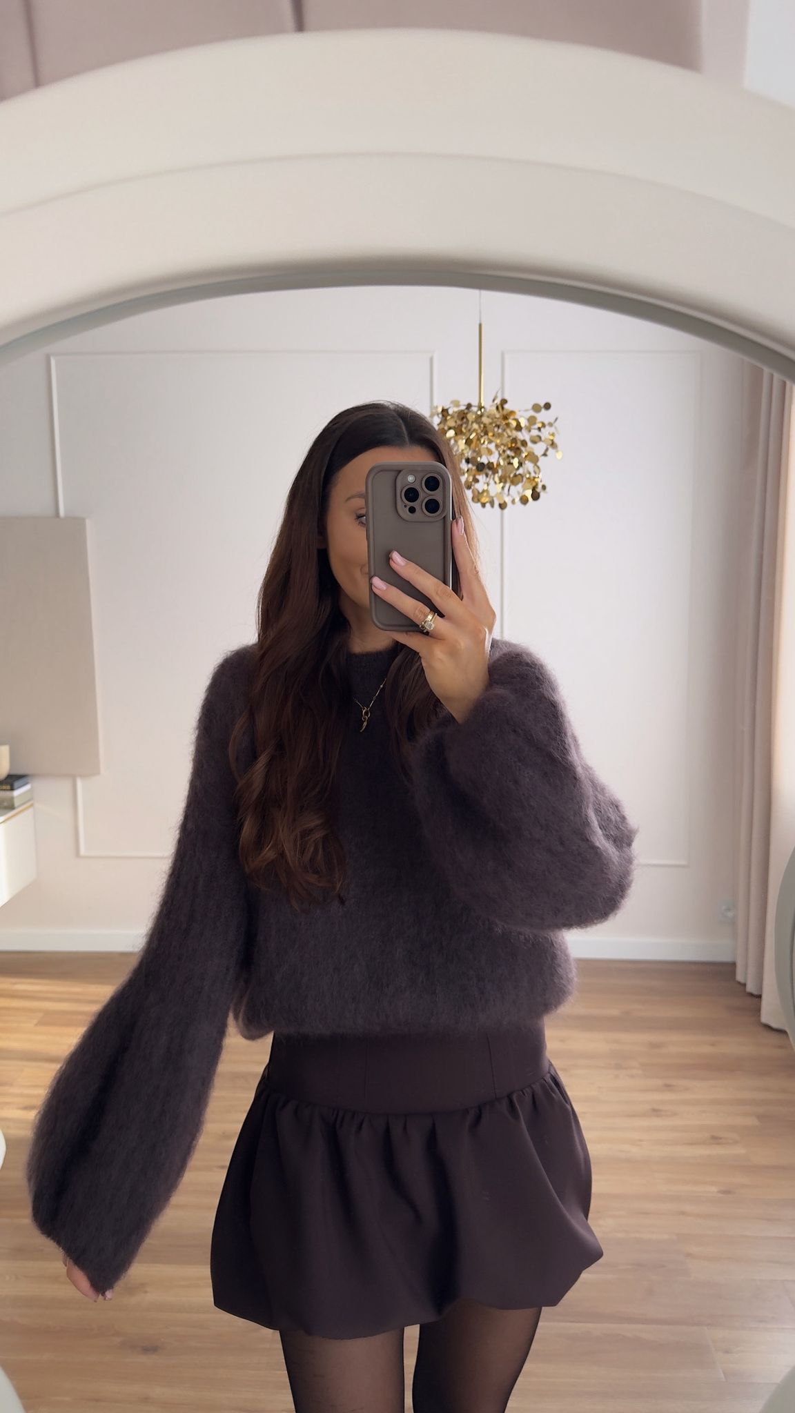 Sweter Super Kid Mohair. Klasyczny dekolt, rozszerzane rękawy, niepowtarzalny krój.