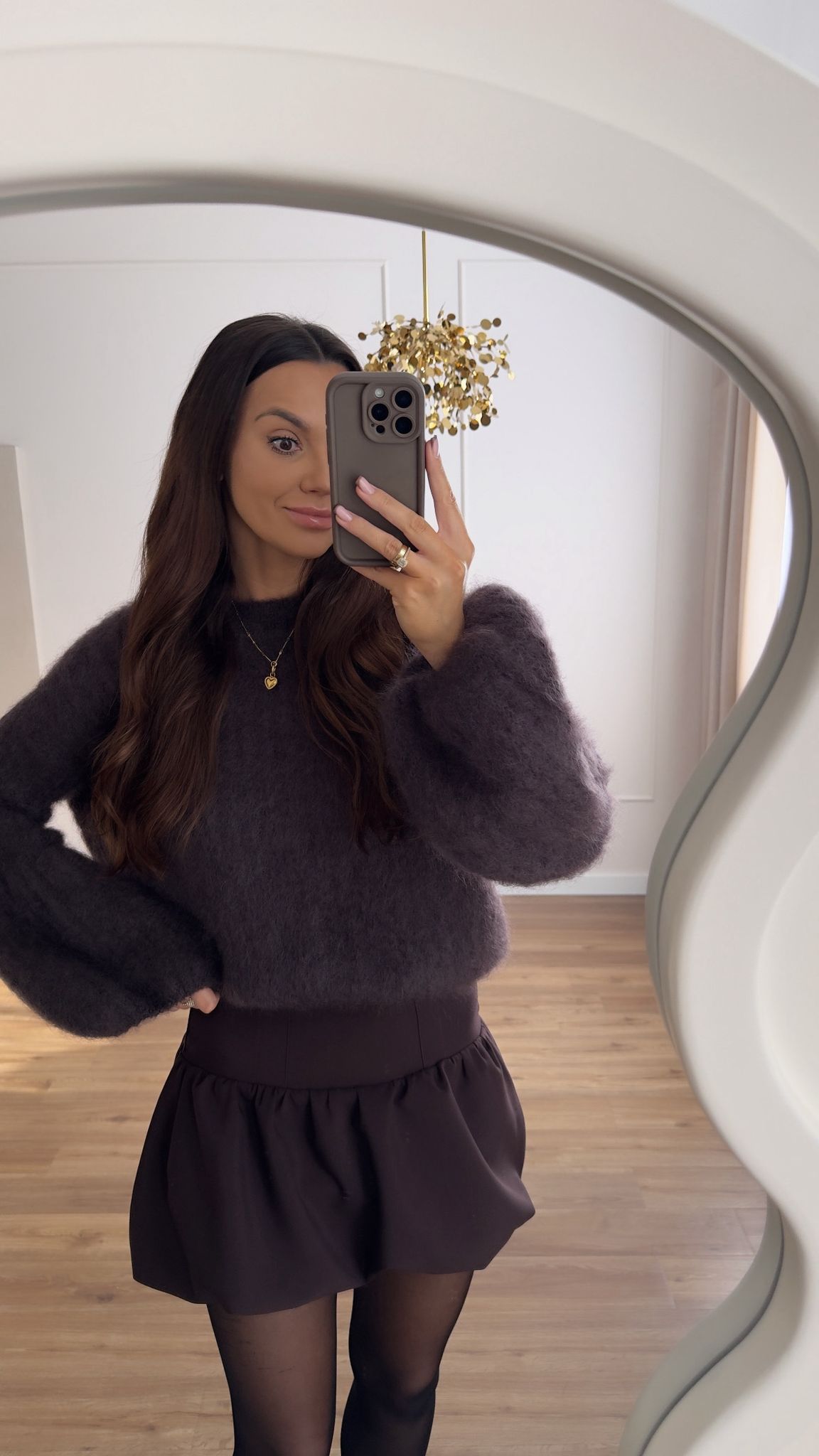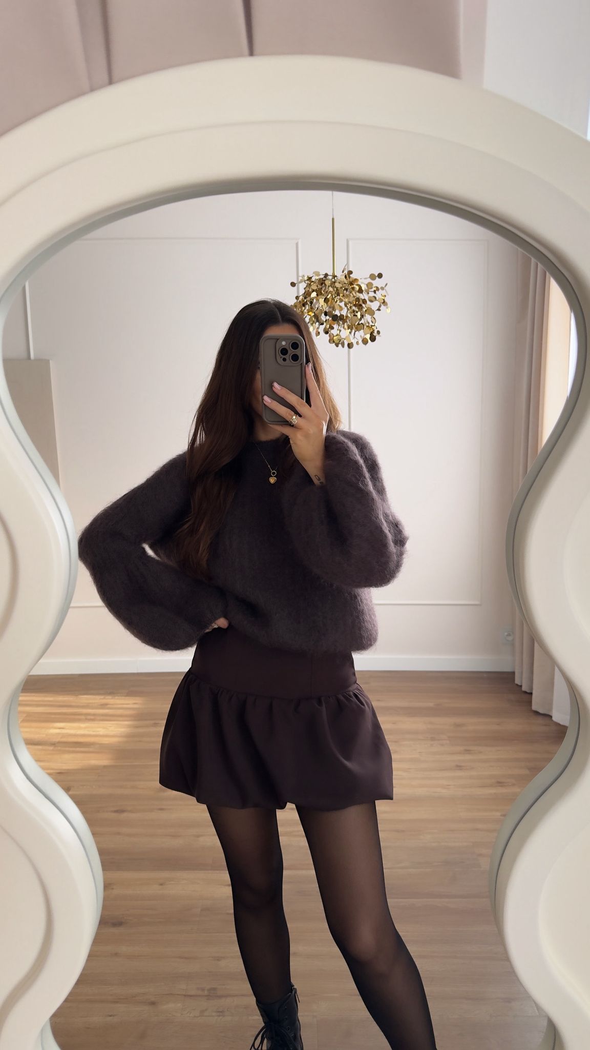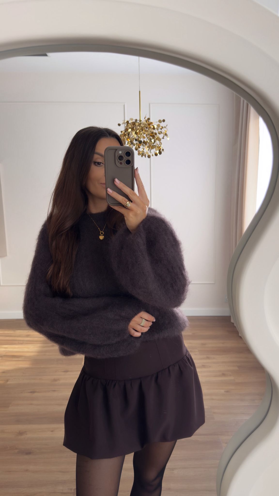 Sweter Super Kid Mohair. Klasyczny dekolt, rozszerzane rękawy, niepowtarzalny krój.