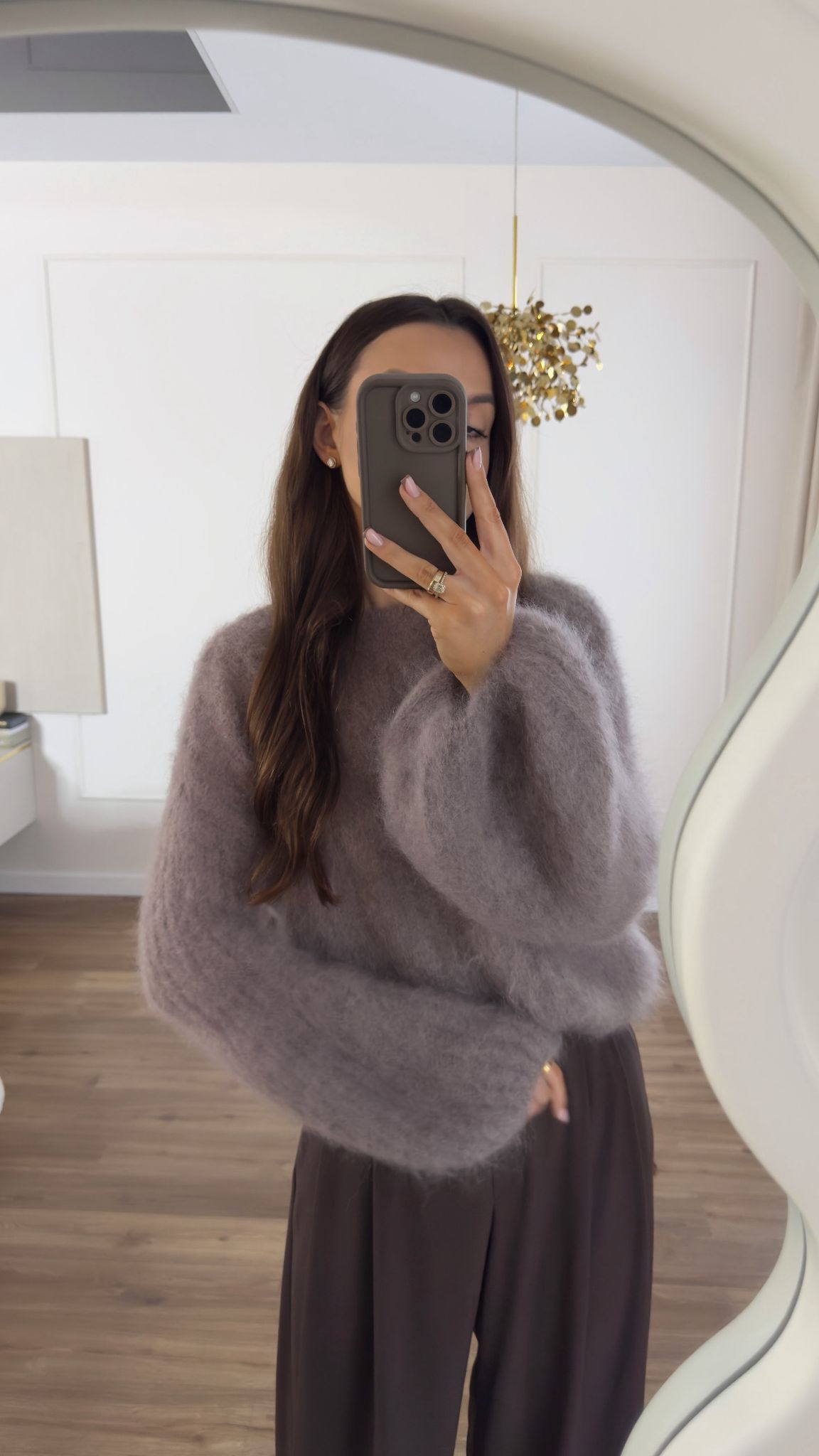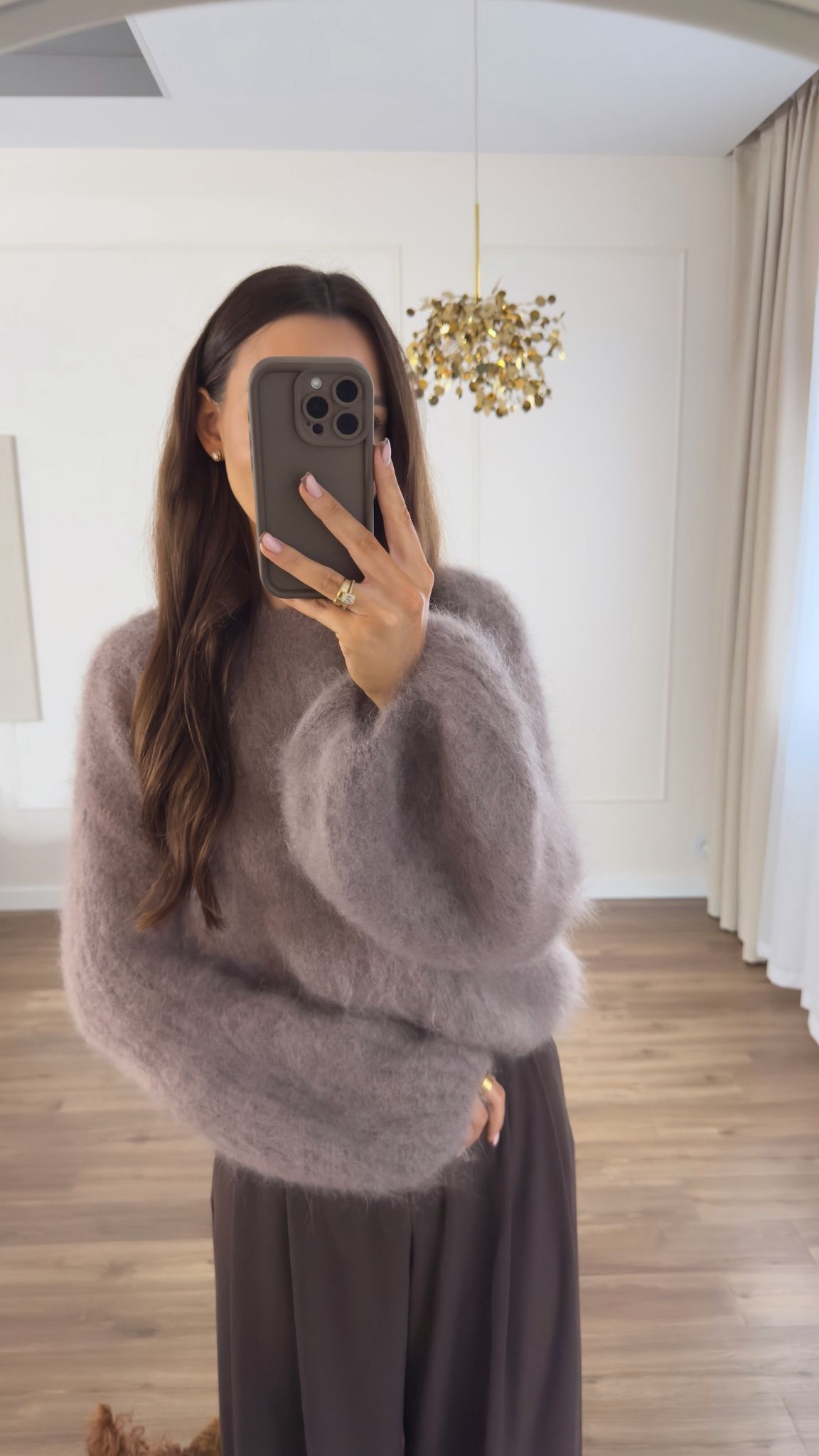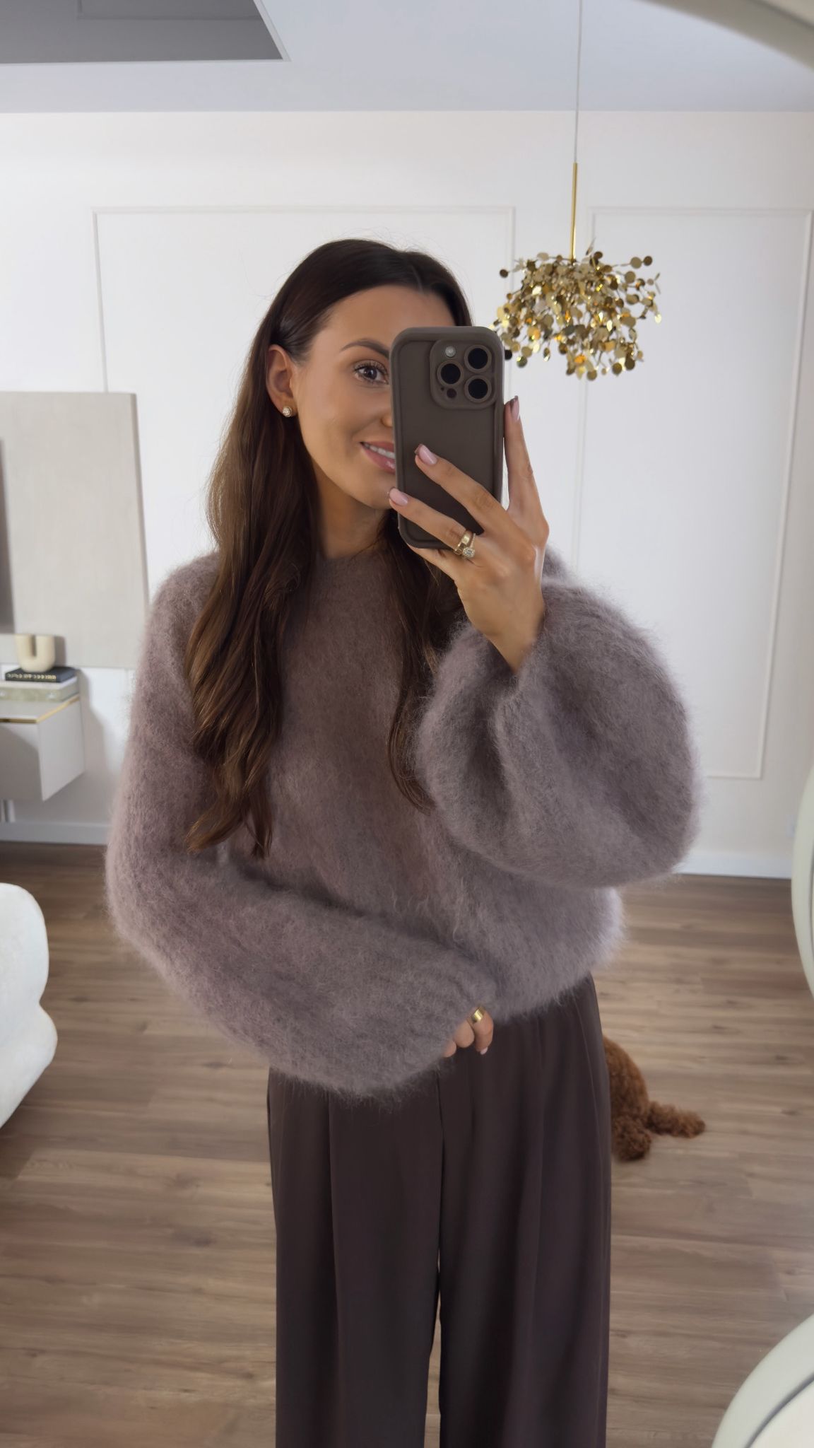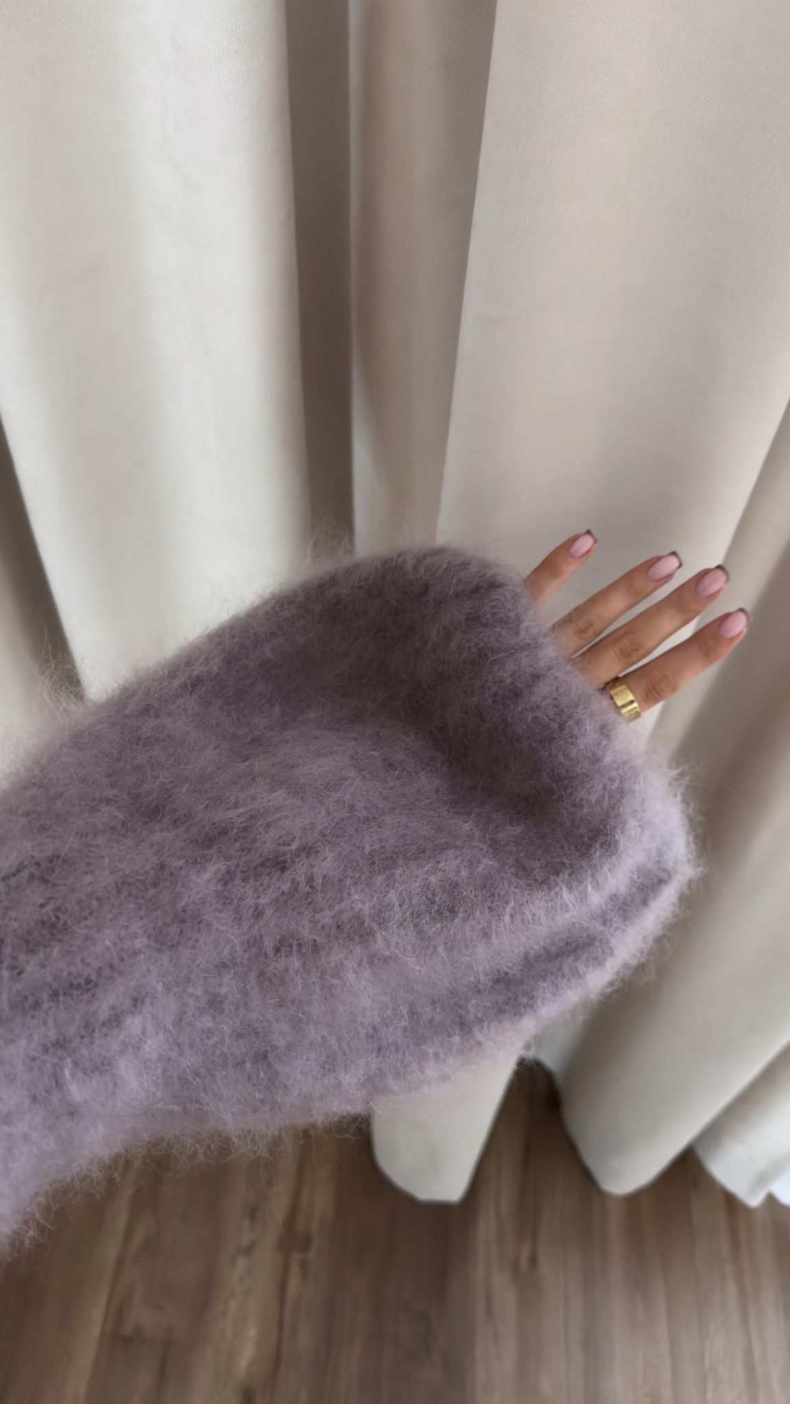 Sweter Super Kid Mohair. Klasyczny dekolt, rozszerzane rękawy, niepowtarzalny krój.
