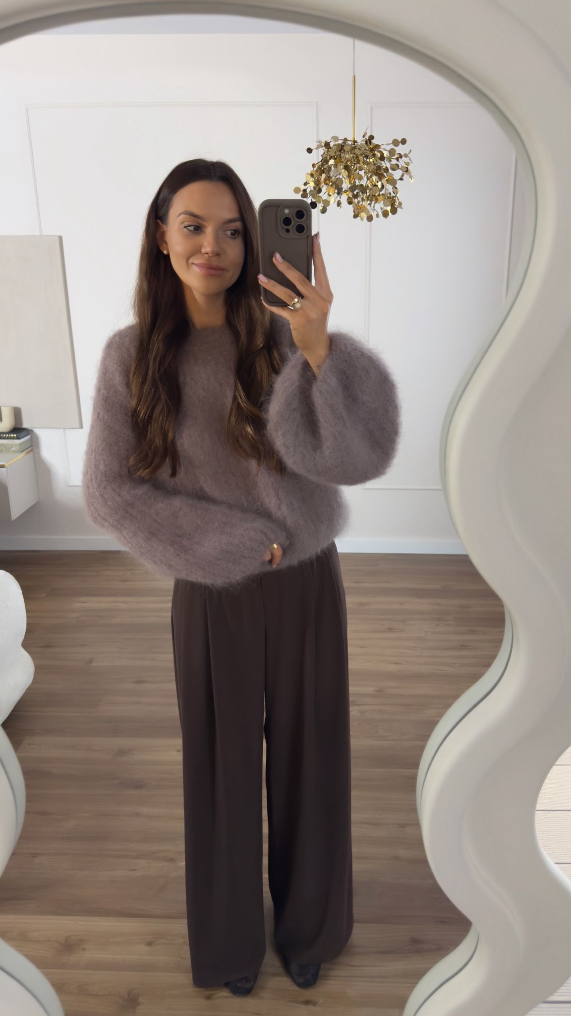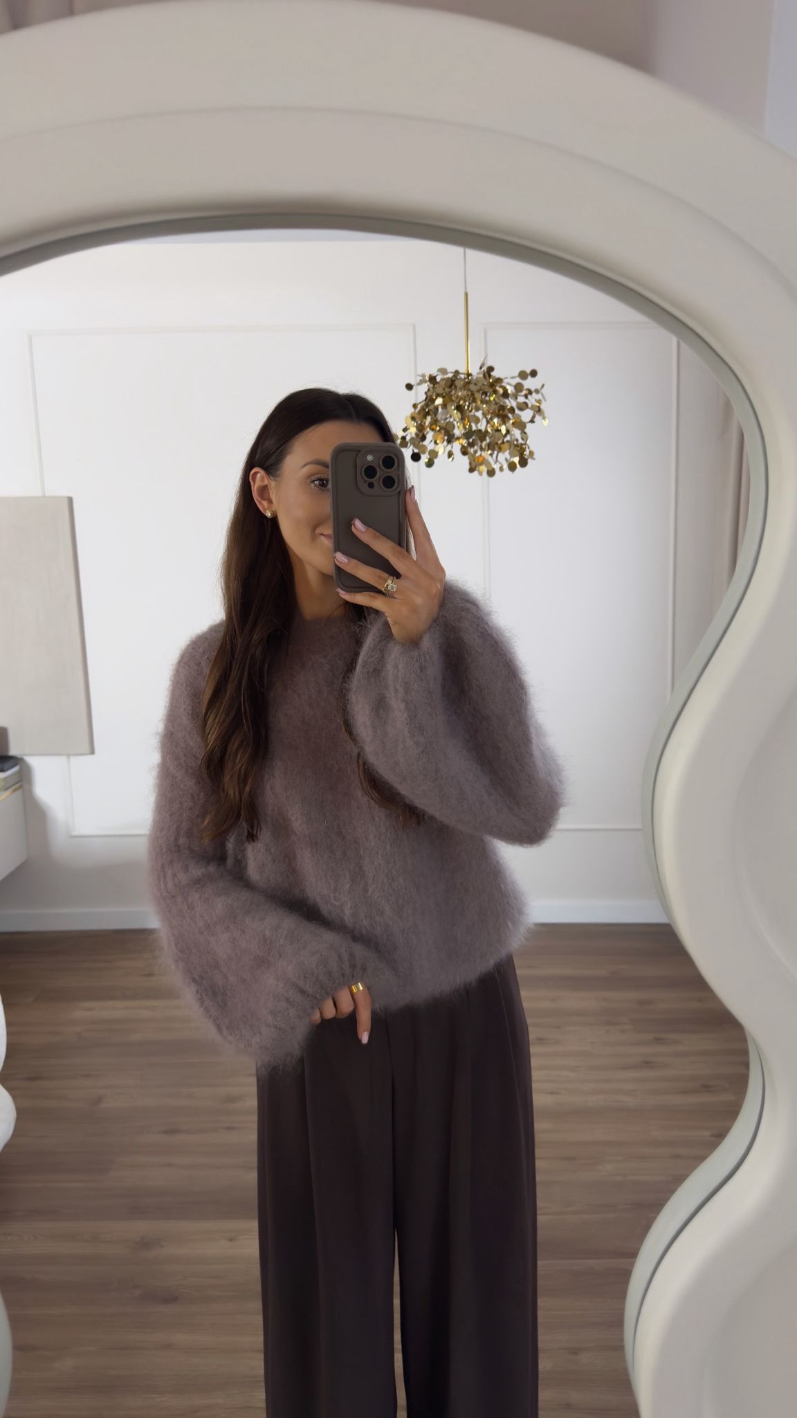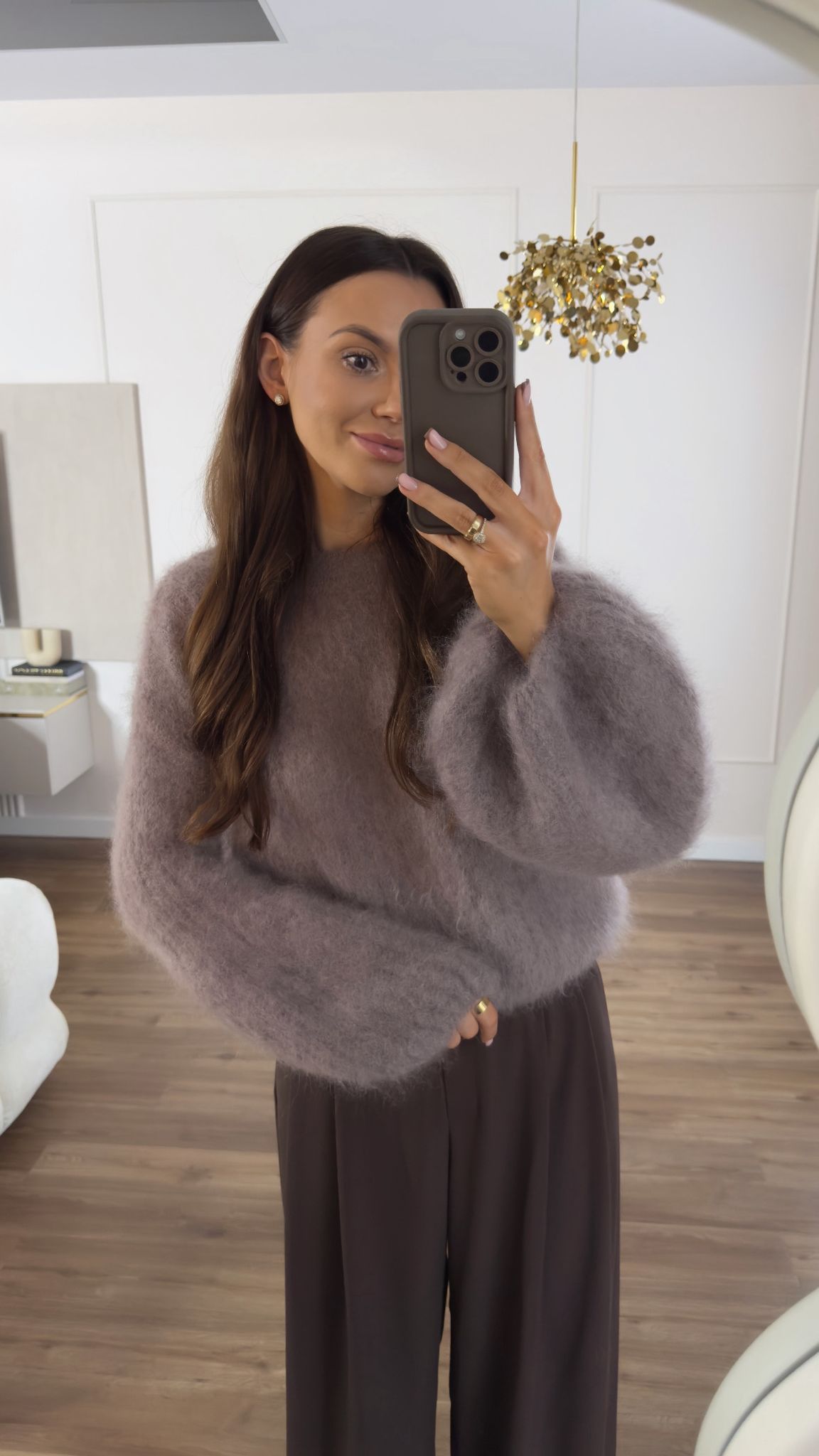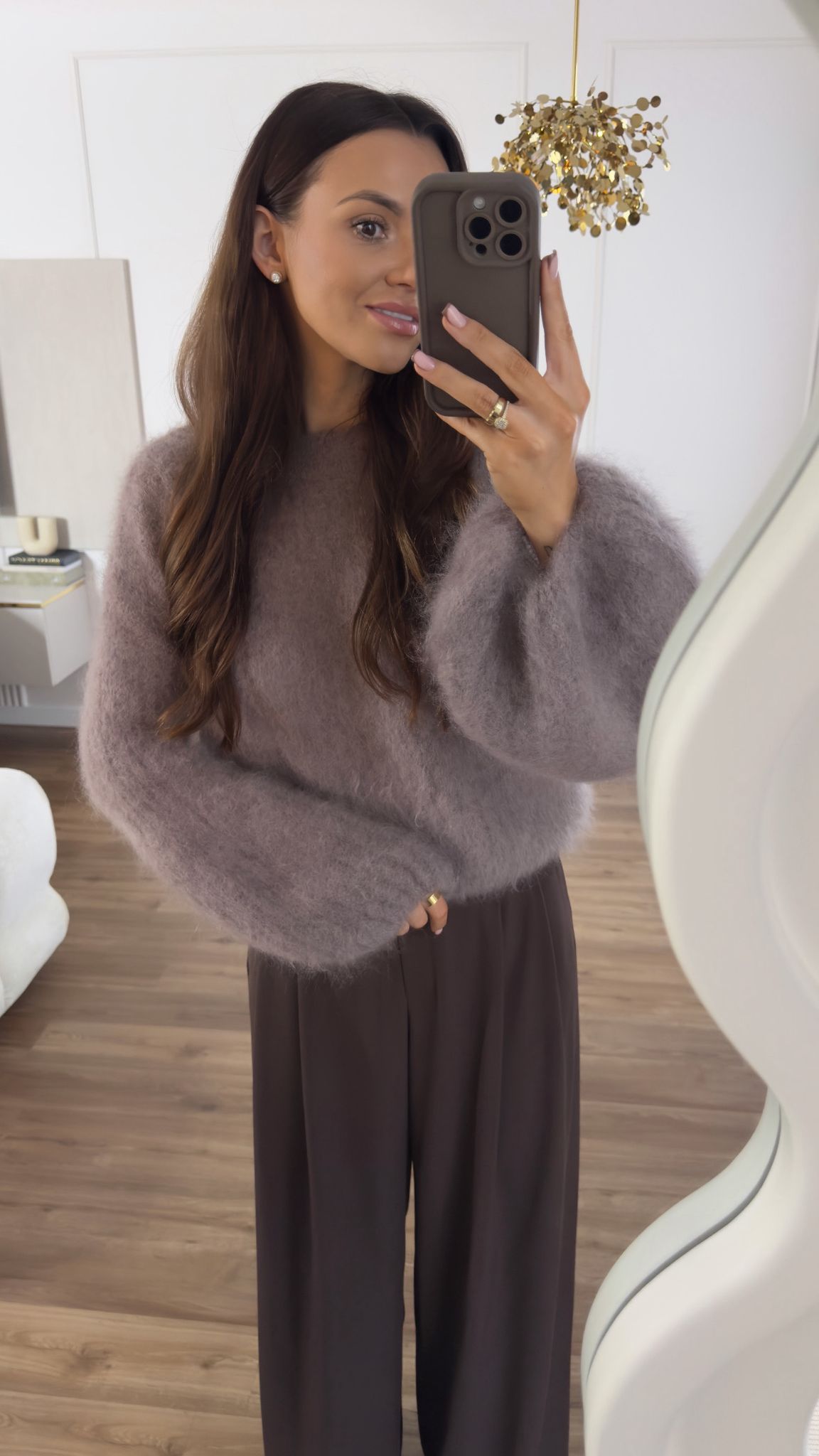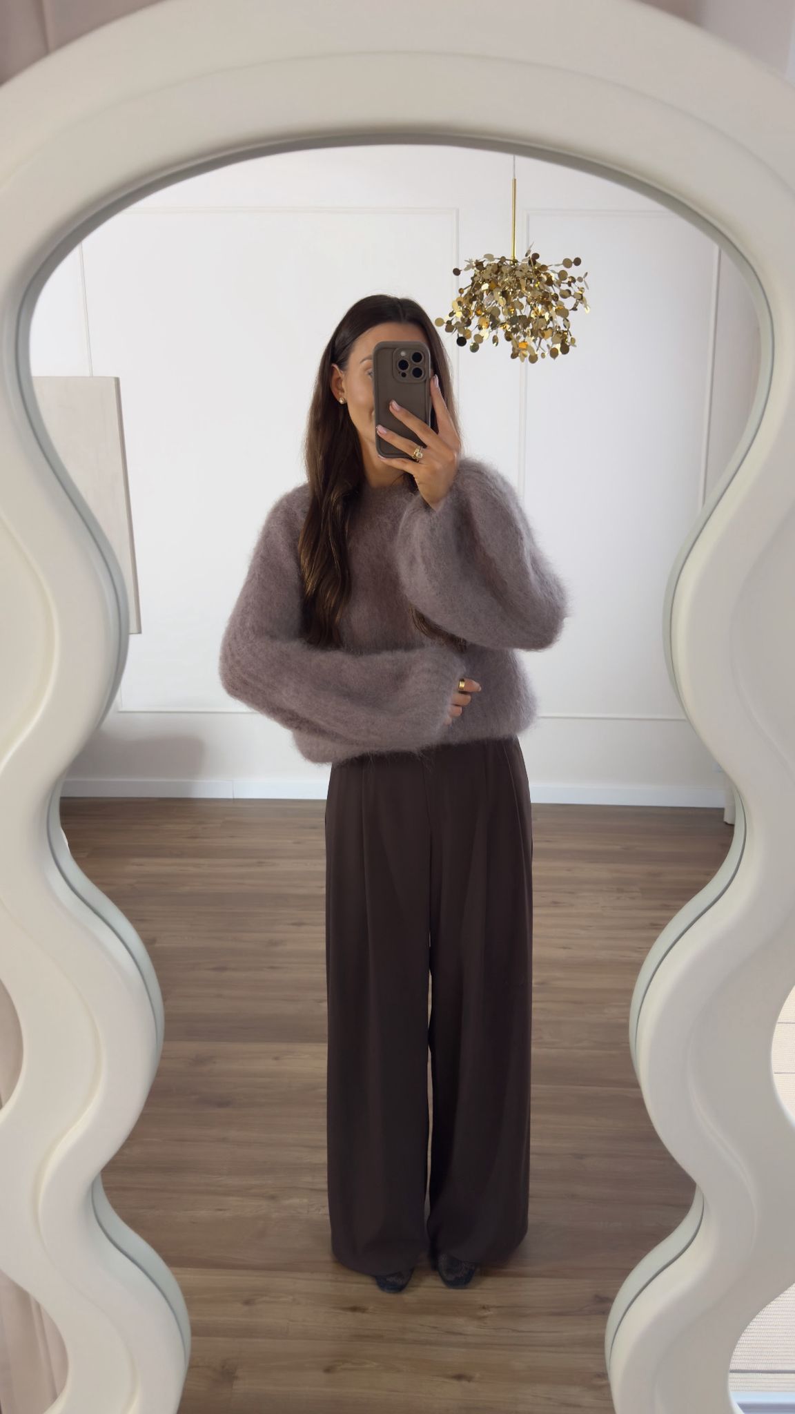 Sweter Super Kid Mohair. Klasyczny dekolt, rozszerzane rękawy, niepowtarzalny krój.