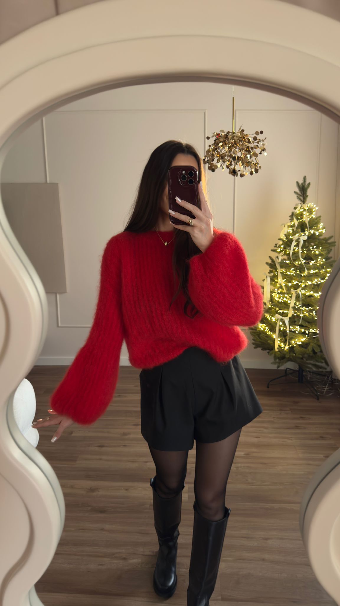 Sweter Super Kid Mohair. Klasyczny dekolt, rozszerzane rękawy, niepowtarzalny krój.