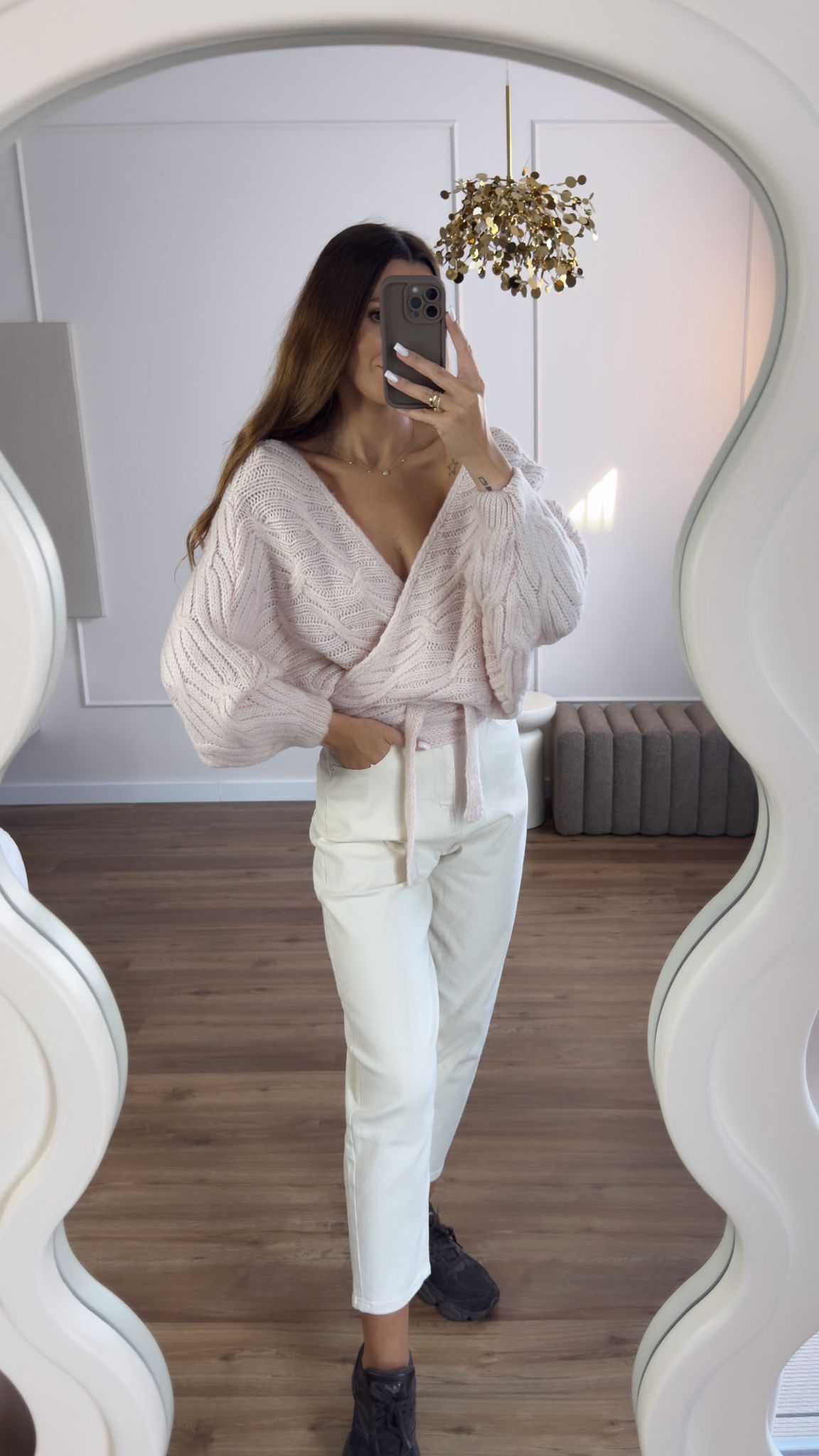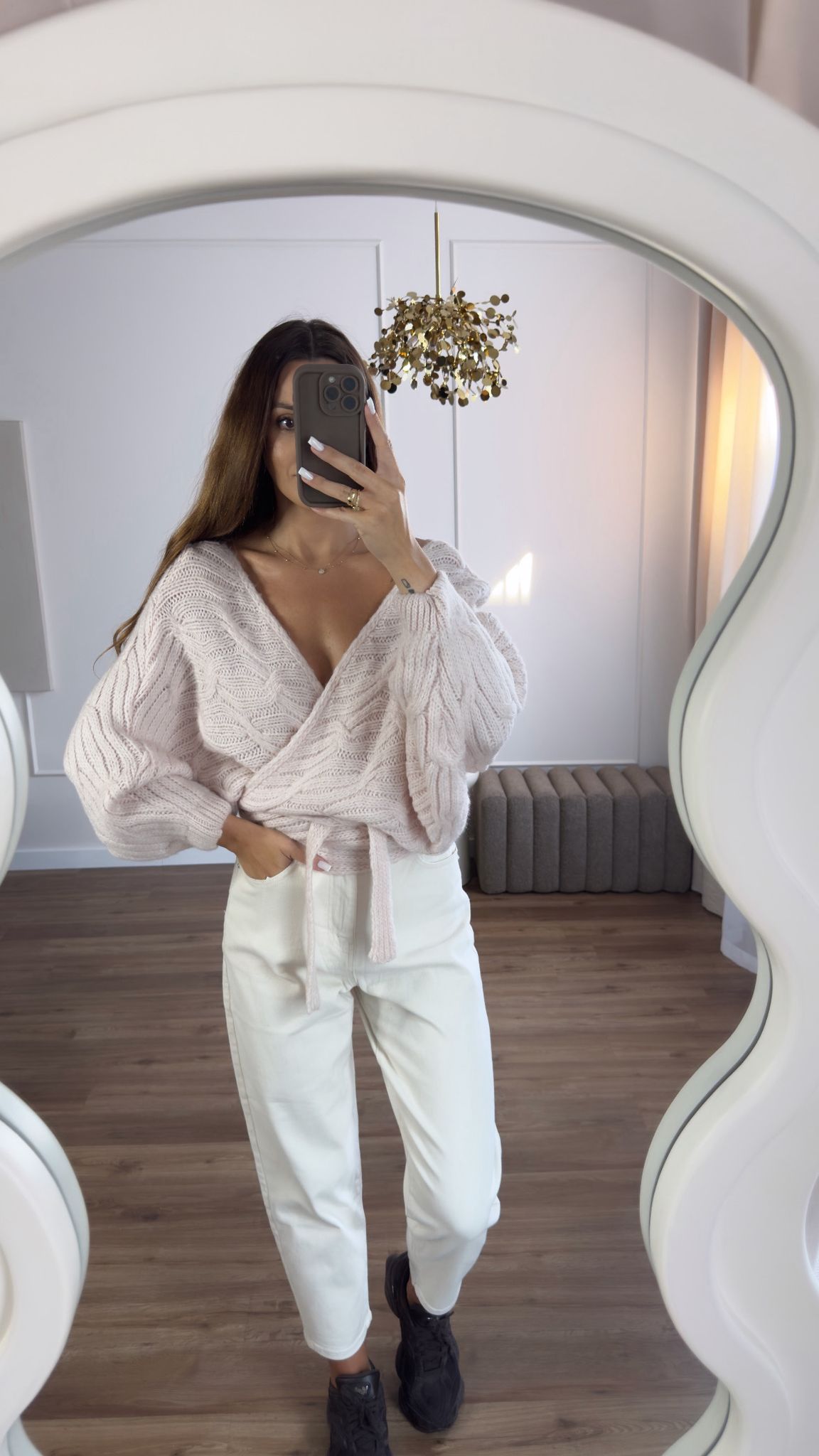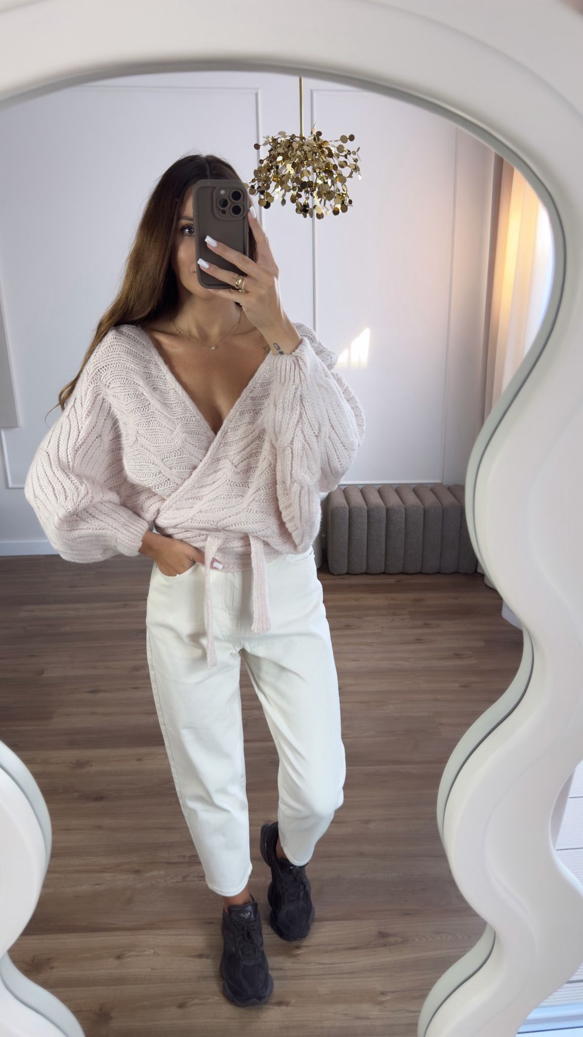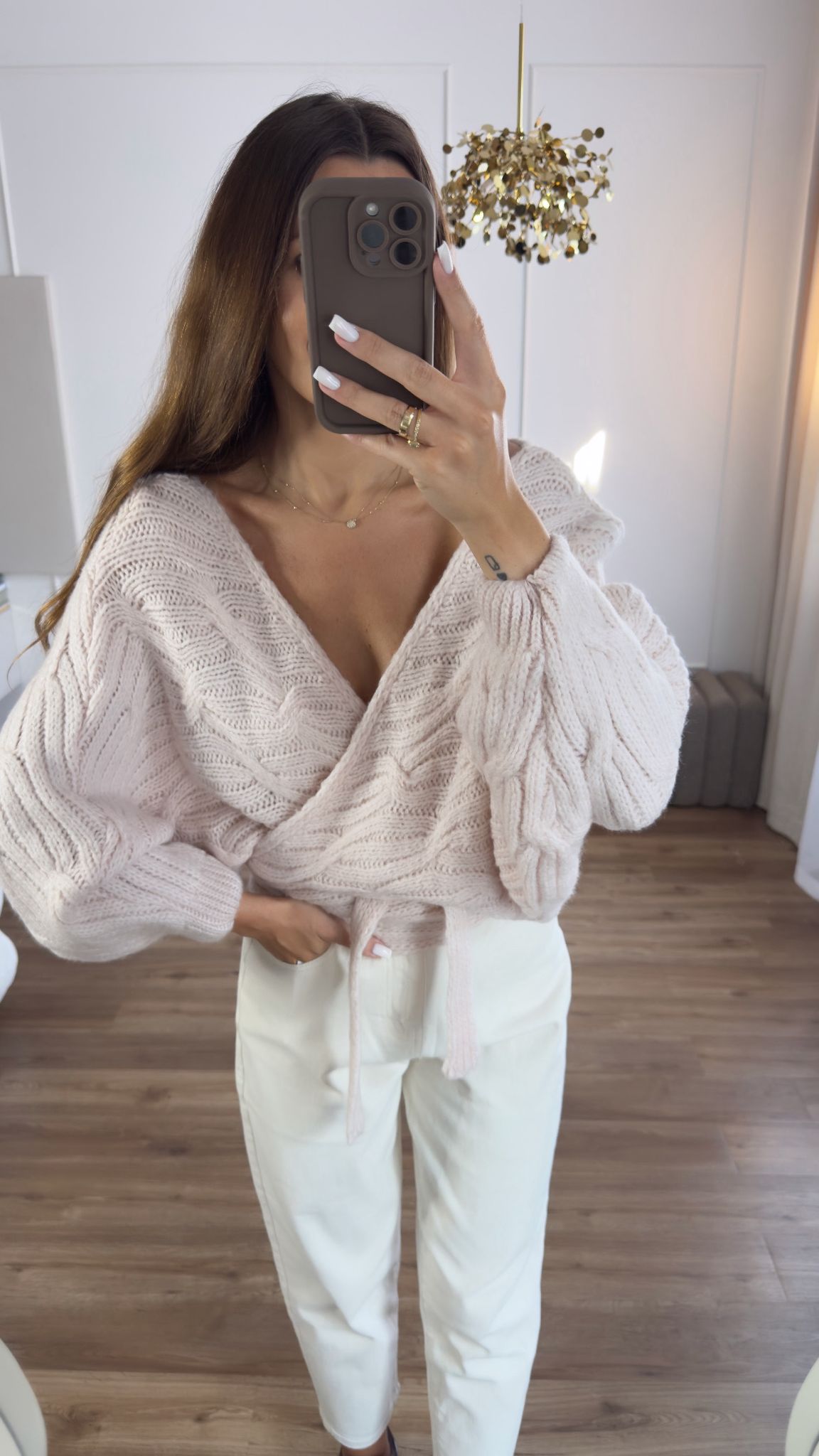 Sweter z wiązaniem – możliwość zawiązania na kilka sposobów bądź założenia z dekoltem na plecach.