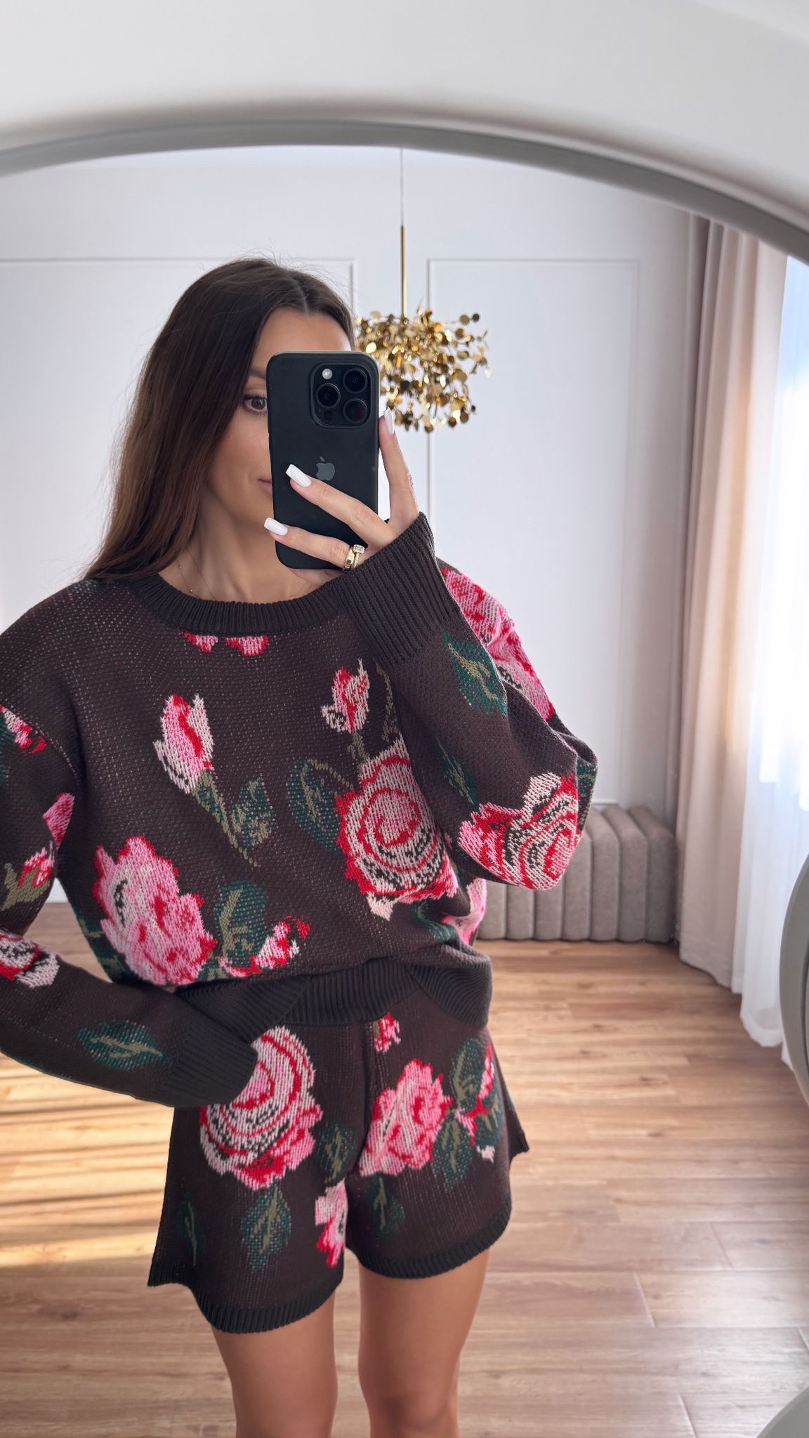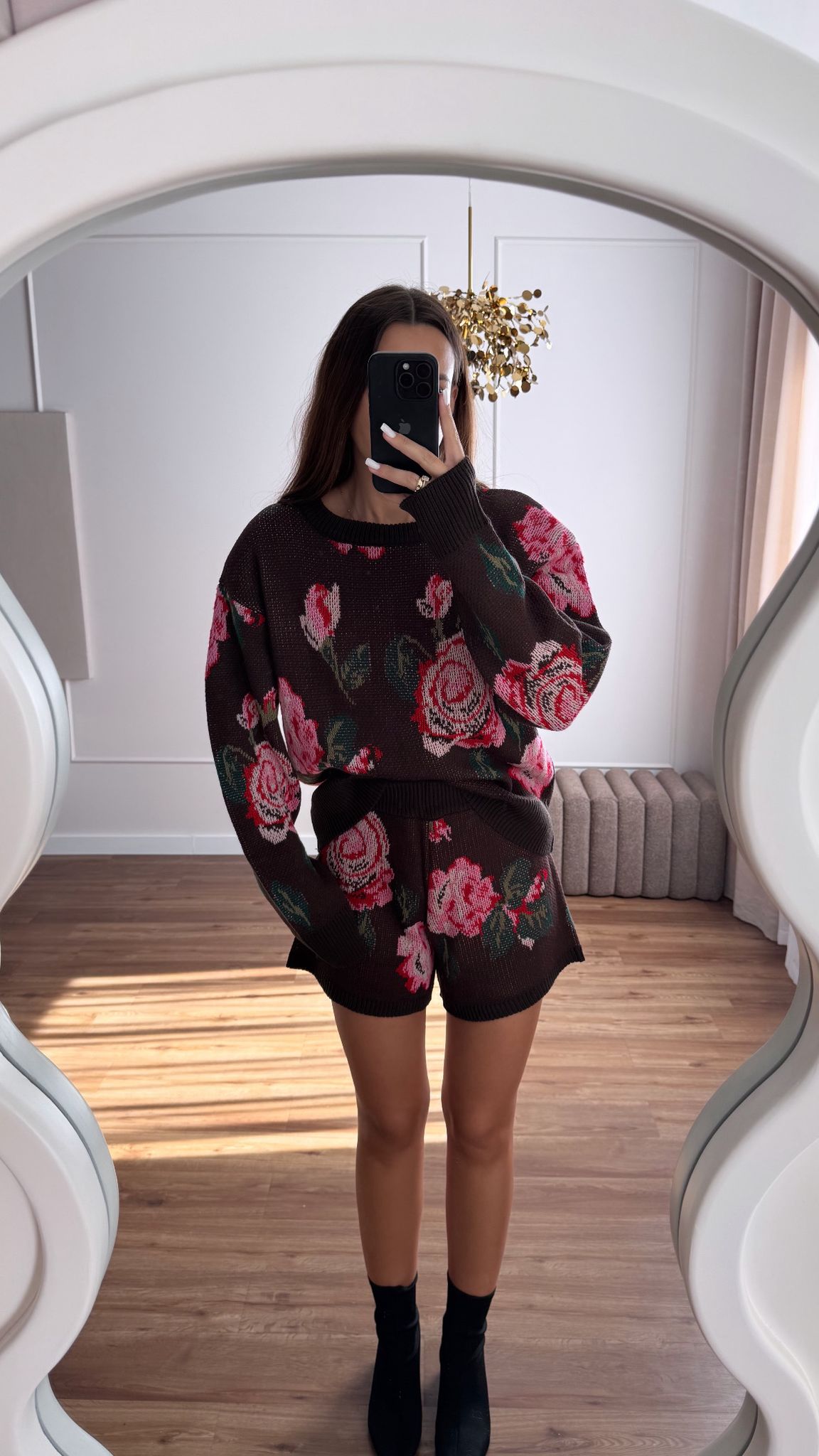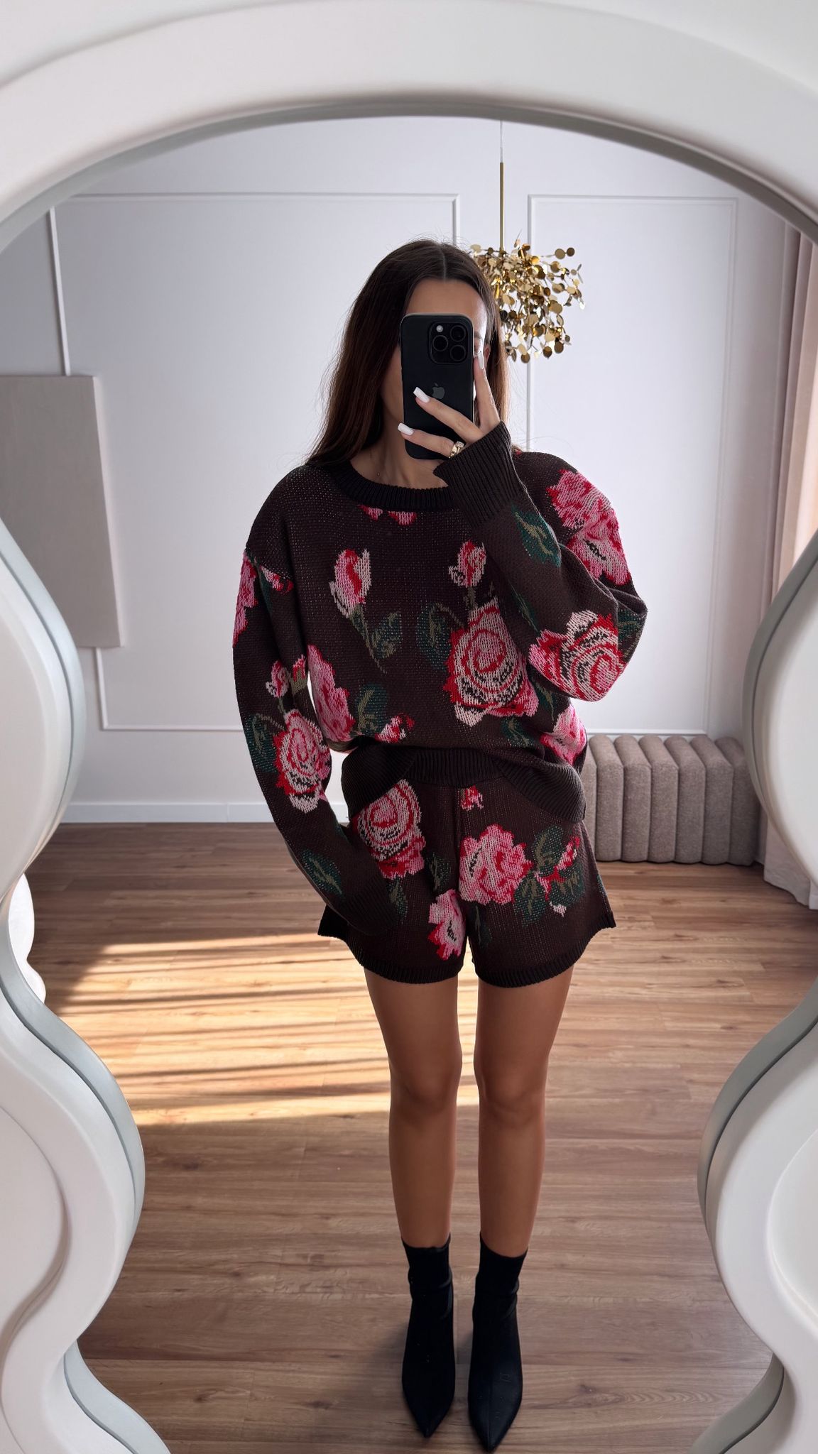 Sweterkowy komplet w kolorze czekoladowym/brązowym w kwiaty. Komplet składa się ze swetra i szortów. Sweter posiada poduszki ona ramionach, które łatwo można wyjąć.