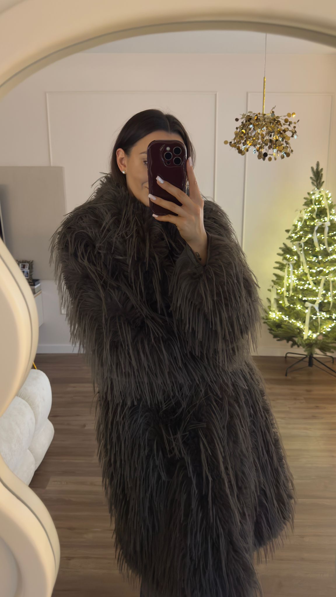 Sztuczne, długie futro. Krój oversize. Miękkie włoski różnej długości. Czekoladowy kolor. zapięcie na haftki. Posiada kieszenie z boku. Podszewka.