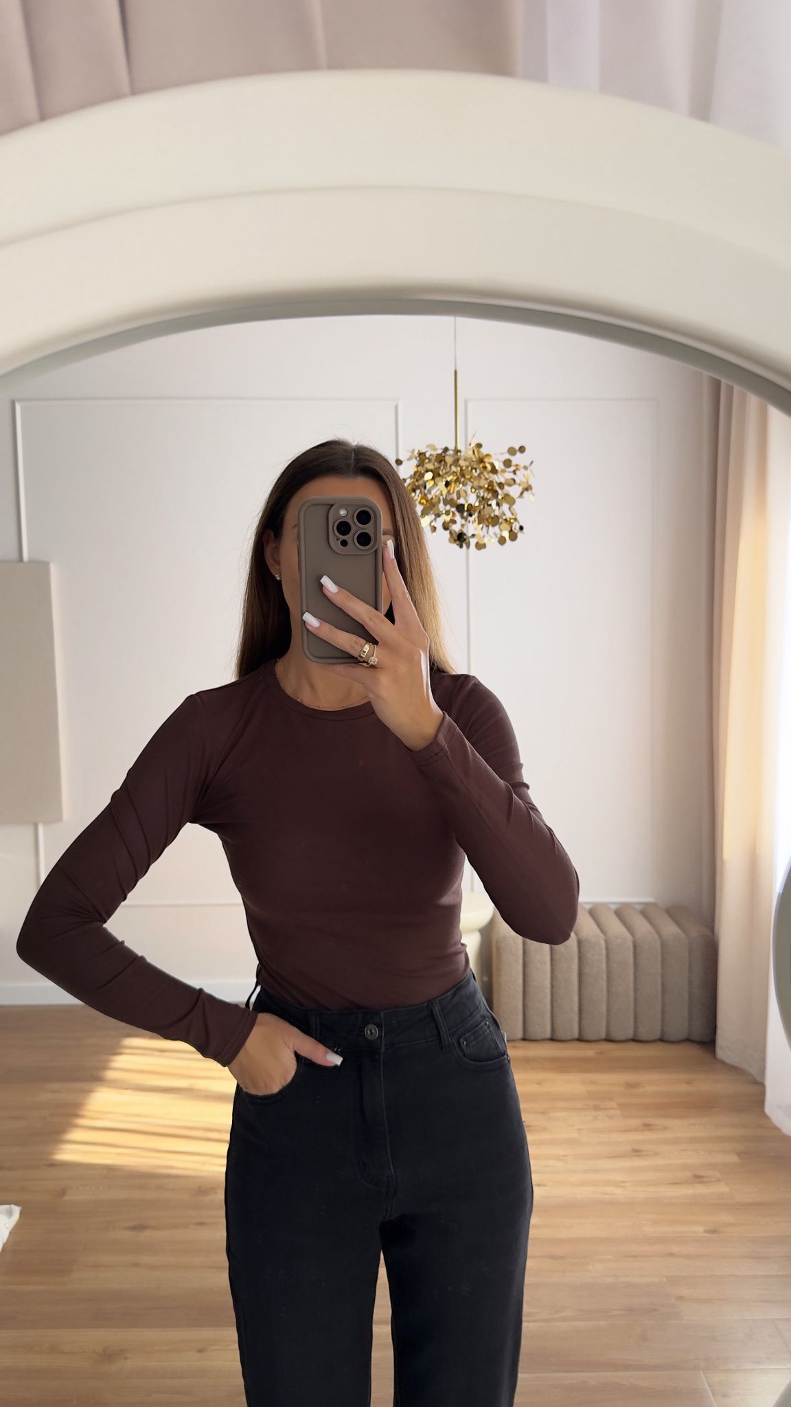 Klasyczny, dopasowany t-shirt na długi rękaw z dekoltem pod szyję. Idealna baza do wielu do stylizacji.