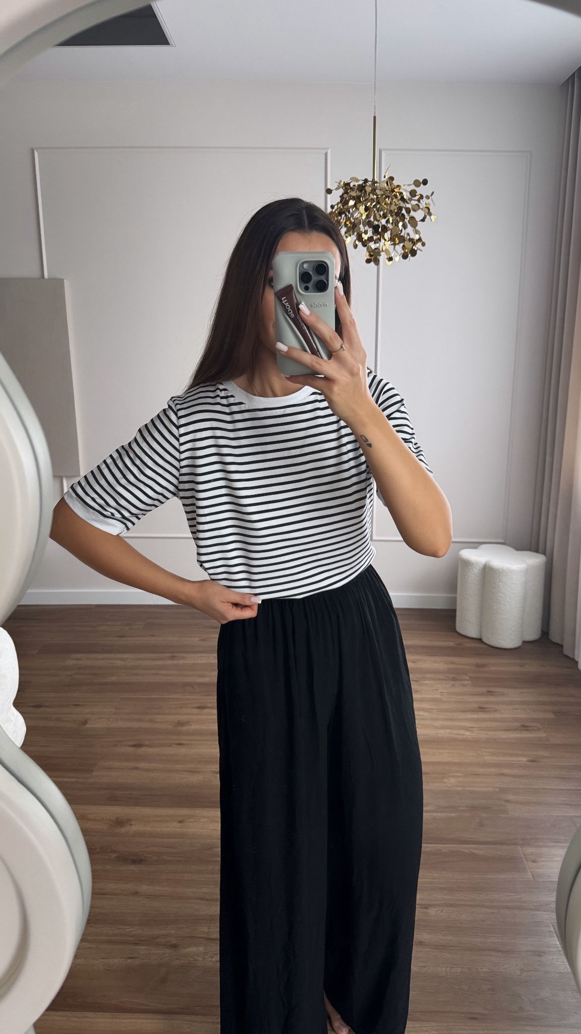 Uniwersalny wzór w paski dodaje stylizacji świeżości i lekkości, idealnie komponując się z jeansami, spódnicą czy szortami. To niezawodna baza codziennych outfitów – wygodna, przewiewna i zawsze modna.